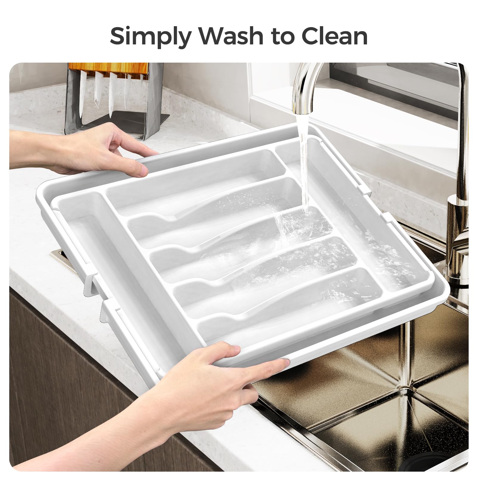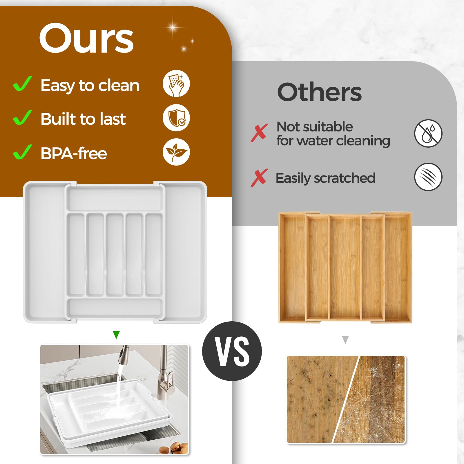 【Adjustable Size】:The width of the utensil drawer organizer expands from 12.4" to 21", perfectly fitting most standard drawers. (Measure your drawer before buying for the best fit).