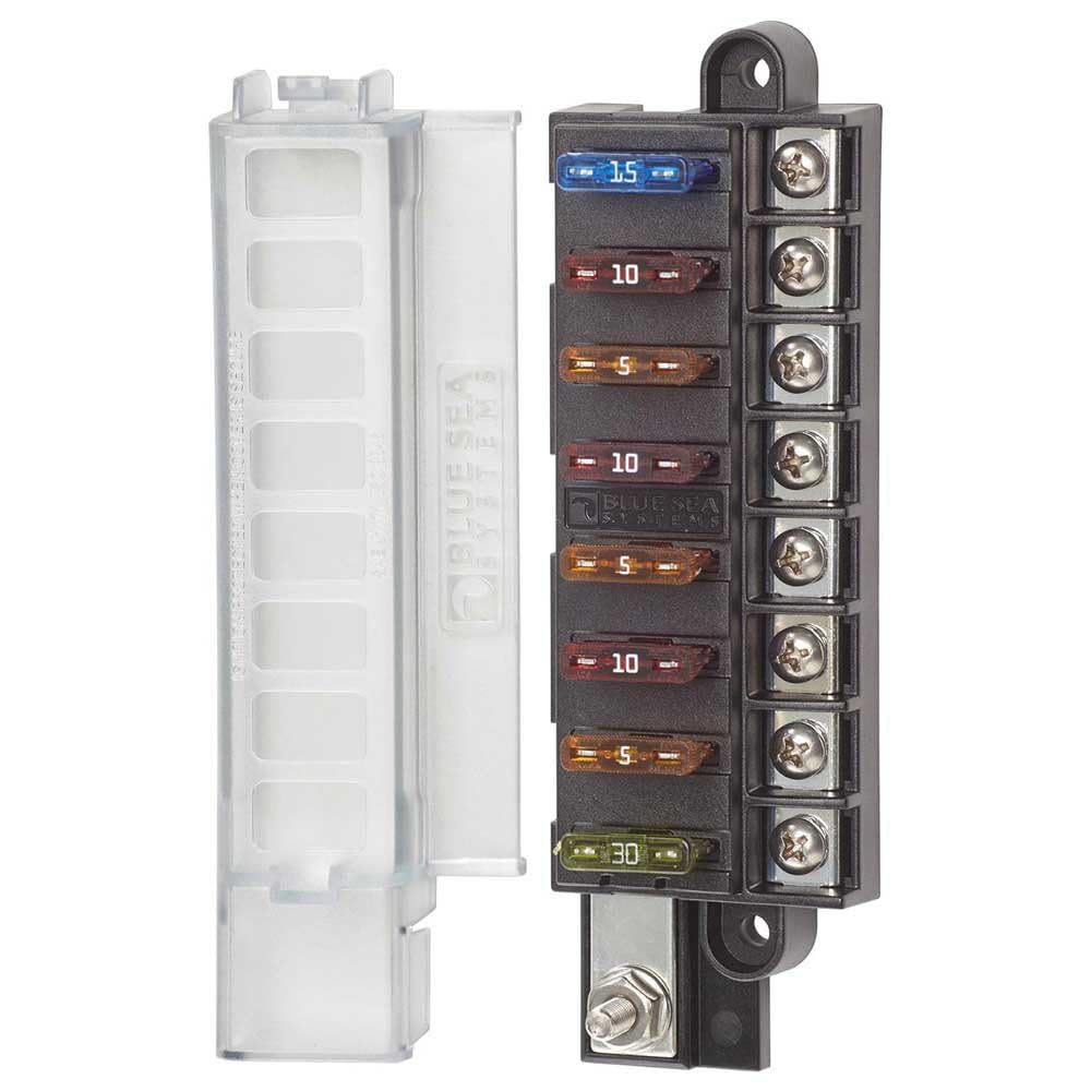 An eight circuit fuse block that will fit almost anywhere. Fuse Blocks are an effective method of protection to prevent damage to wiring and possible fire in the event of an over-loaded or short circuit. This Blue Sea Systems space-saving fuse block can provide protection for new installations or when the panel has run out of breakers. Often used for electronic installations, these fuse blocks can be fed by one breaker from the distribution panel and supply power to 8 additional circuits. Terminals are located on one side to concentrate wiring and minimize the overall footprint of the fuse block. A clear cover insulates fuses and terminals from accidental contact and satisfy ABYC and USCG requirements.