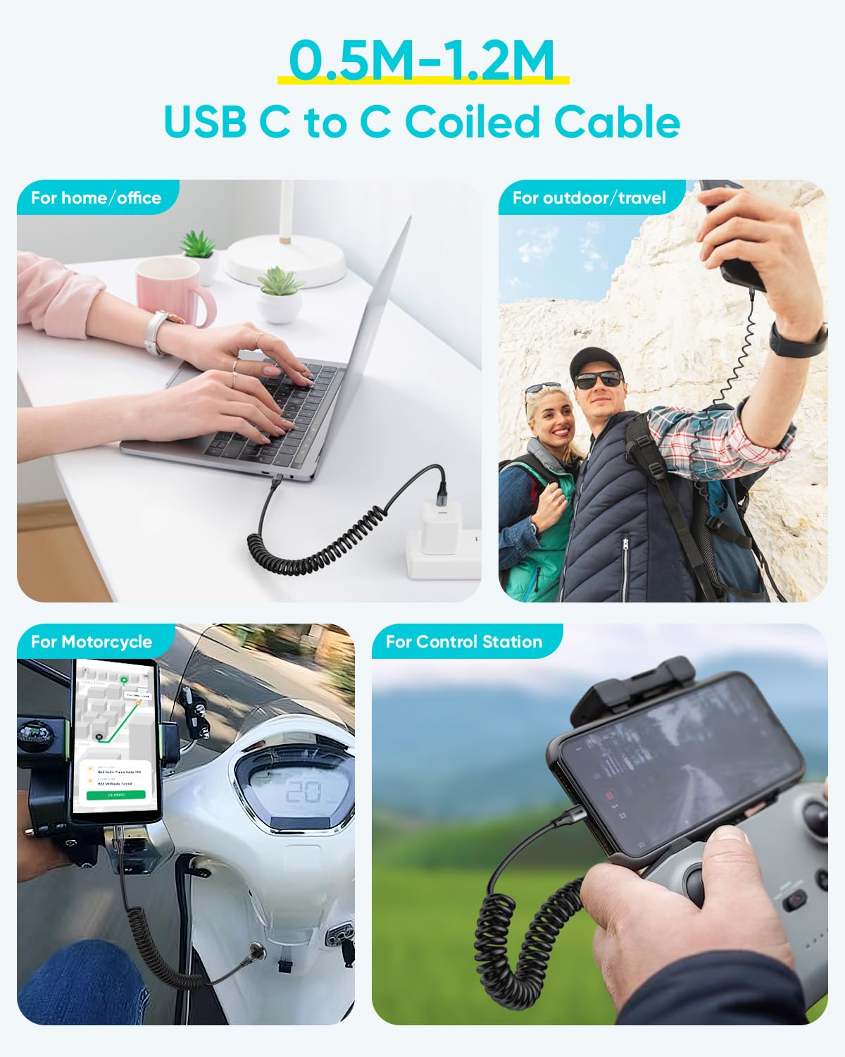 【1.5ft-4ft USB C Coiled Cable】This USB-C coiled cable has a natural length of 1.6ft and a maximum extended length of 4.9ft. The spiral USB-C to USB-C charging cable is convenient for charging your devices in the bedroom, on the sofa, in the office, in the car, or while traveling. Please do not stretch it to the limit!