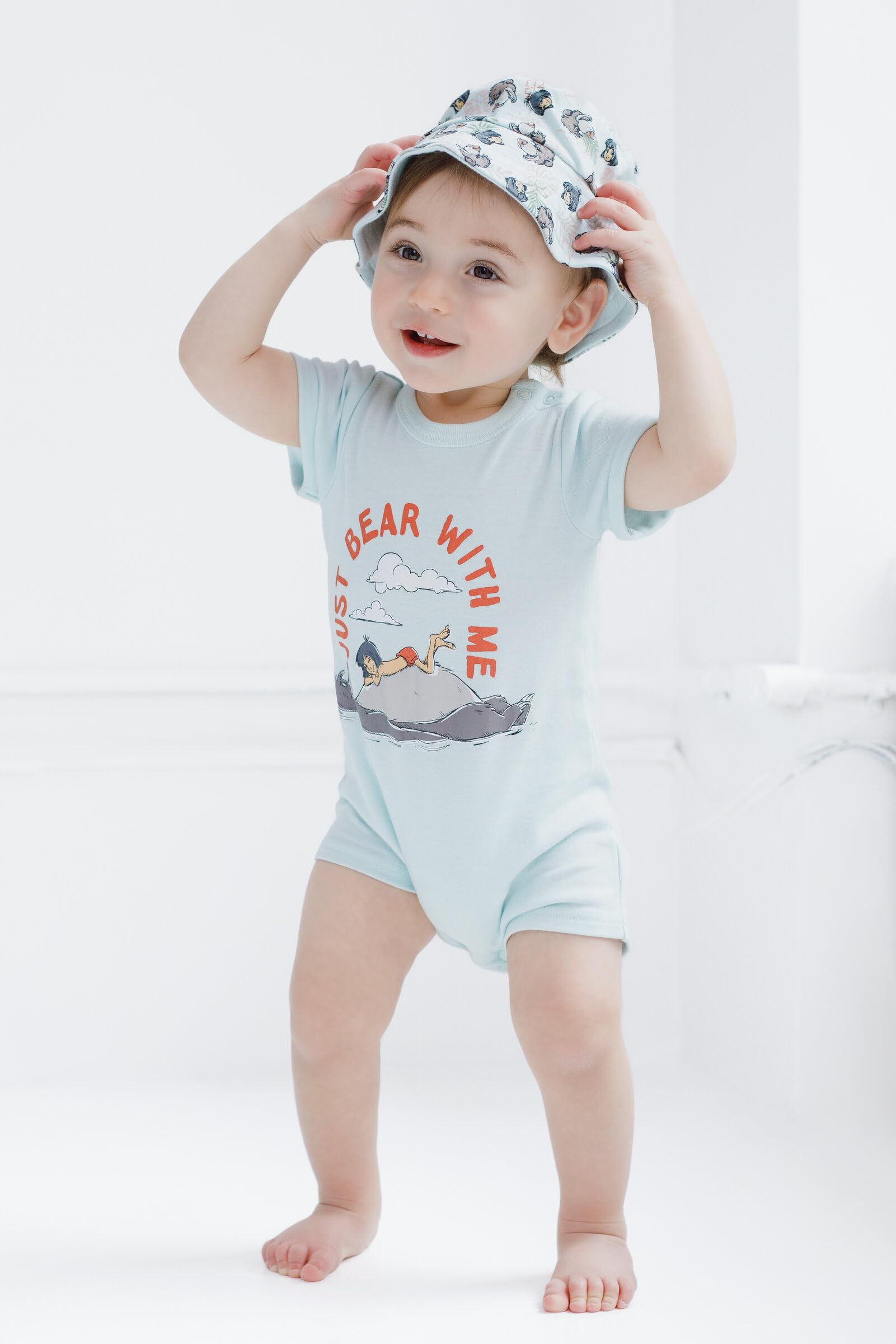 Clothes for babies 0-24 months with stylish and playful character designs; One-piece jumpsuit and sunhat with a comfortable fit that is easy to dress your little one in