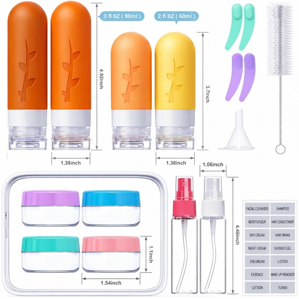 Designed for Travel Accessories: Our 18 pack reusable travel bottles set with 1 waterproof bag, 2 pcs silicone bottles (3 oz/90 ml), 2 pcs silicone bottles (2 oz/60 ml), 2 pcs spray bottles (1.05 oz/30 ml), 4 pcs cream jars (0.35 oz/10 ml), 1 pcs funnels, labels, brush and 2 pcs spatula! Different accessories for your different needs