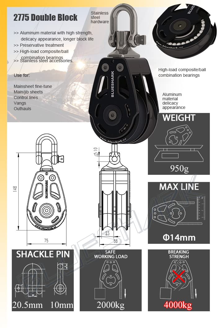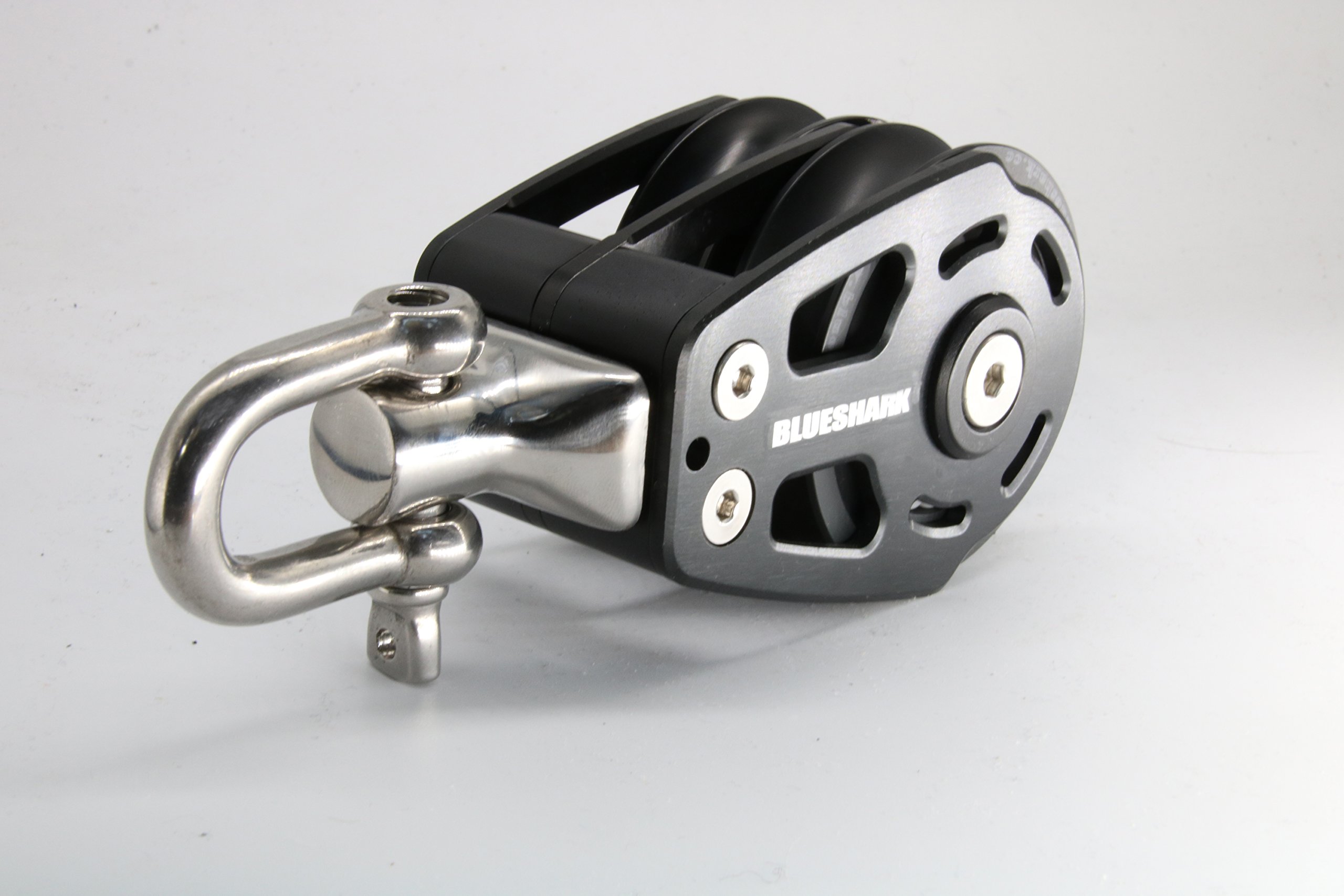 BLUESHARK Premium 75mm High Performance Aluminum Sailing Blocks Made of 6061T6 aluminum alloy with anodized hard coating which is twice as thick as black anodizing to provide double protection and corrosion resistance to air and salt water. Delrin balls and marine grade 316 stainless steel hardware.