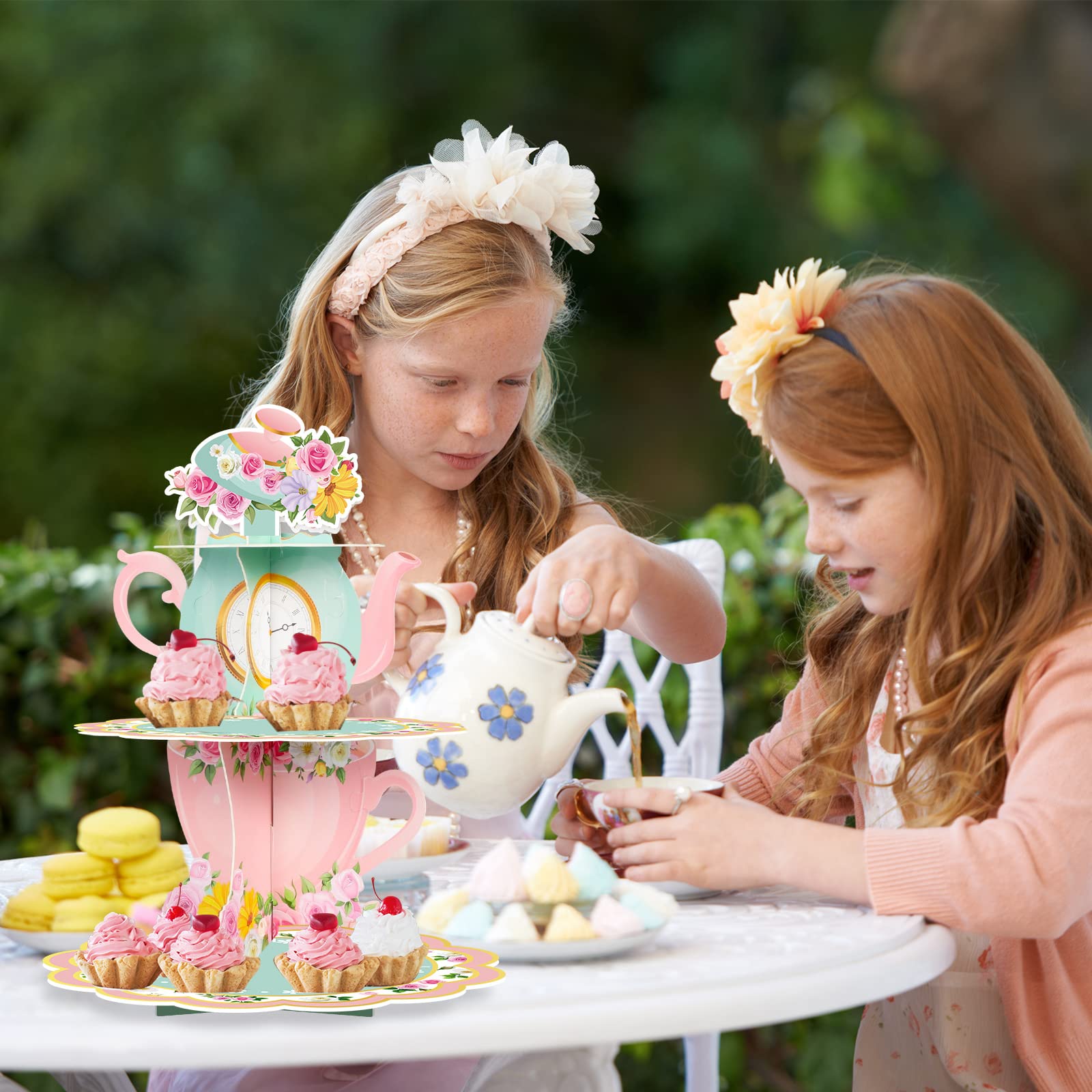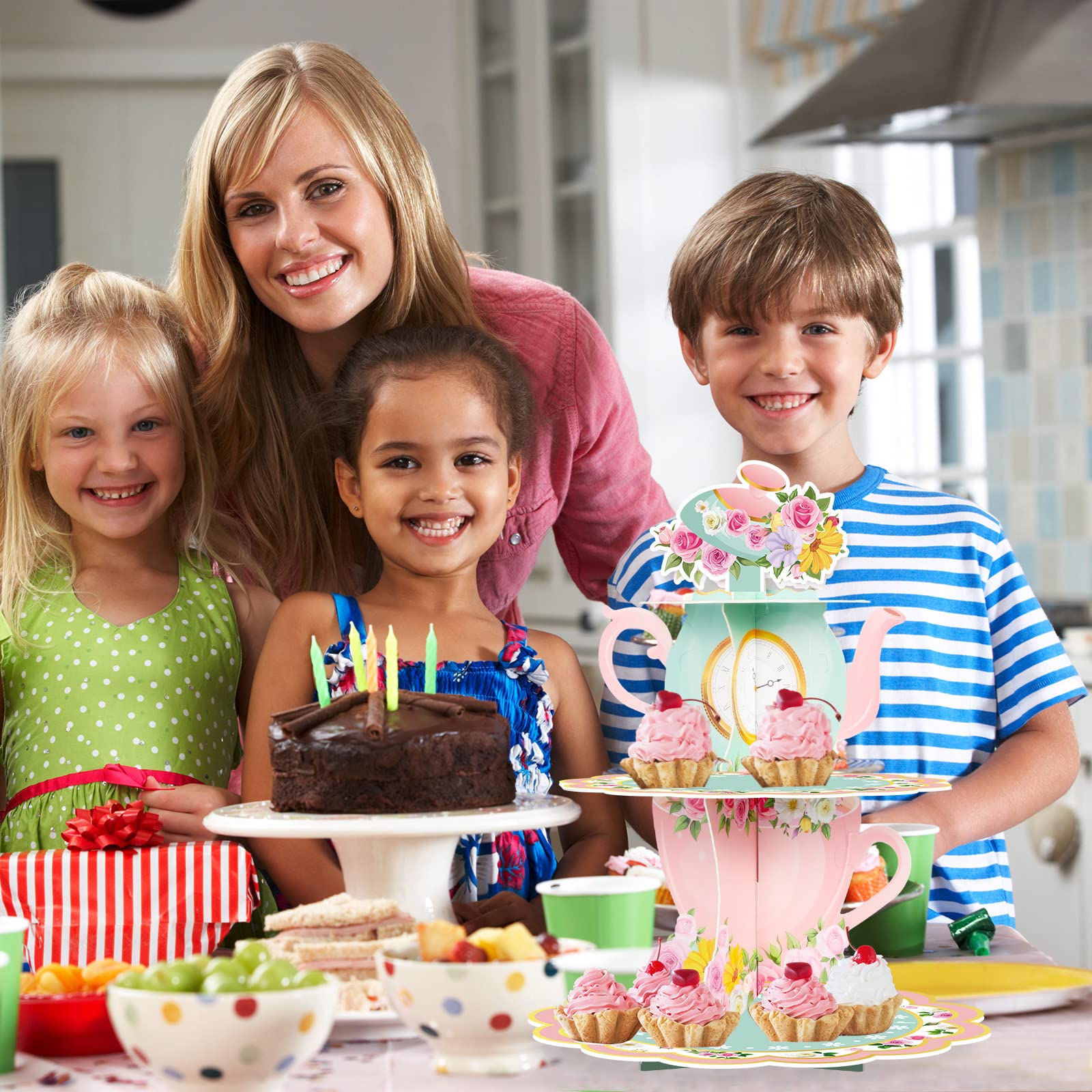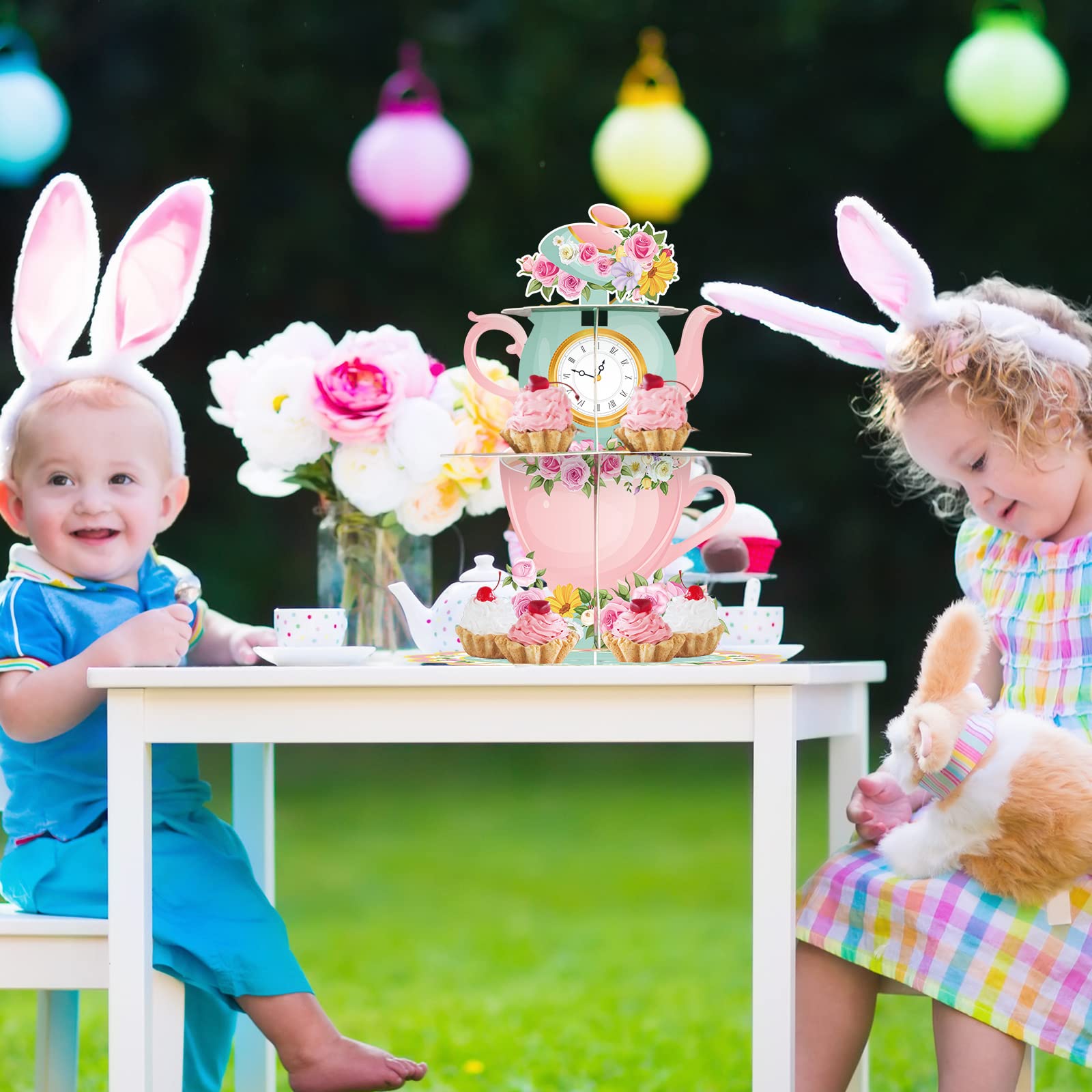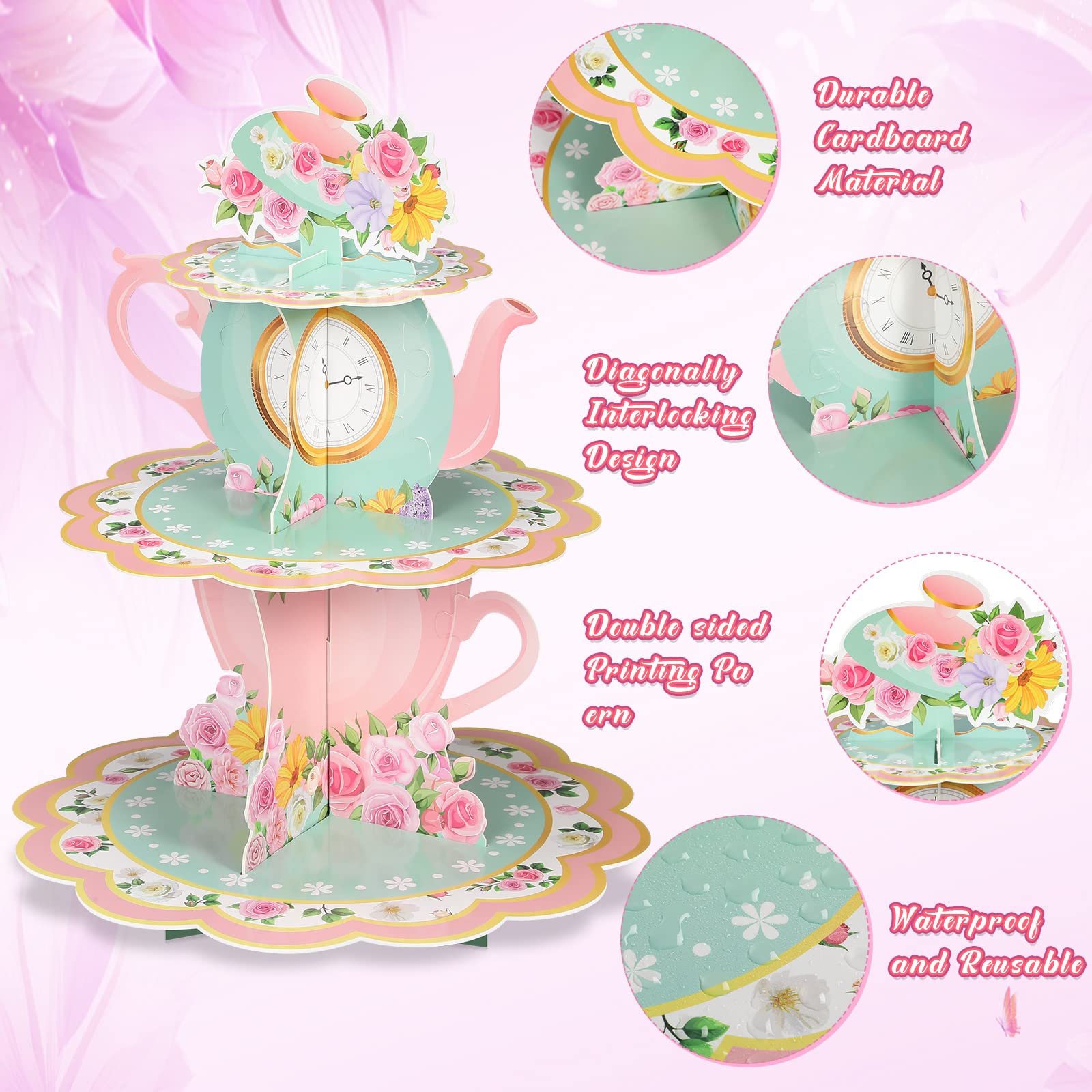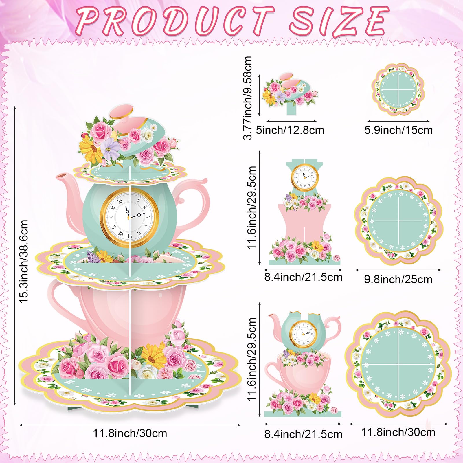 Quality Material: vintage teapot party cupcake tower party decorations are made of quality sturdy cardboard, sturdy and durable for holding many party desserts, using a double sided printing process, waterproof and reusable, which adds an active atmosphere for your floral tea party, you can also match it with other decorations