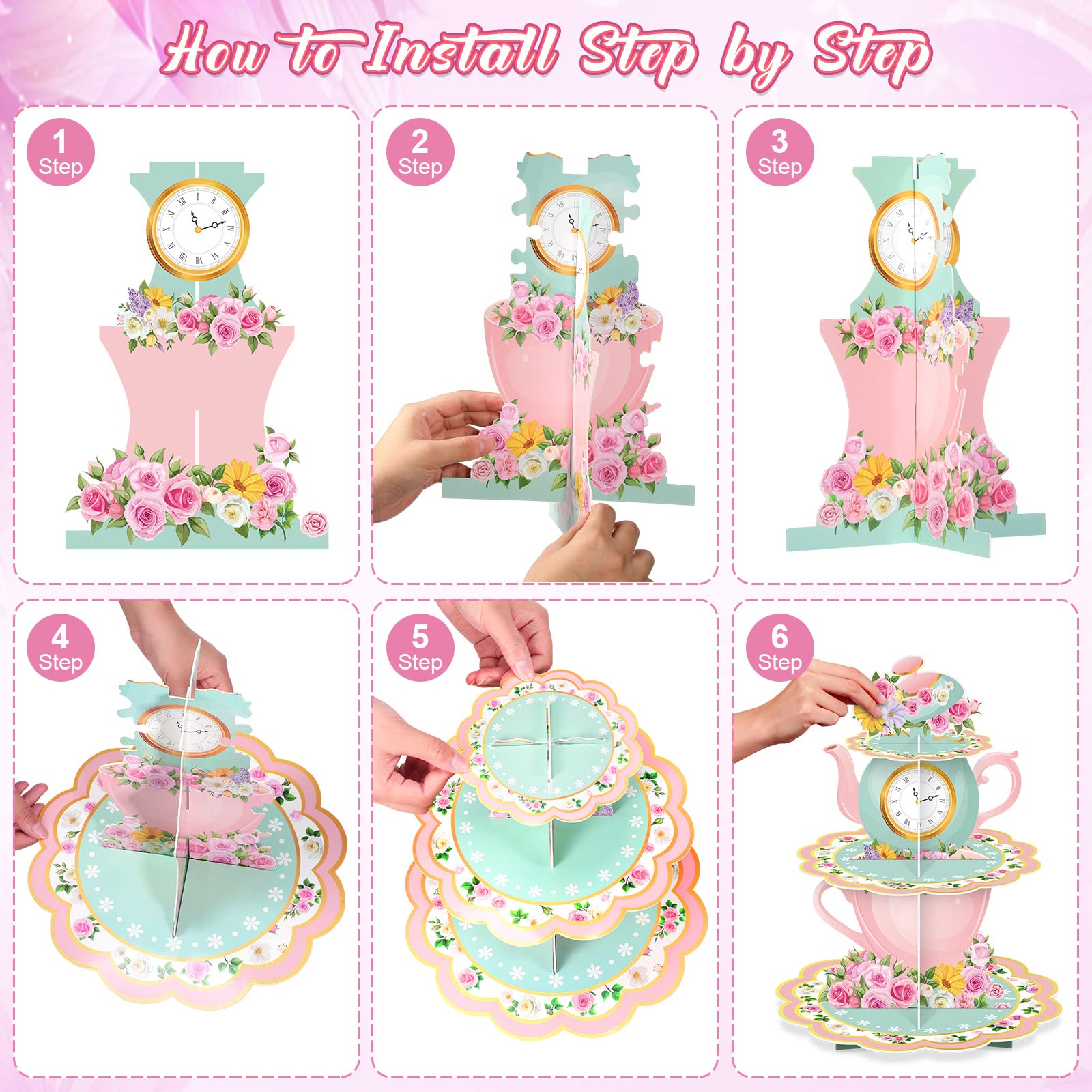 Easy to Use: Easy to Use: our floral tea party dessert tower decorations are not need to use any tools during assembly, you can refer to the assembly steps in the picture, thick cardboard is fixed between every two layers of cake stands, the groove cut matches the cardboard cut, easy to disassemble and store to save space