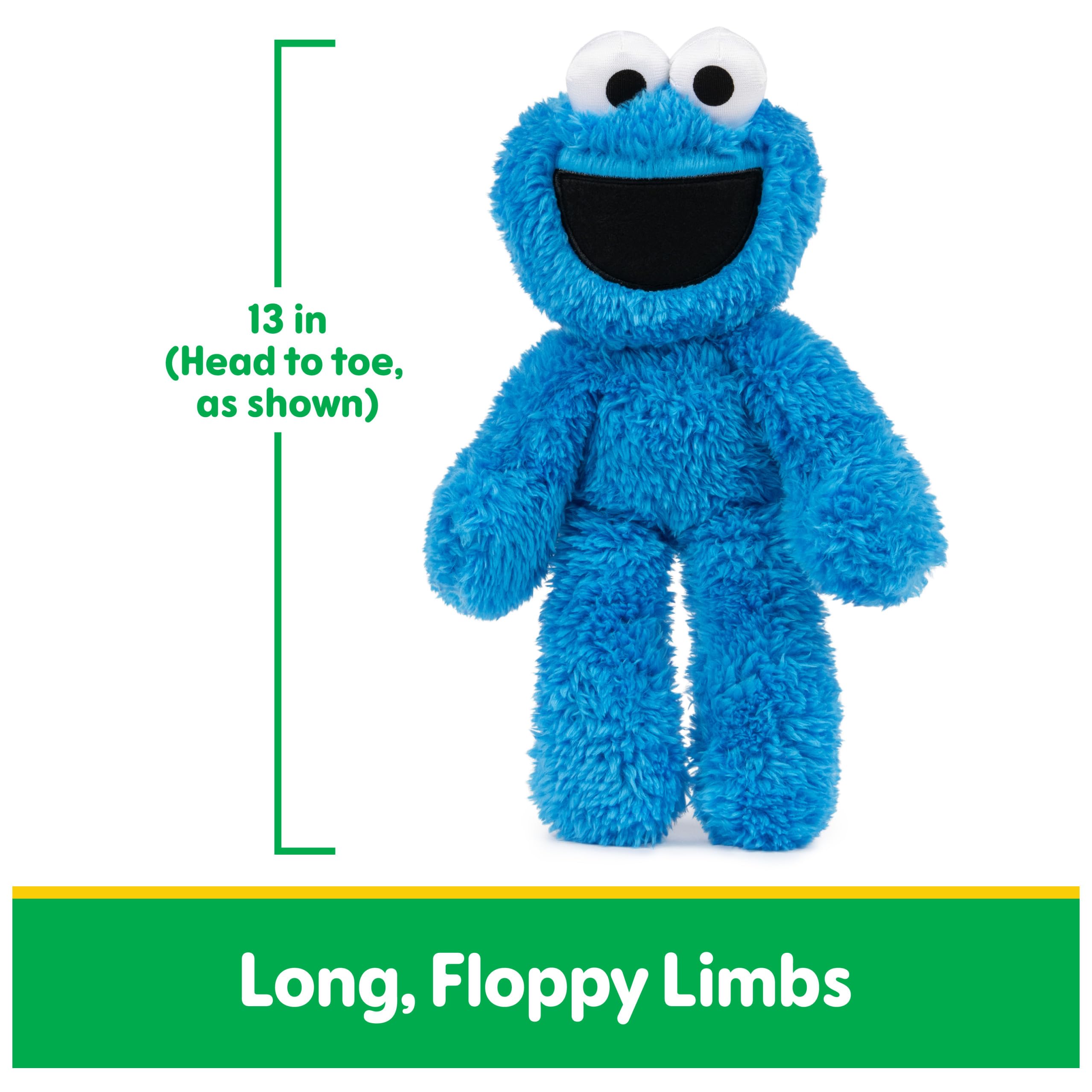 Product Description Bring playtime (and snack time) to life with Cookie Monster! This cuddly 13” plush captures the lovable cookie-obsessed blue Muppet with playfully floppy limbs and all-over plush softness, including soft eyes and an embroidered smile. Cookie Monster’s big hands are easy for little ones to grab and take anywhere, making this plush toy perfect not only for collecting, but on-the-go playtime too! Take Along Buddy plush are also available as Elmo, Grover, and Big Bird. Collect them all! Appropriate for ages 1 and up. Surface washable. GUND has teamed up with Sesame Street to make playtime a more huggable experience! Our collection of premium officially licensed plush toys make the best playdates, room décor, and perfect gifts for Sesame Street fans, from preschoolers to collectors of every generation. GUND is also proud to support Sesame Street’s largest official plush character offering available – collect all your favorite characters! From the Manufacturer Fuzzy plush Cookie with rag doll feel. The world's most huggable since 1898. Surface washable.
