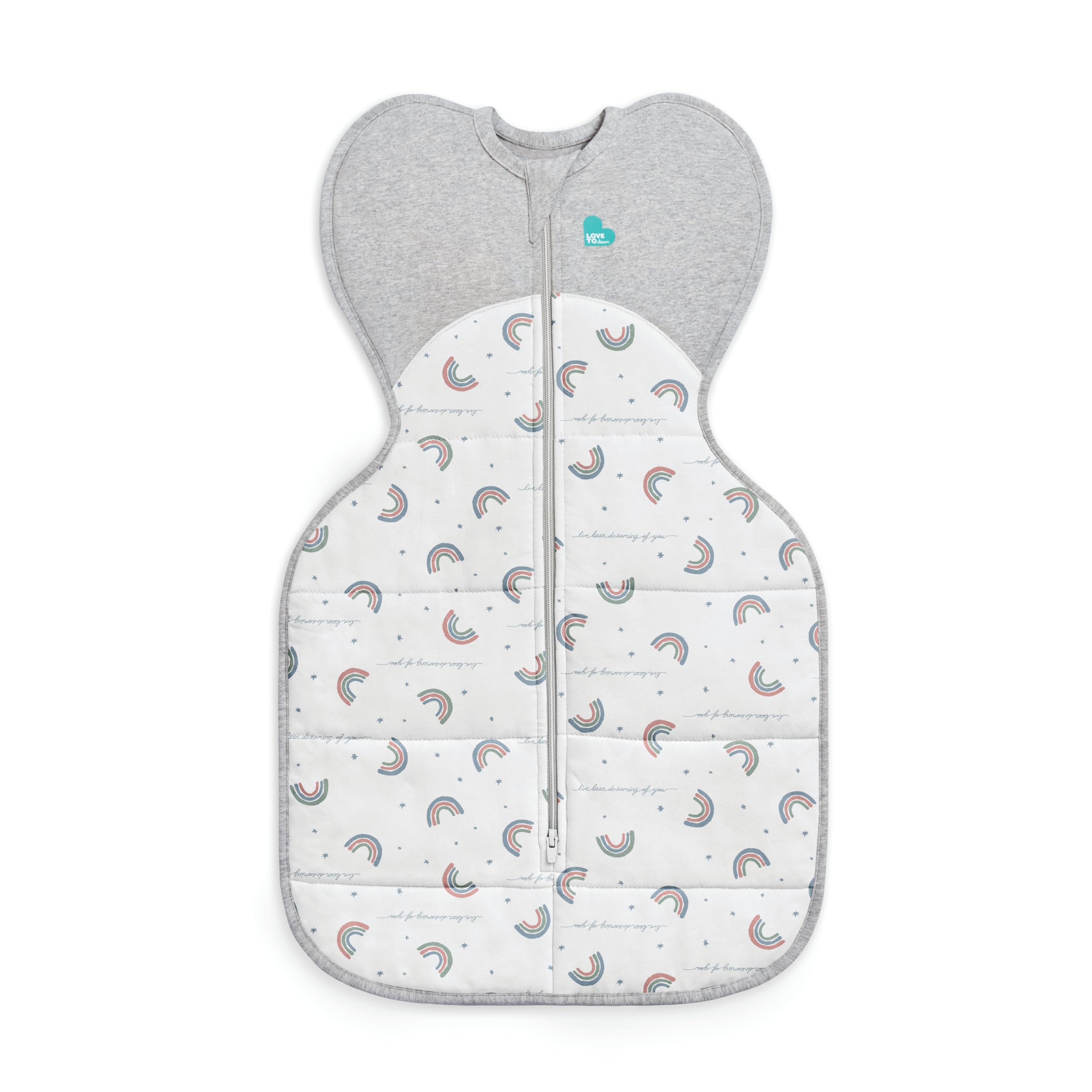 Love To Dream Baby Sleep Sack, Swaddle Up Self-Soothing Swaddle. Sleep never felt this snug with our Swaddle Up Self-Soothing Sleep Sack, available in a range of classic colourways & prints. Our "Arms-Up" baby sleep sack, also known as a swaddle or wearable blanket, is designed to allow baby's arms to be positioned upward and close to their face while they sleep. 83% of parents reported an increase in hours slept by their baby when using Swaddle Up. Baby's Natural Self-Soothing Sleep Position Most babies are more comfortable with their arms near their face, as this mimics the fetal position they were accustomed to in the womb. Allowing their arms to be up can enhance their sense of security and comfort during sleep. The ability for babies to self-soothe by touching their face or sucking on their fingers can be comforting. An Arms-Up sleep sack facilitates this natural soothing mechanism, promoting better sleep for baby. Babies have a startle (Moro) reflex that can sometimes wake them; swaddling with Arms-Up can help reduce this reflex and minimize unnecessary disturbances. Easy to Use, Hip-Friendly Design Our baby sleep sacks are designed to provide ample room for baby's legs and hips to move naturally, allowing for healthy hip development. The clever two-way zipper mechanism means quick and easy diaper changes for any parent, grandparent, or carer, even in the middle of the night. 2.5 TOG Warmth & Materials This 2.5 TOG material is ideal for cooler room temperatures between 61Β°F & 68Β°F. Fabric content: Outer & Lining: 93% Cotton, 7% Elastane; Filling: 100% Cotton. The fabricβs gentle stretch allows comfortable layering underneath for added insulation when needed. From the unique, award-winning Swaddle Up, to bedding and self-soothing toys, the Love To Dream range has grown to provide a portfolio of sleep solutions designed for children up to four years old.