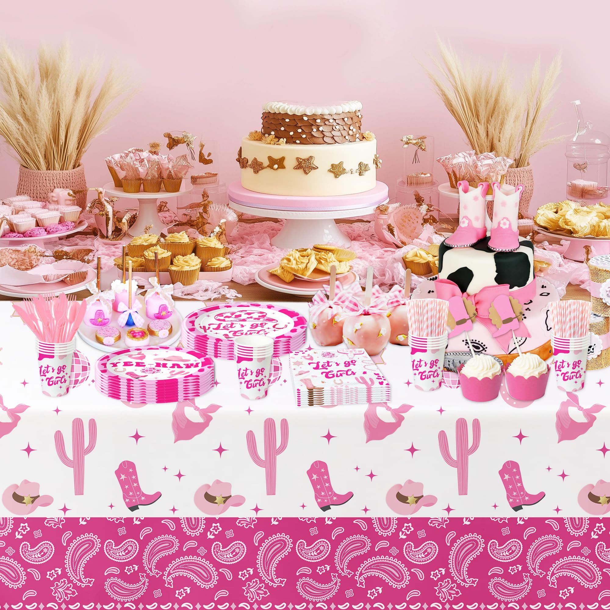 Cowgirl Theme Let's Go Girls Party Tablecloth Includes: Package: 4 Pcs Material: Disposable Size: 108 x 54 inch The cowgirl birthday party supplies table covers can be applied for picnic tables, dinner tables, gift tables, and dessert tables ♥ Our disposable tablecloth is perfect for outdoor parties and indoor events alike, get these party supplies ready for a fun party with family and friends!