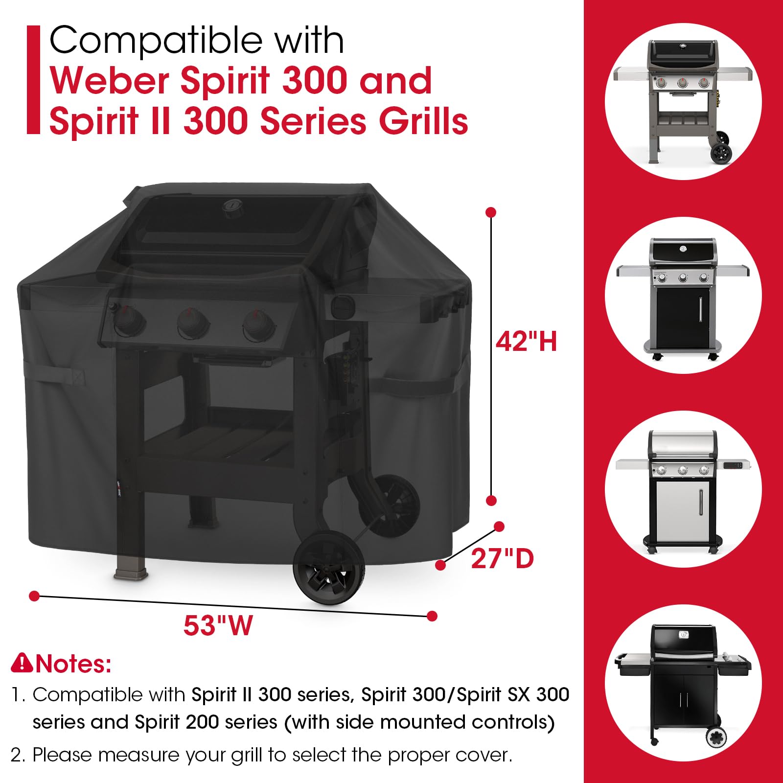 53 Inch Grill Cover Dimension: 53"W x 27"D x 42"H, the Unicook gas grill cover for outdoor grill is compared to Weber 7139 spirit grill cover, compatible with Weber Spirit II 300 series, Spirit/Spirit SX 300 series and Spirit 200 series (with side mounted controls). It also fits 2-3 burner gas grills up to 50” wide from brands like Char-broil, Nexgrill, Kenmore, Monument and etc