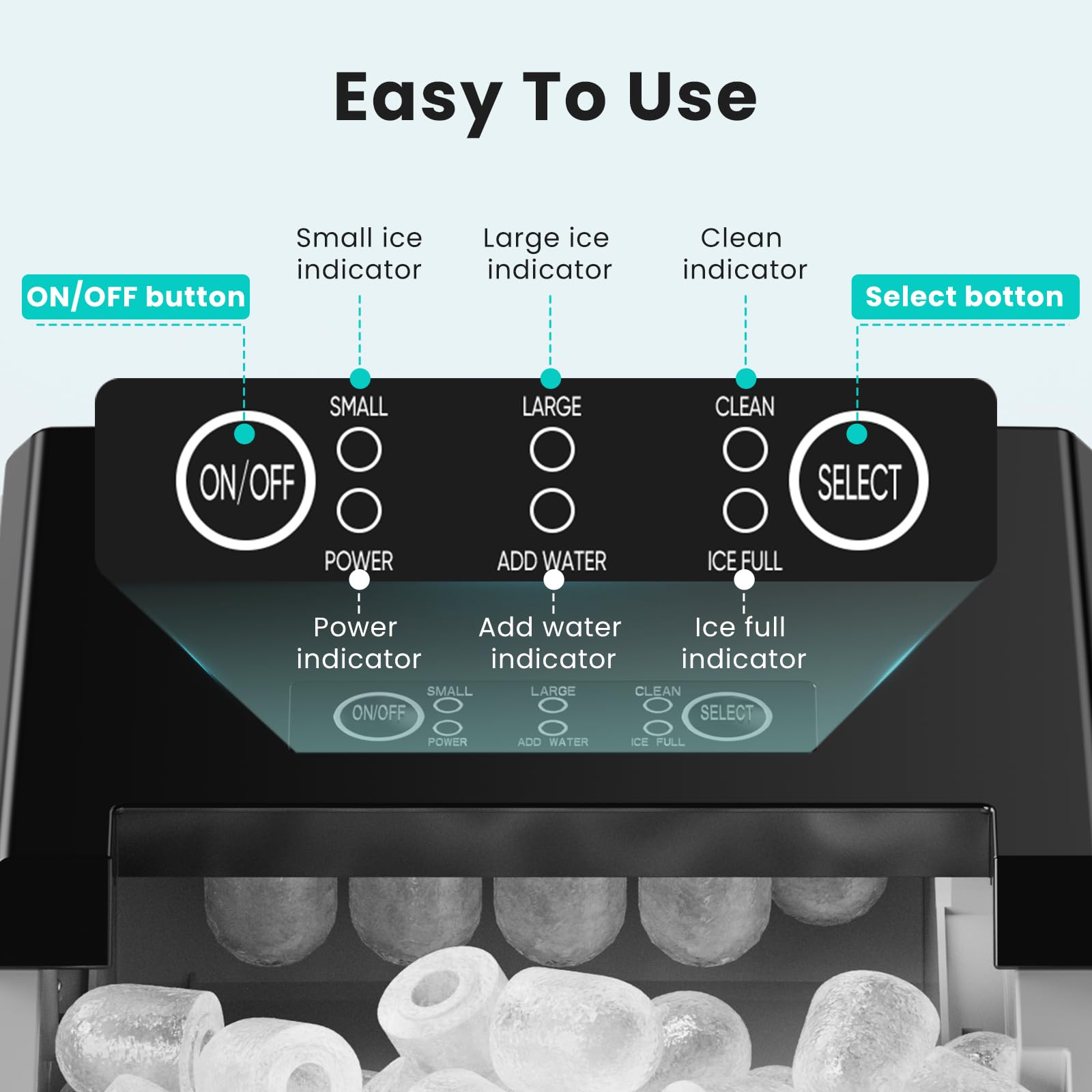 User-Friendly Operation: The clear ice cube maker control panel is designed for effortless use—just follow three simple steps to enjoy fresh ice cubes in no time. Intuitive indicators light up to signal when the water tank needs refilling or the ice bin is full. During operation, the portable ice maker operates at a noise level below 40 decibels.