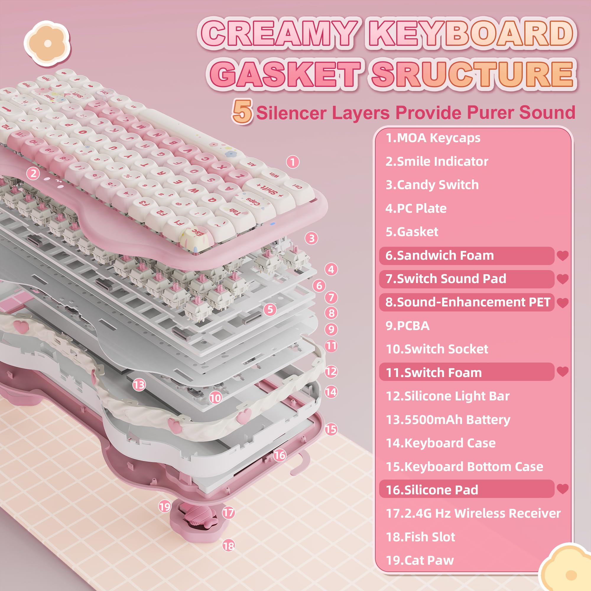 Creamy Keyboard with Gasket Structure: This cute mechanical gaming keyboard takes gasket structure and multiple layers of sound-absorbing fillings, pre-lubed mechanical switches, stabilizers and solid silicone eliminate typing noise, creating a solid creamy mechanical keyboard. Enjoy smooth and consistent keystrokes with a pleasantly Creamy sound of the thocky keyboard that enhances your typing comfort