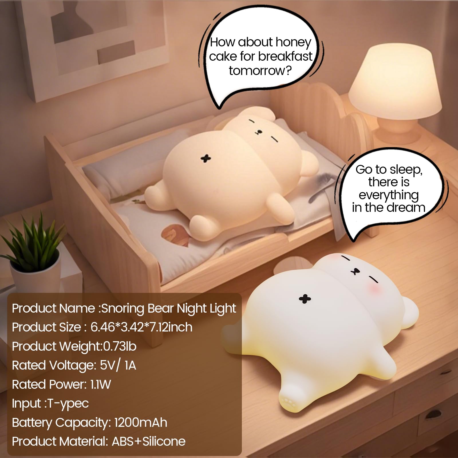 【 3-Level Adjustable Warm Light & 3 levels of sound adjustment】 this bear squishy light offers soft warm lighting with 3 brightness settings (10%-50%-100%), Ideal for midnight feedings, nursery rooms, or anxiety relief—no harsh glare to disrupt sleep cycles.The snoring sound of the little bear night light can be adjusted in 3 levels. You can also turn off the snoring sound by switching the sound button and clicking it 4 times in a row.