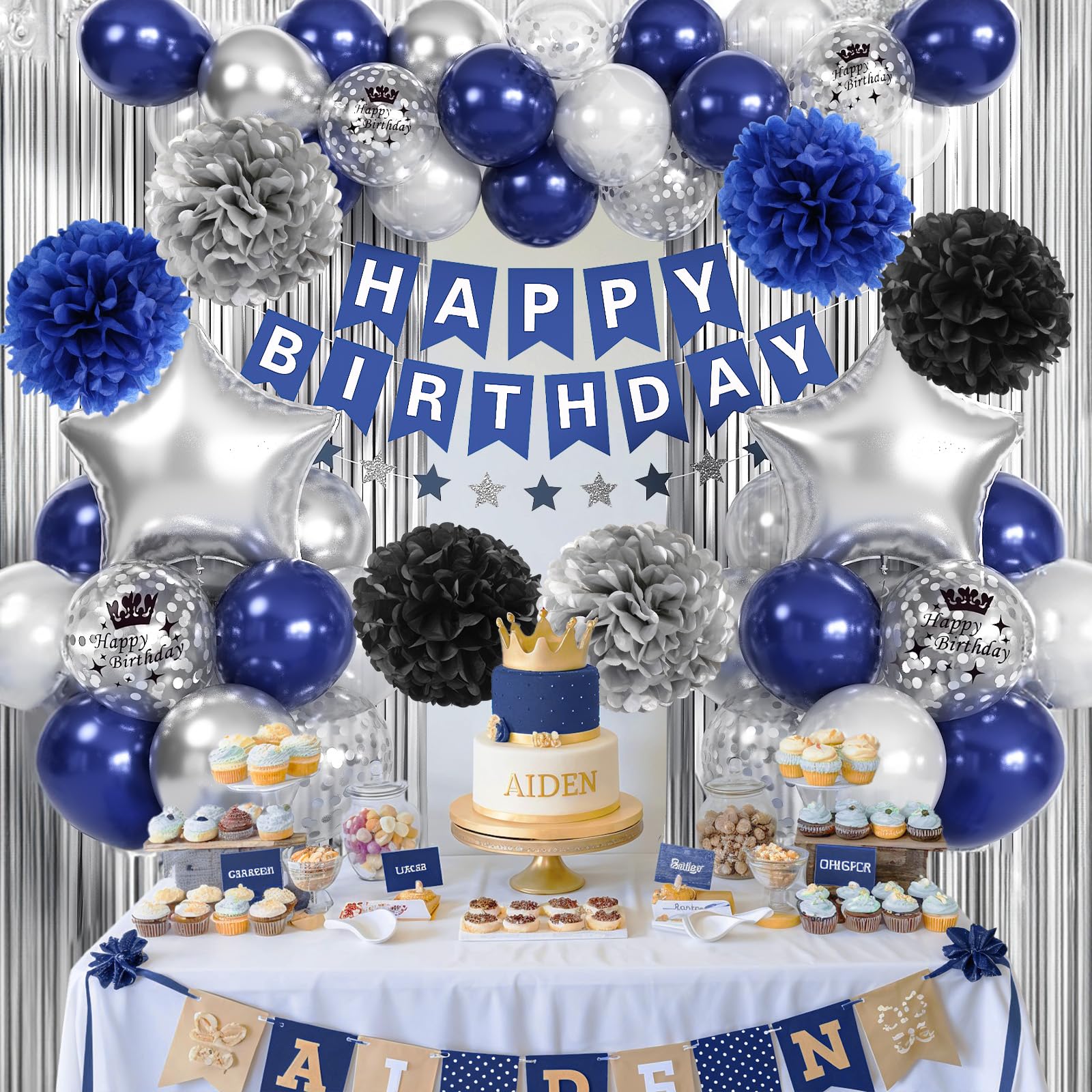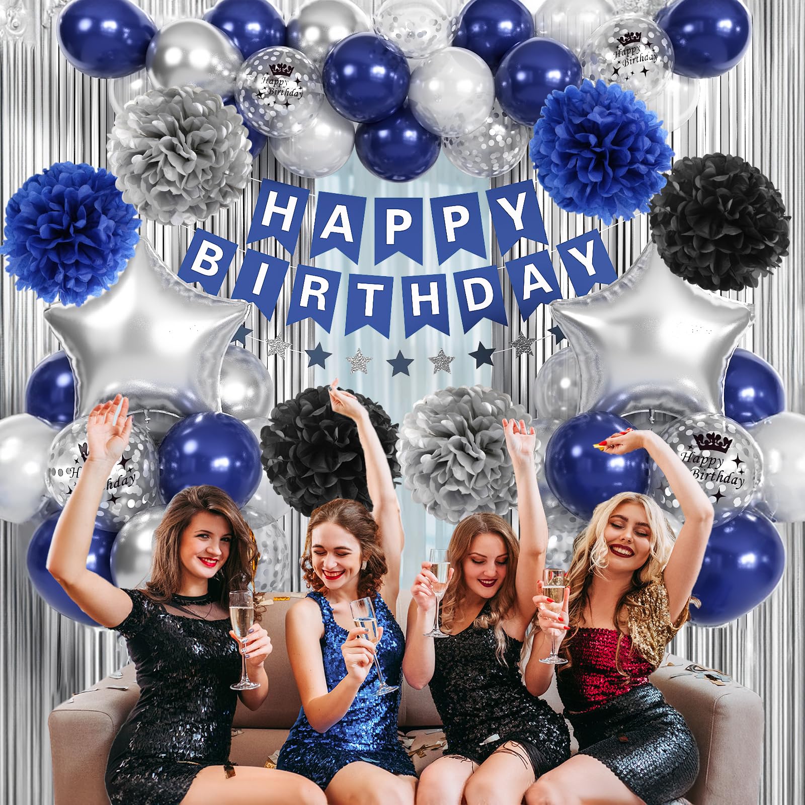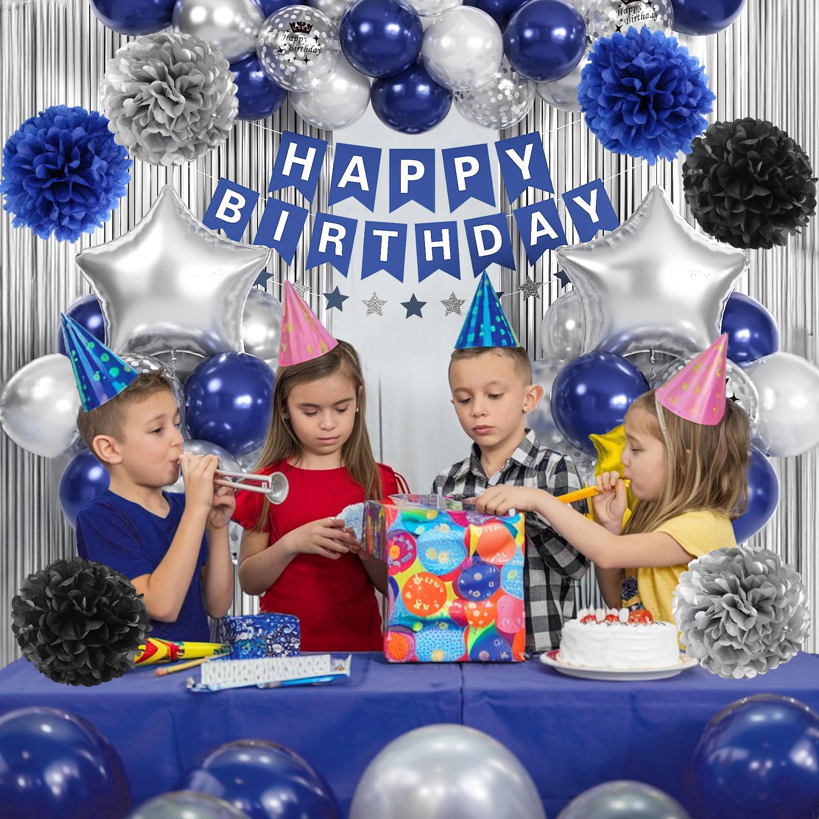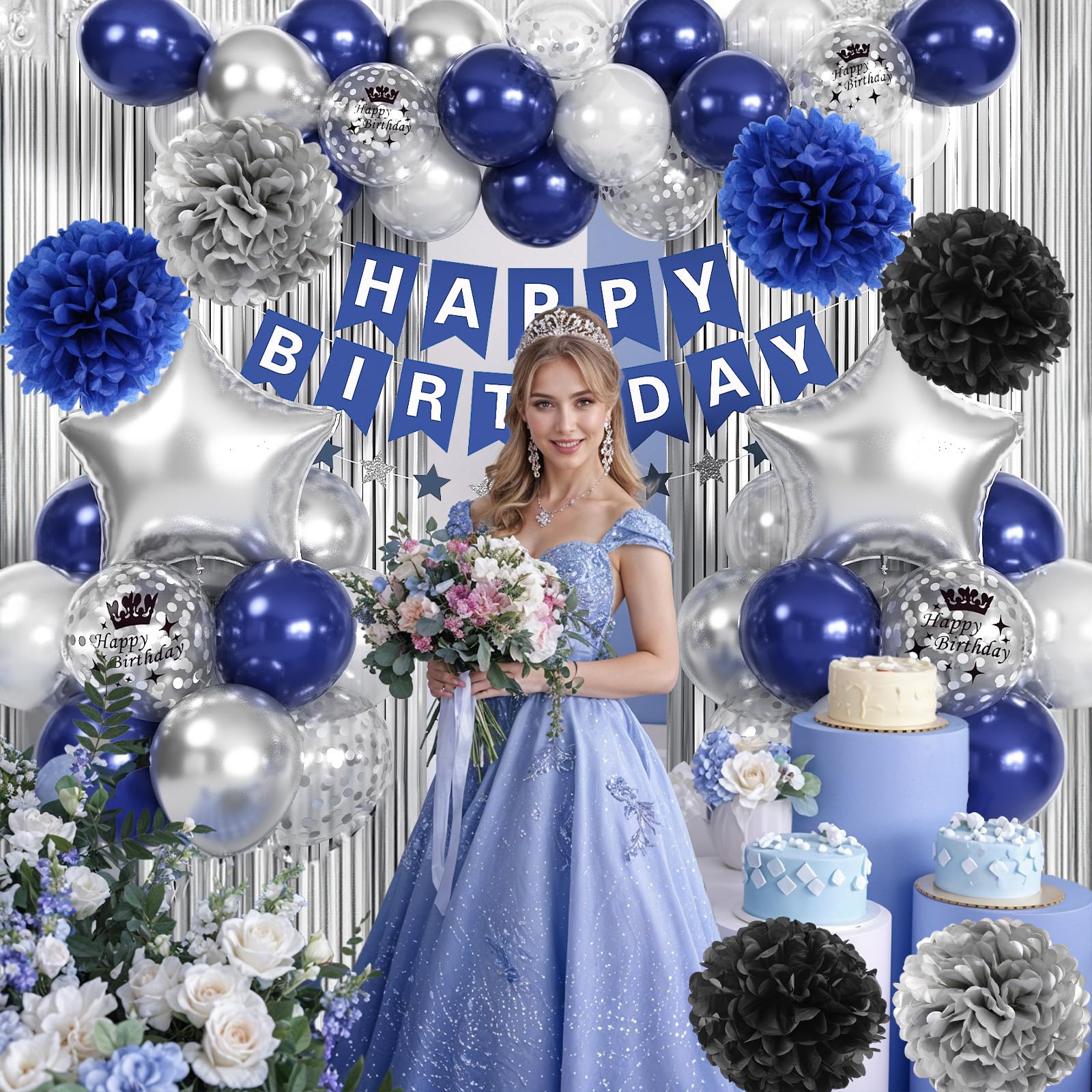 🎂 Blue And Silver Birthday Decorations for Women Men Boys Girls - Create Unforgettable Celebrations 🎉 Make birthday a truly memorable occasion with our stunning royal blue silver Birthday Party Decorations for her or him. This comprehensive metallic silver blue party decoration set is perfect for birthday party, wedding party decoration, baby shower, bridal showing, wedding, engagement, anniversary, New Year party decoration etc. ✨ Package Included - 🎈 1pc 100cm/40inch * 200cm/78.7inch metallic silver foil fringe curtain 🎈 2pcs navy blue pom poms 🎈 2pcs black pom poms 🎈 2pcs silver pom poms 🎈 navy blue happy birthday banner 🎈 silver blue happy birthday buntting 🎈 2pcs 18inch silver star foil balloon 🎈 12inch 4pcs silver confetti latex balloons 🎈 4pcs silver confetti print balloons 🎈 4pcs navy blue helium balloons 🎈 4pcs pearl silver party balloons 🎈 4pcs mettalic silver helium balloons 🎈 1pc balloon ribbon. ✨ Specification- 🎉 Material: Crafted with high-quality late and thick cardboard materials, our Blue and Silver Party Decorations are built to last and create a lasting impression. The navy blue silver color palette exudes elegance and sophistication, adding a touch of luxury to the celebration. 🎉 Inflatable- Air or Helium. Large quantity of latex blue birthday balloons set are perfect for creating a stunning balloon arch, balloon garland, or balloon bouquet. You can mix and match the number to create a unique and personalized look that matches your event's theme. Warm Tips - ⚠Please do not over-inflate the balloon to avoid pop. ⚠Due to the display of the monitor, the color may be slightly different from the actual item. ⚠The confetti balloons come with confetti inside. After inflating, please rub carefully with carpet, silk, hair and roll the balloons.