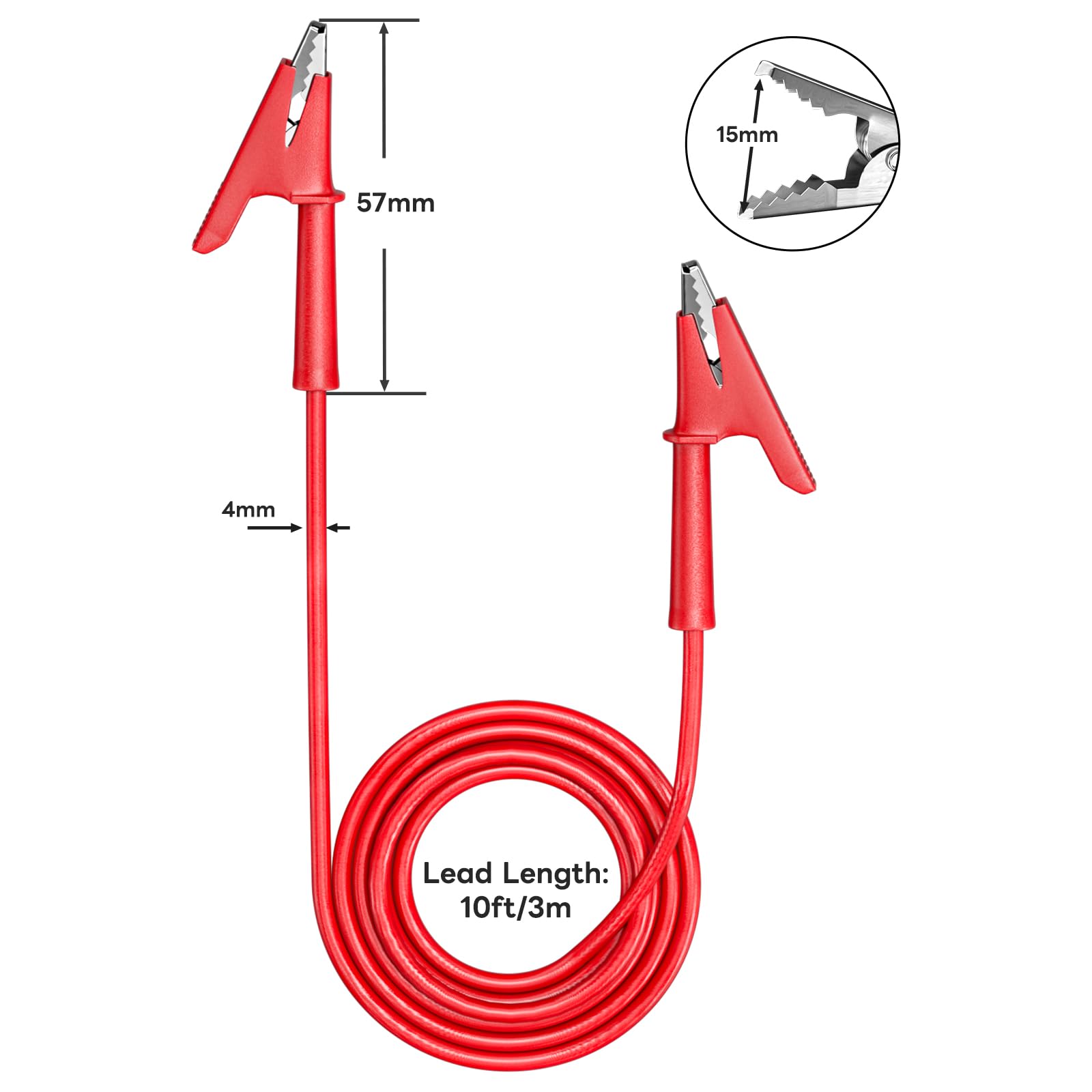 Copper: Both ends of the test leads are pure copper alligator clips. The maximum width of the crocodile clips opening is 10mm. Lead length: 10ft. Voltage: 1000V. Current: 15A.