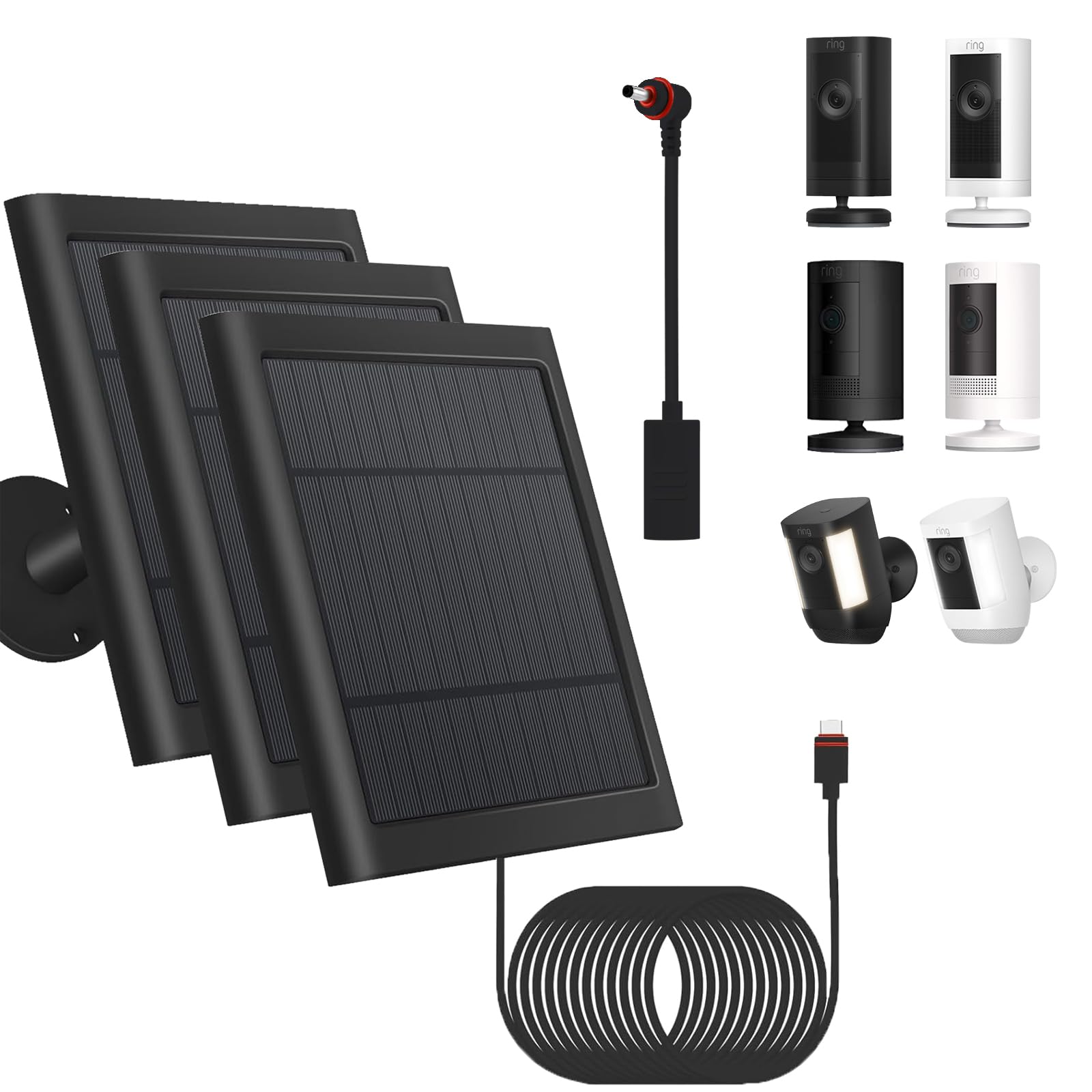 【Package Includes】3 X solar panel, 3 X 3m (10ft) typeC cable, 3 X typeC to DC Plug adapter cable, 3 X 360° mounting bracket, 3 X 4 screw pack, 3 packs of 6mm X 20pcs wire cable clips nails. For any questions about the product, please feel free to contact our friendly customer service. We promise you 100% SATISFACTION.