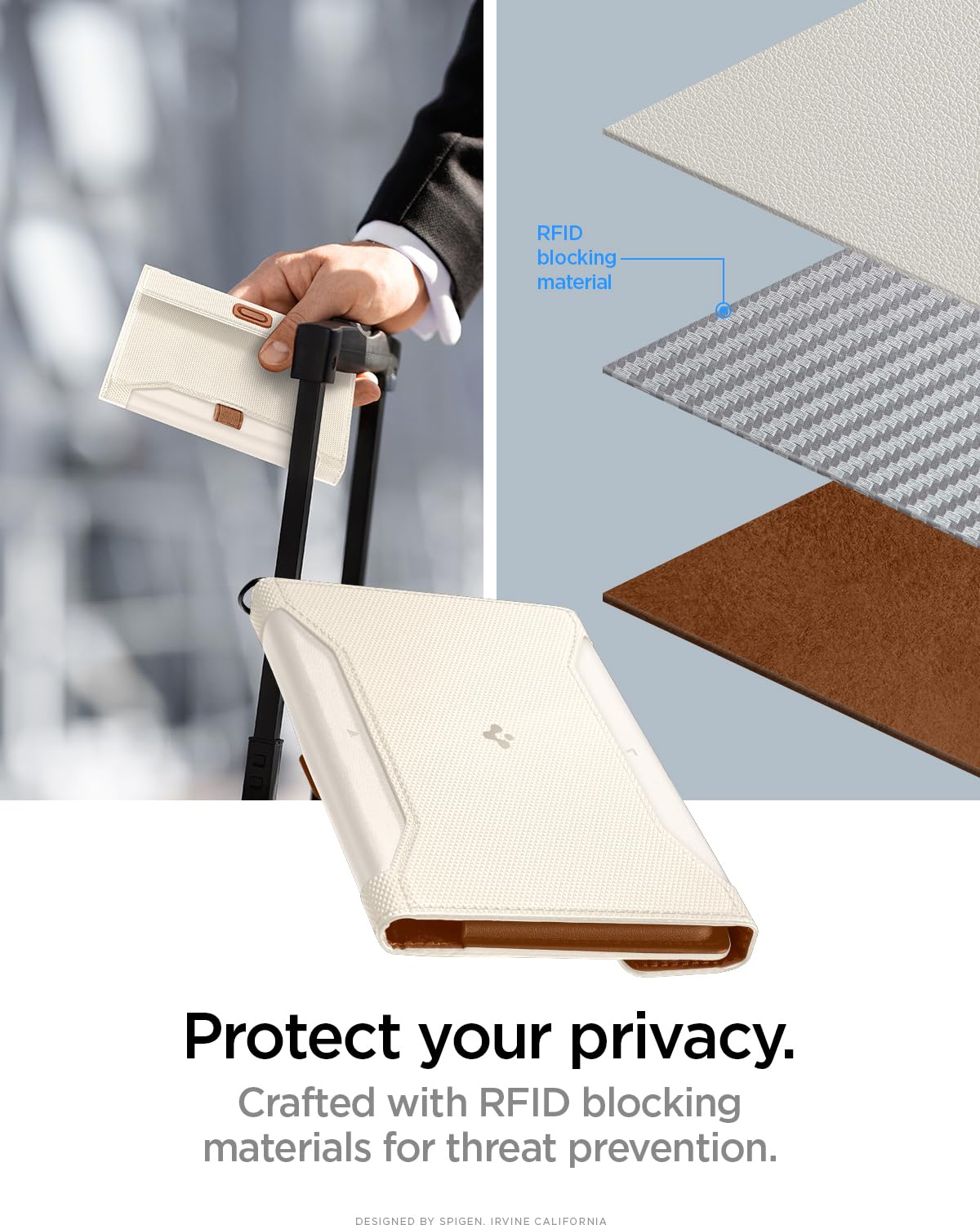 Multiple storage options including 4 card slots, passport pocket, boarding pass holder, pen loop, and SIM card storage
