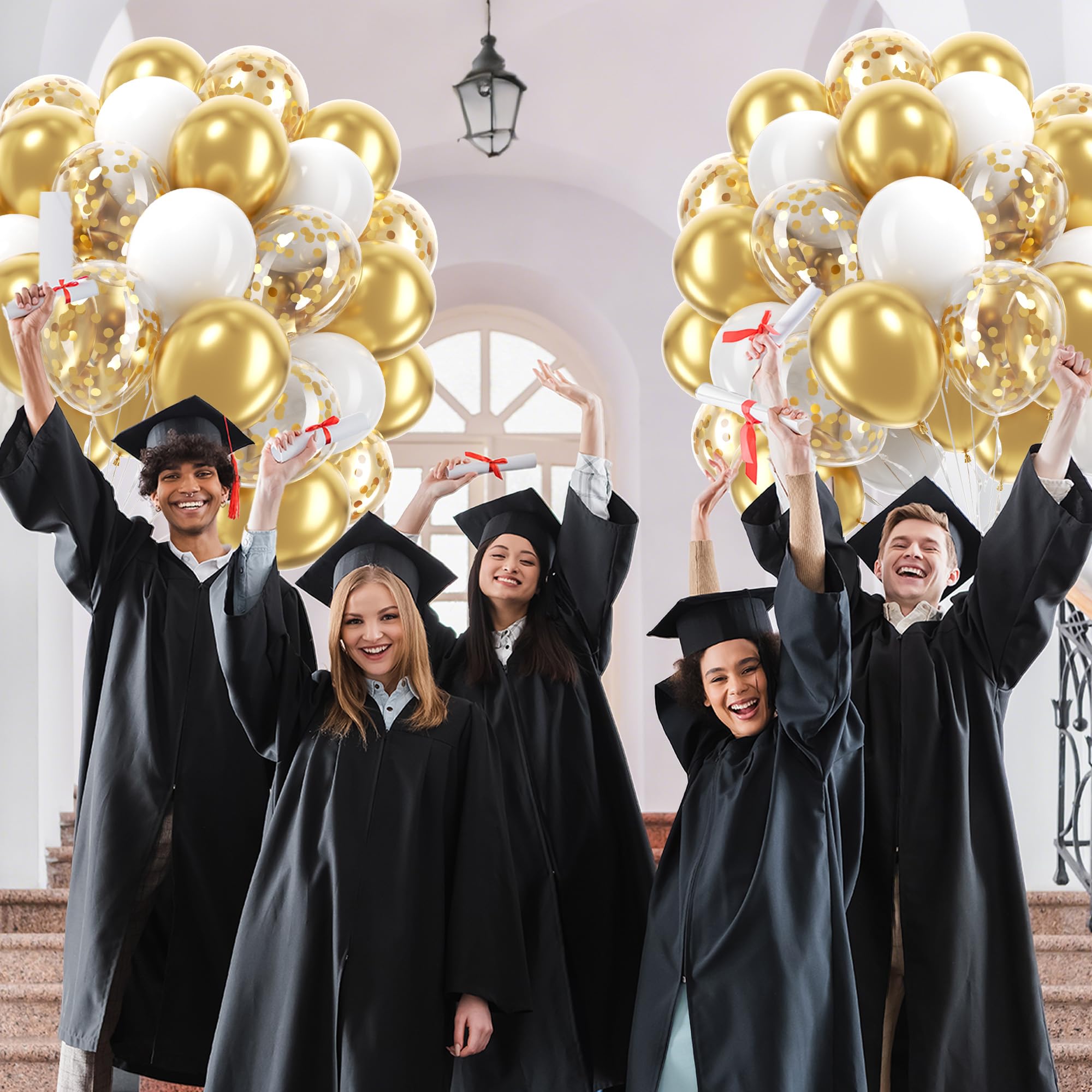 Package Include: The gold and white balloons include 12inch white balloonsx25, 12inch metallic gold balloonsx25, 12inch gold confetti balloonsx10, glue dotsx20, white ribbonx1