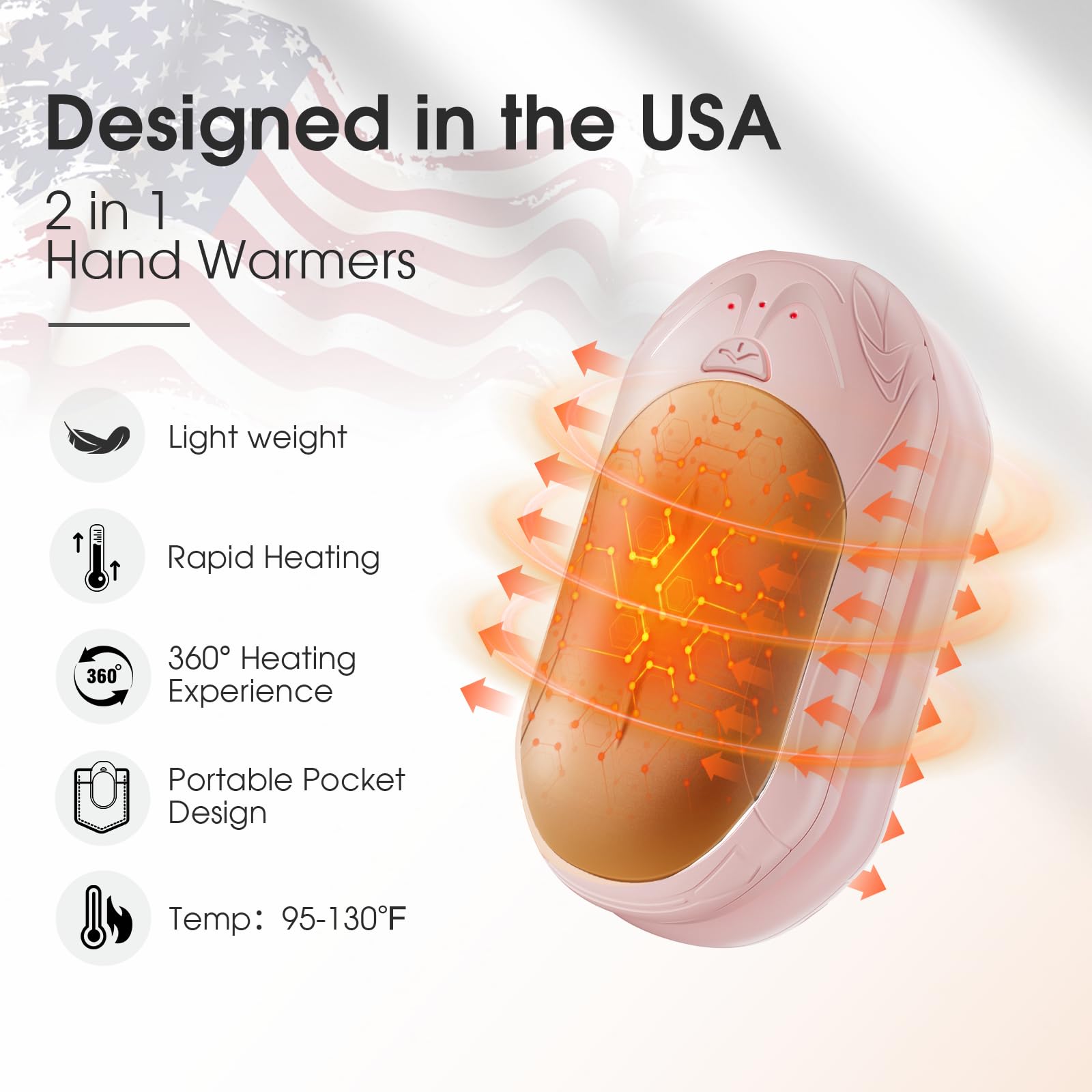 2-in-1 Electric Hand Warmer - A set of 2 symmetrical hand warmers that can be combined into a palm-sized hand heater, providing 360-degree warmth for your hands. Alternatively, you can use them separately, each hand holding one, or share one hand warmers with a family. The portable pocket design is suitable for travel, hunting, golf, hiking, camping, skiing, and more