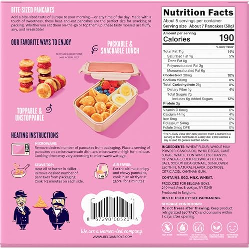 Belgian Boys Bite-Sized Pancakes are the ultimate breakfast delight for busy, on-the-go mornings. Made with just a touch of sweetness, these quick and easy breakfast bites can be enjoyed on their own—or dress them up with syrup, melted chocolate, fresh berries or whipped cream, for a tasty twist on your everyday morning routine. Just a minute in the microwave or three minutes on the stove, and these heat-and-eat pancakes will land on your breakfast plate fluffy, airy, and irresistible!