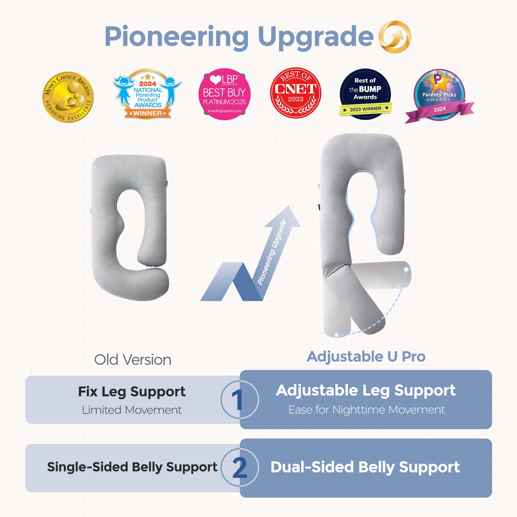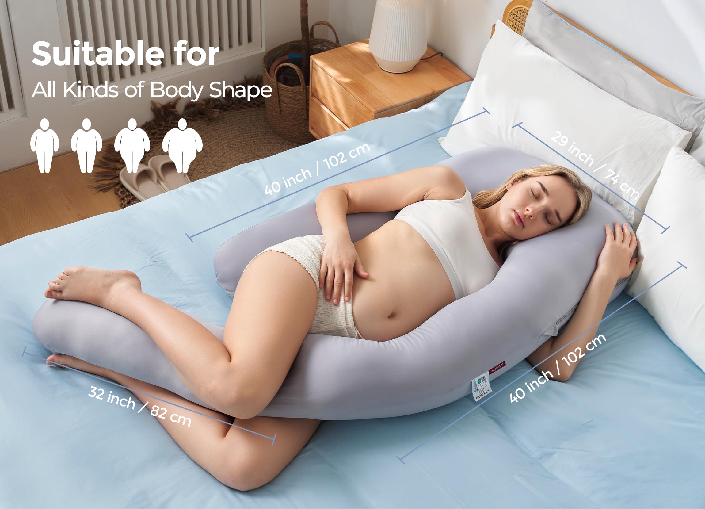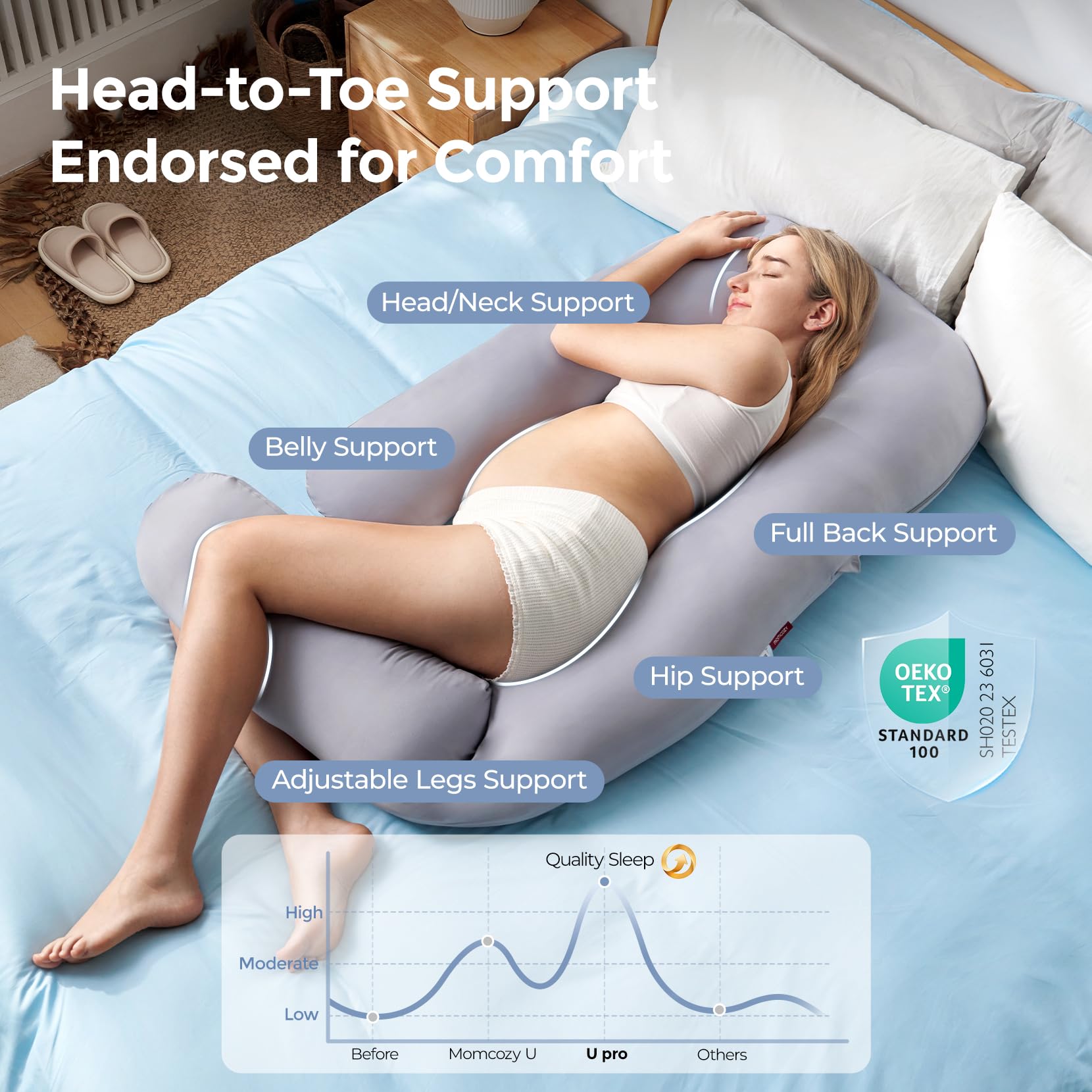 Pioneering Upgraded - Upgraded from traditional U-shaped pillows, Momcozy U Pro maternity pillow's innovative slide leg pillow allows you to customize angle or collapse for effortless nighttime movement, eliminating the need to climb over fixed barriers.