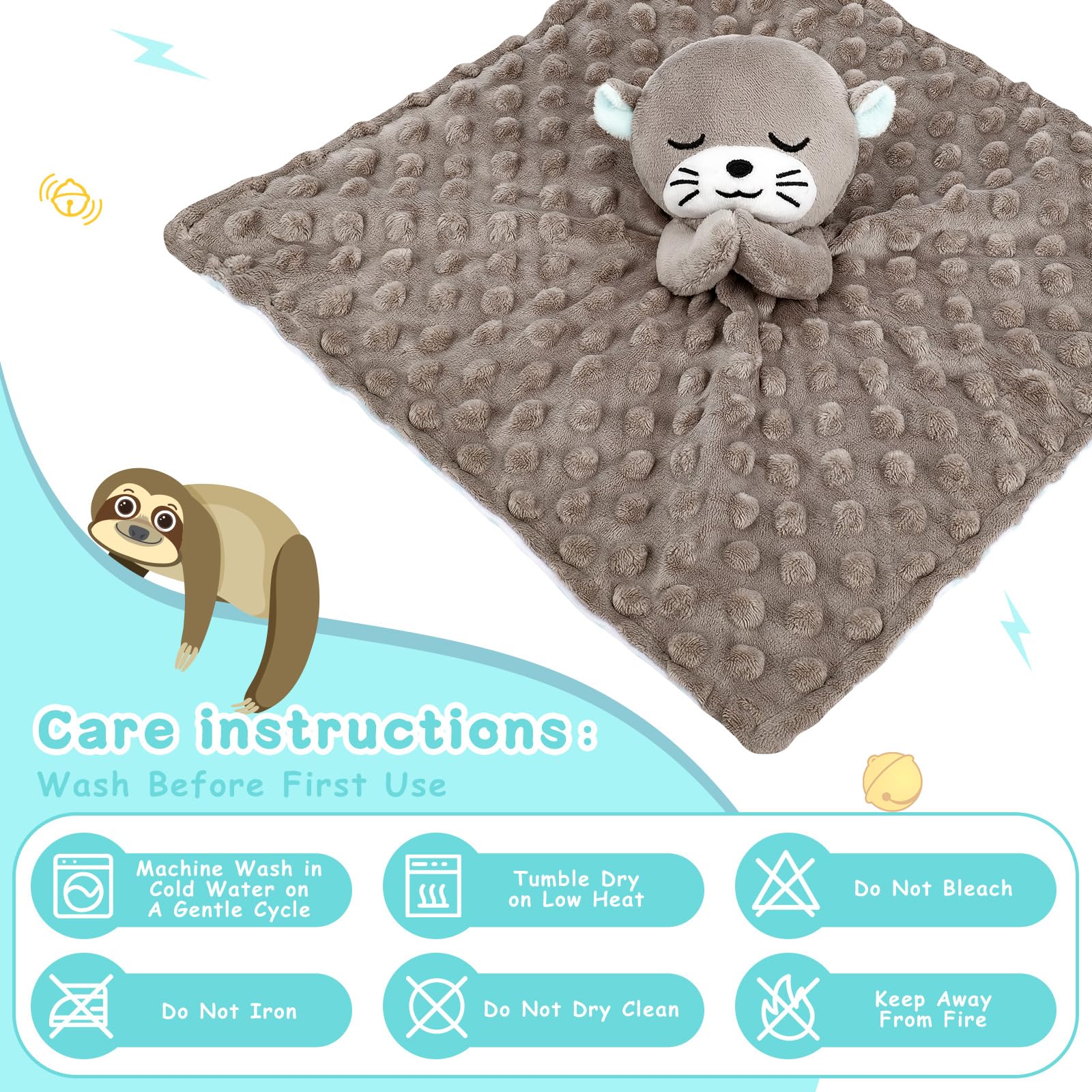 【Precautions for Otter Blankets】Security Blankets need to be cleaned before first use. They can be gently machine washed or hand washed with cold water, and then dried in a low-temperature dryer or placed in the sun to dry; Remember: Do not bleach, do not iron, do not dry clean, and keep away from sources of fire.