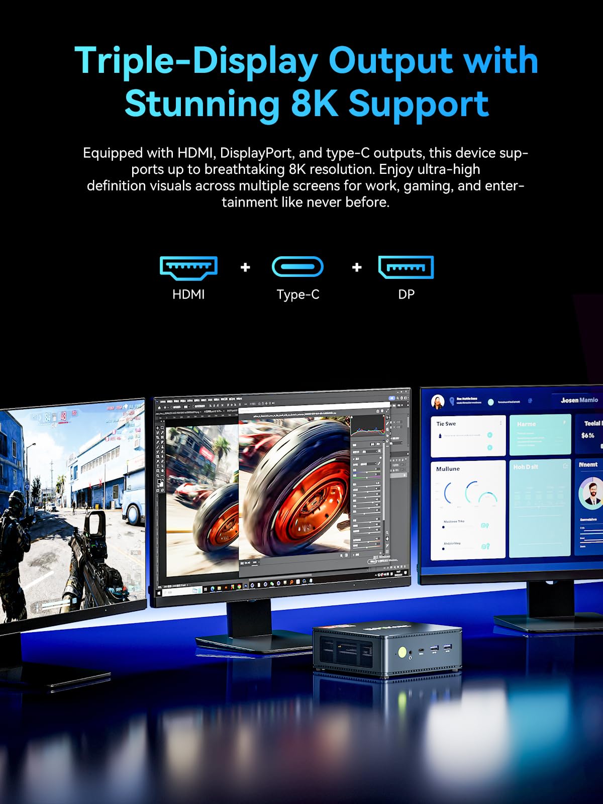 Mini Desktop Computer with 4K Triple Screen Display - Nucbox M5 Ultra integrates AMD Radeon Graphics 8 Cores 2000 MHz GPU to deliver powerful graphics processing power to easily handle the demands of complex design software, 4K@60Hz UHD video editing, and playback. It can connect to 3 display screens simultaneously.