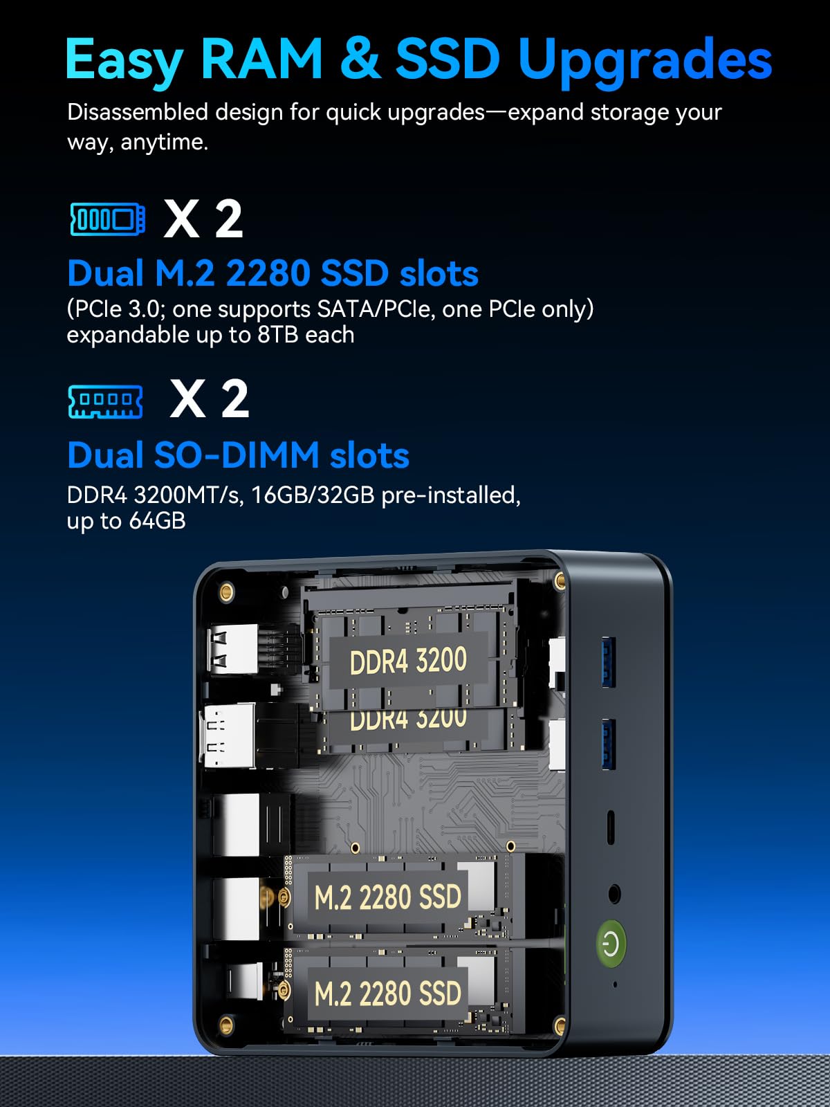 16GB DDR4 RAM & 512GB PCIe SSD - Installed with DDR4 16GB RAM Dual Channel (2x8GB), the Nucbox M5 Ultra mini pc support expansion to 64GB RAM. Featured with 512GB M.2 2280 PCIe 3.0 SSD, support dual slot expansion each can be up to 8TB SSD. (Upgrades not included)