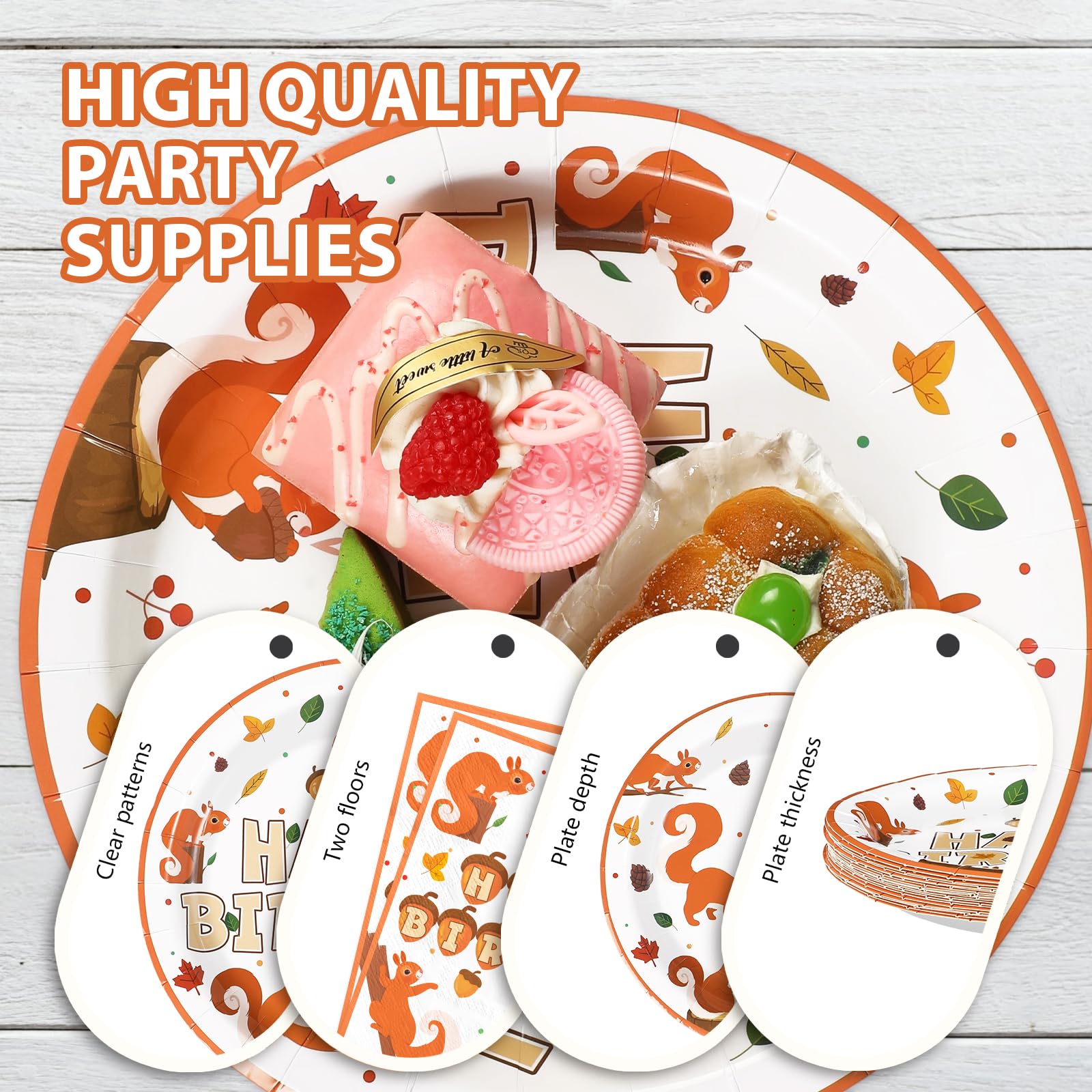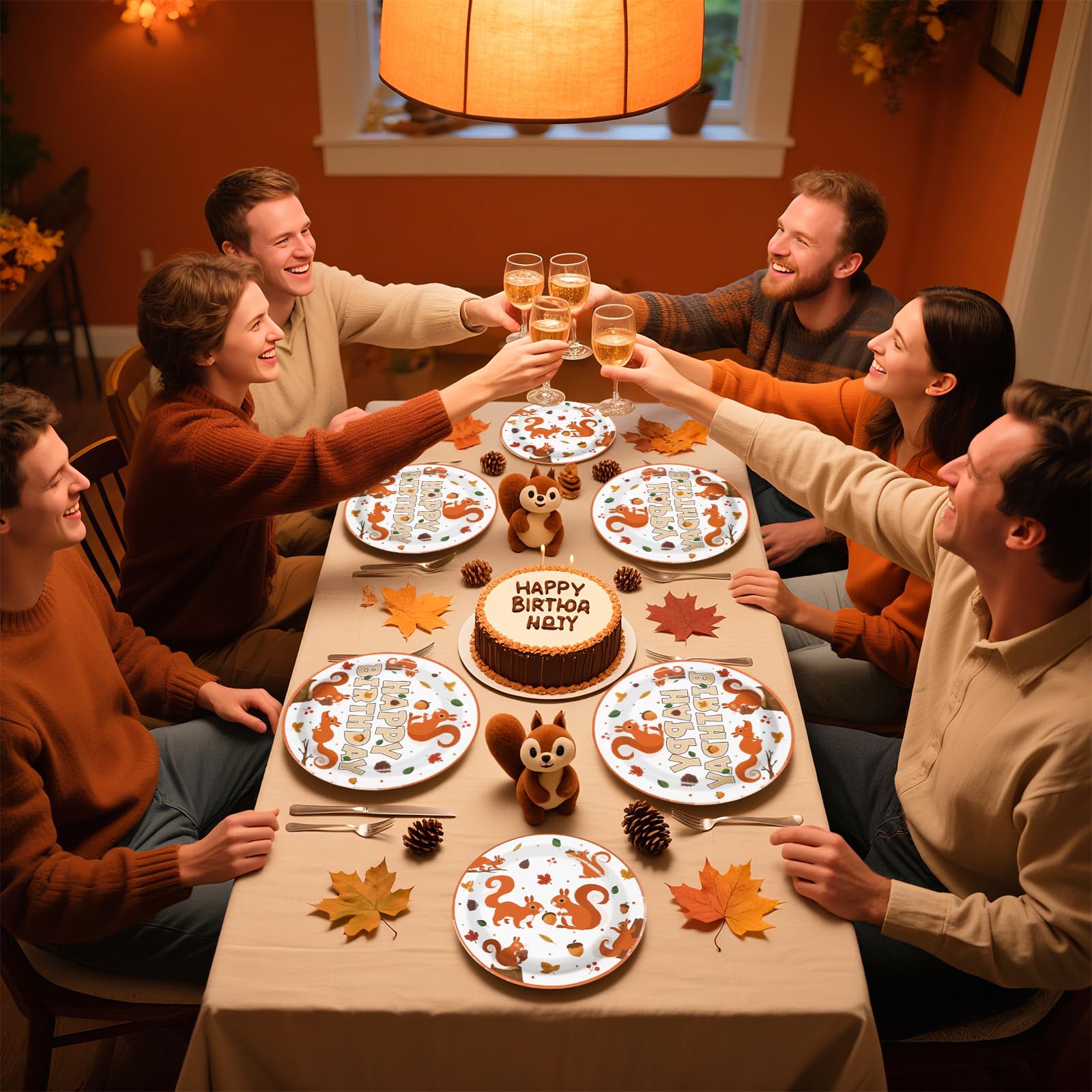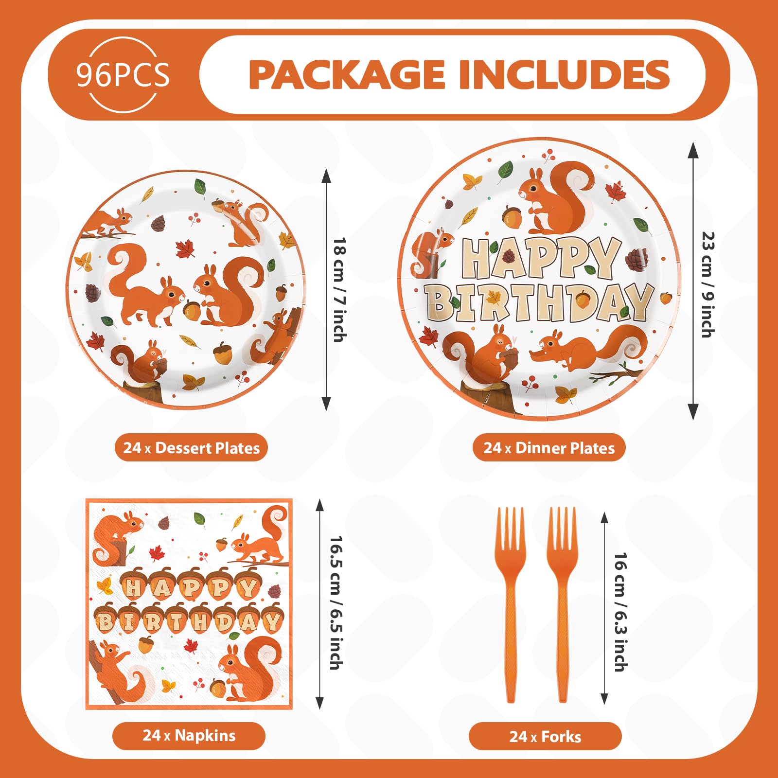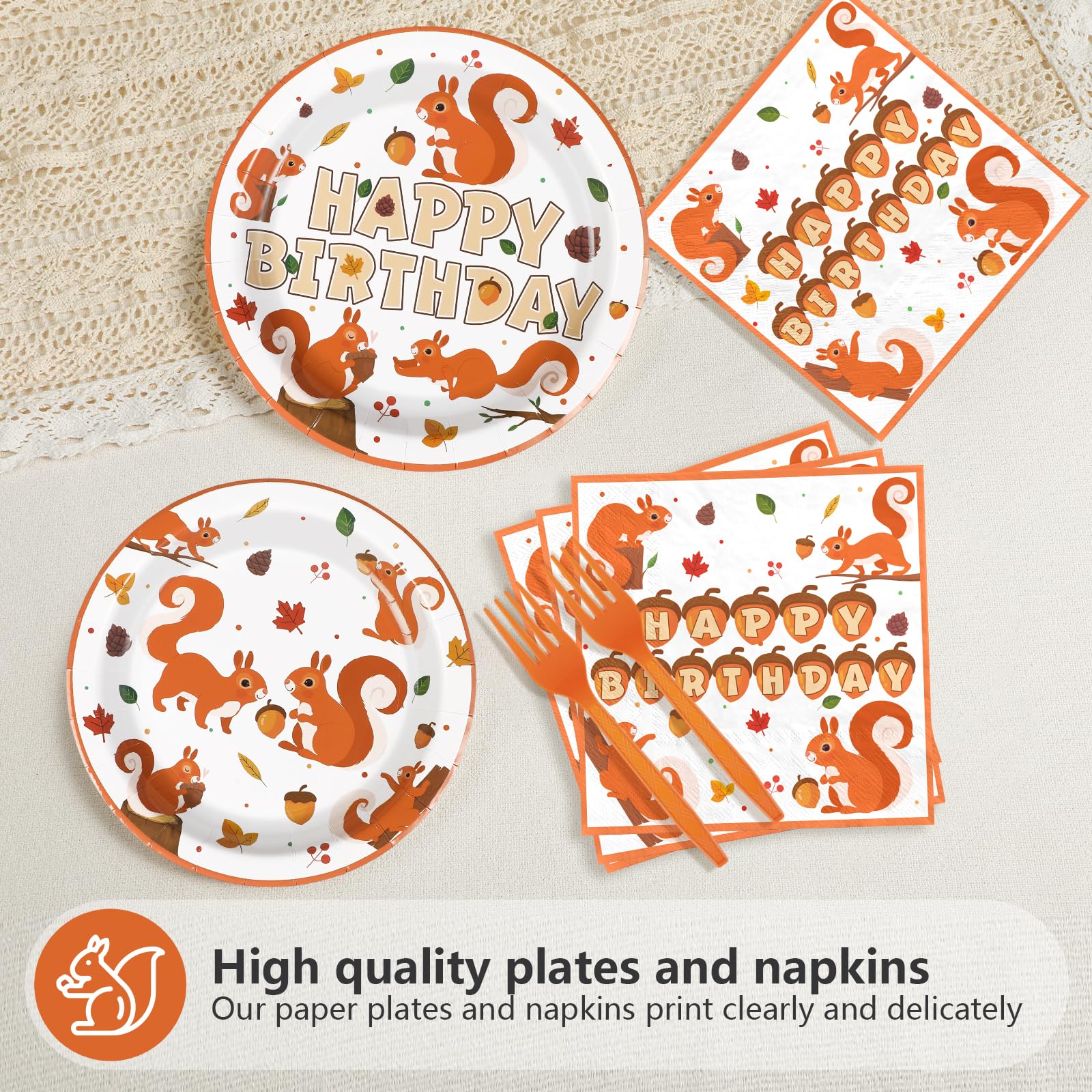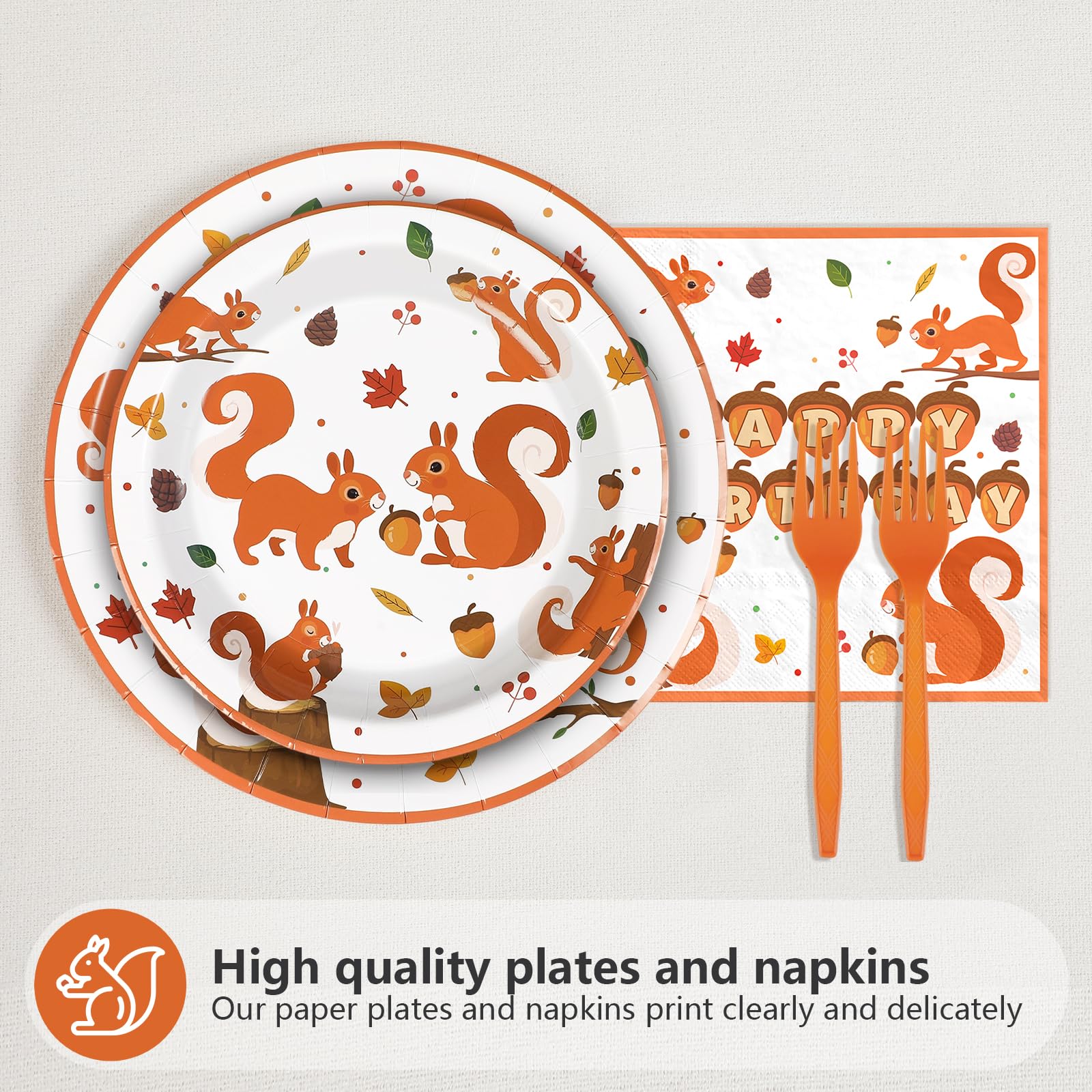 Grencian 96Pcs Fall Squirrel Paper Plates and Napkins Happy Birthday Squirrel Plates Thanksgiving Plate Animal Woodland Tableware for Girl Boy Baby Shower Birthday Party Decorations Serves 24