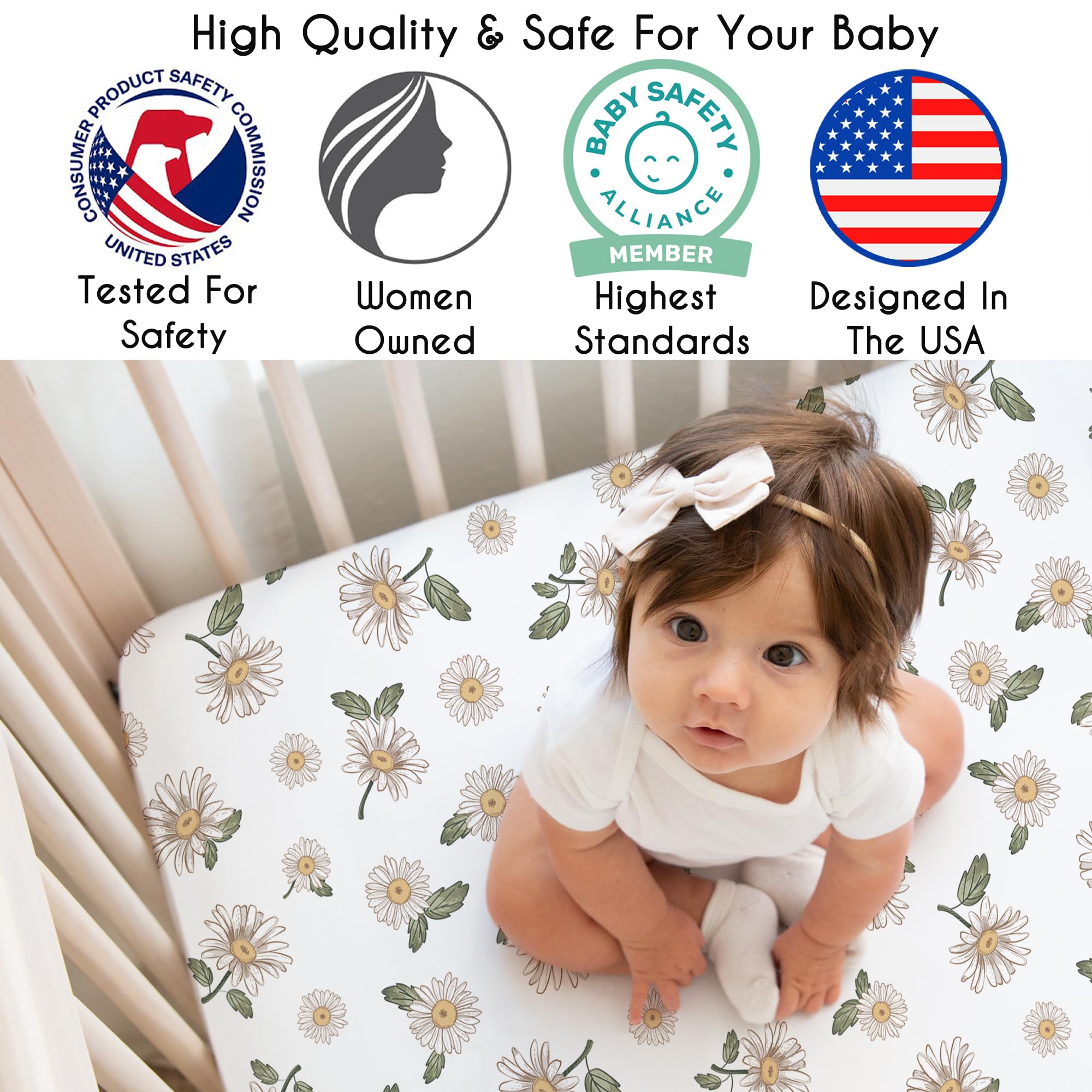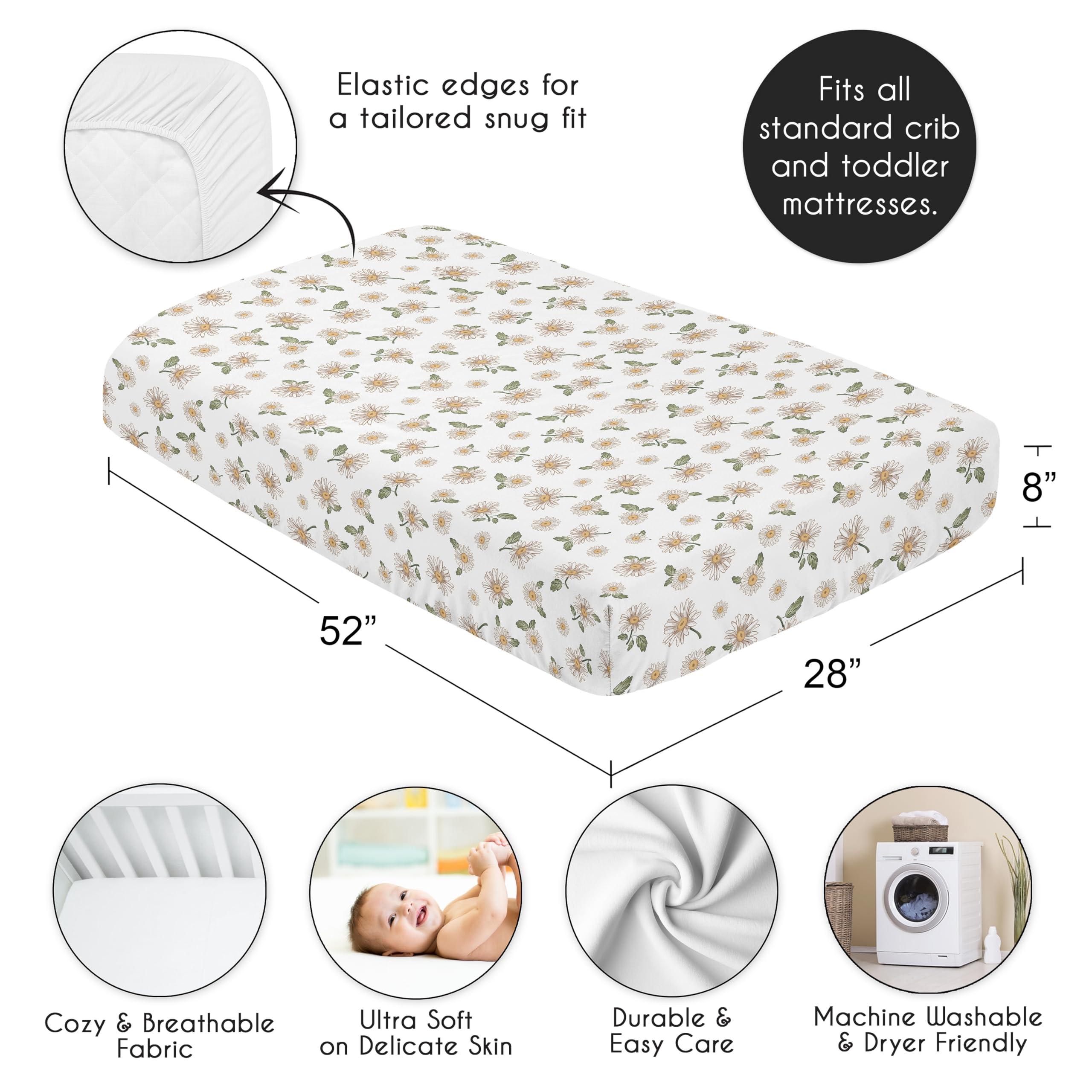 SNUG FIT: Includes (1) Fitted Crib Sheet 52in. x 28in. x 8in. Our newborn standard crib sheets fit snugly, with premium elastic sewn around the entire bottom edge for a secure fit on most standard sized cribs and toddler beds, to reduce shifting and bunching. This vintage farmhouse brushed microfiber crib sheet features an exclusive design of yellow, green & white bohemian daisies, flower, daisy floral cottagecore print and is gentle on delicate skin to foster a soothing sleep environment.