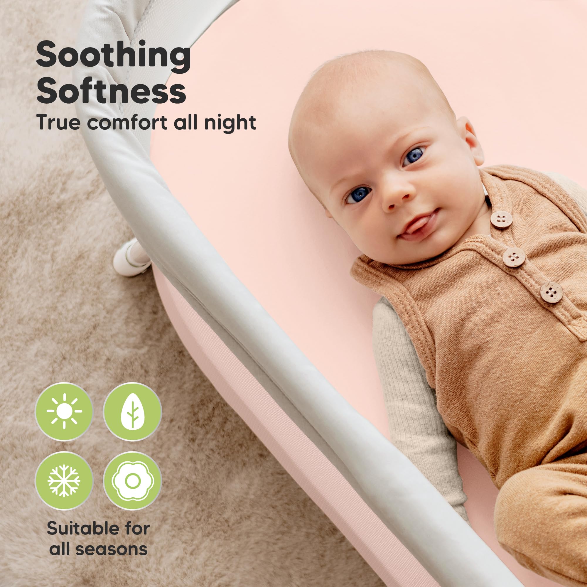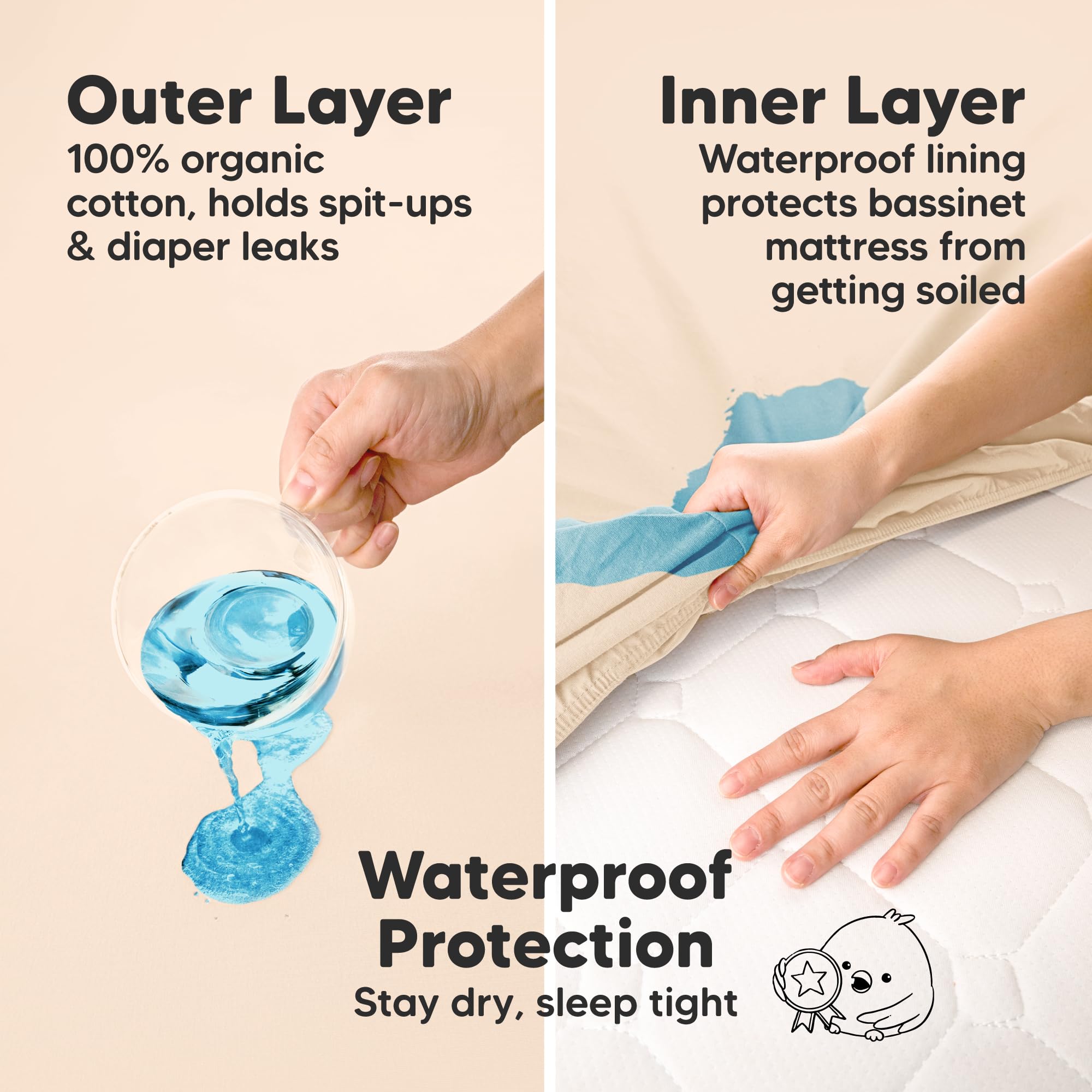 100% Waterproof - The Soothe Protect+ Waterproof Bassinet Sheets feature a built-in waterproof lining that quietly protects mattress from accidents, spills, and stains, all without compromising on comfort. No need for bulky padded mattress protector.