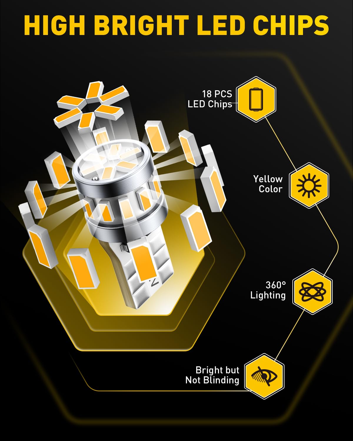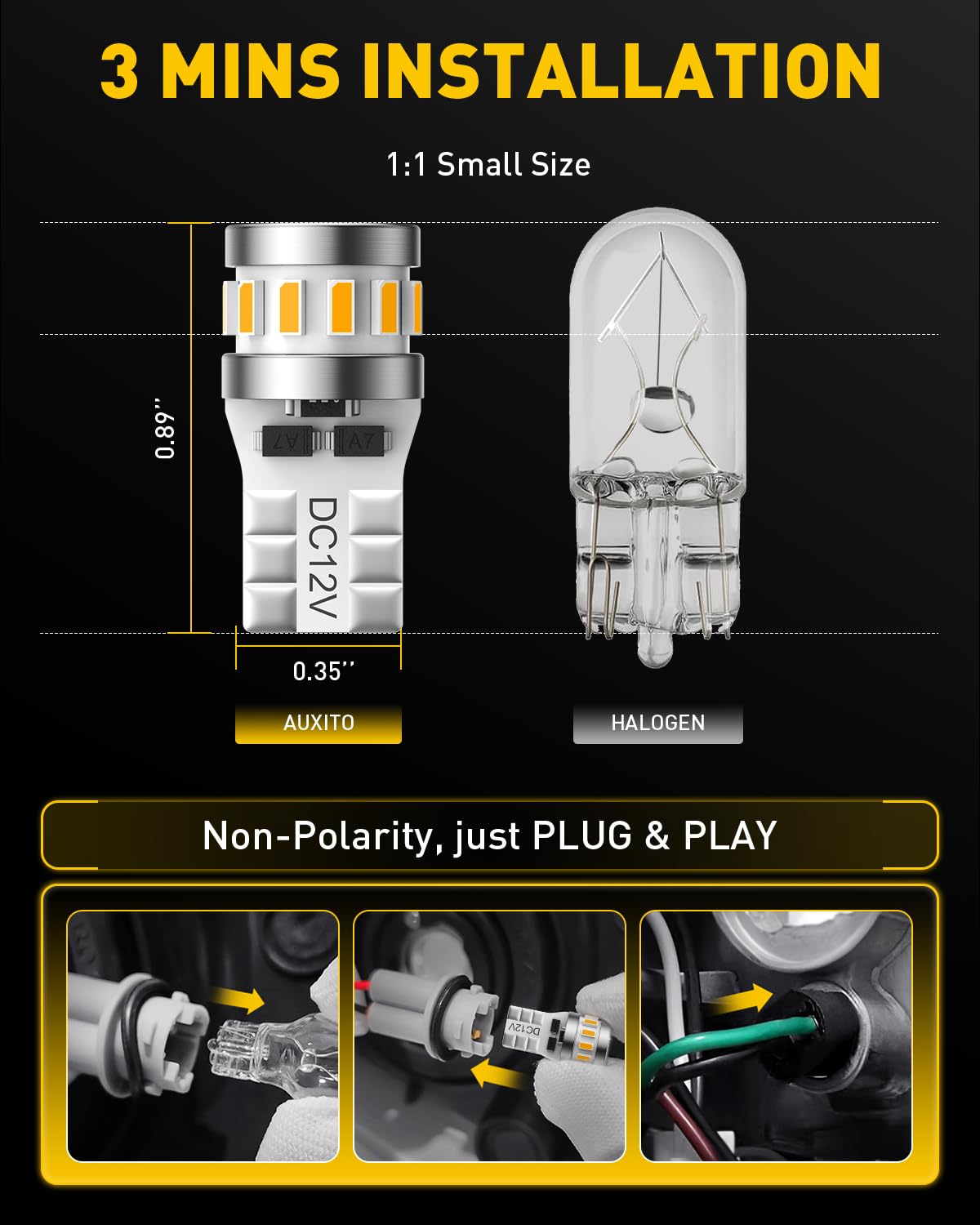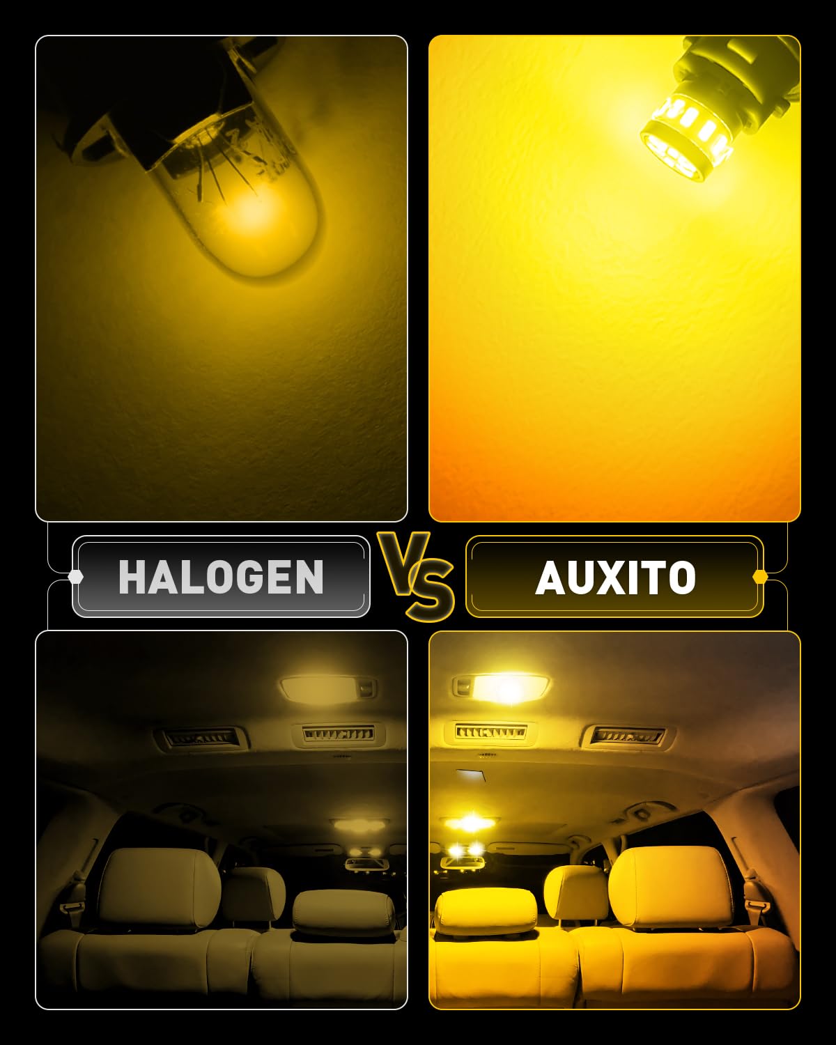 400% Brighter: AUXITO 194 led bulb amber uses 18pcs high performance LED chips, generating super bright amber yellow output, 360 ° lighting, no dark spots. Bring bright light and new look to your car.