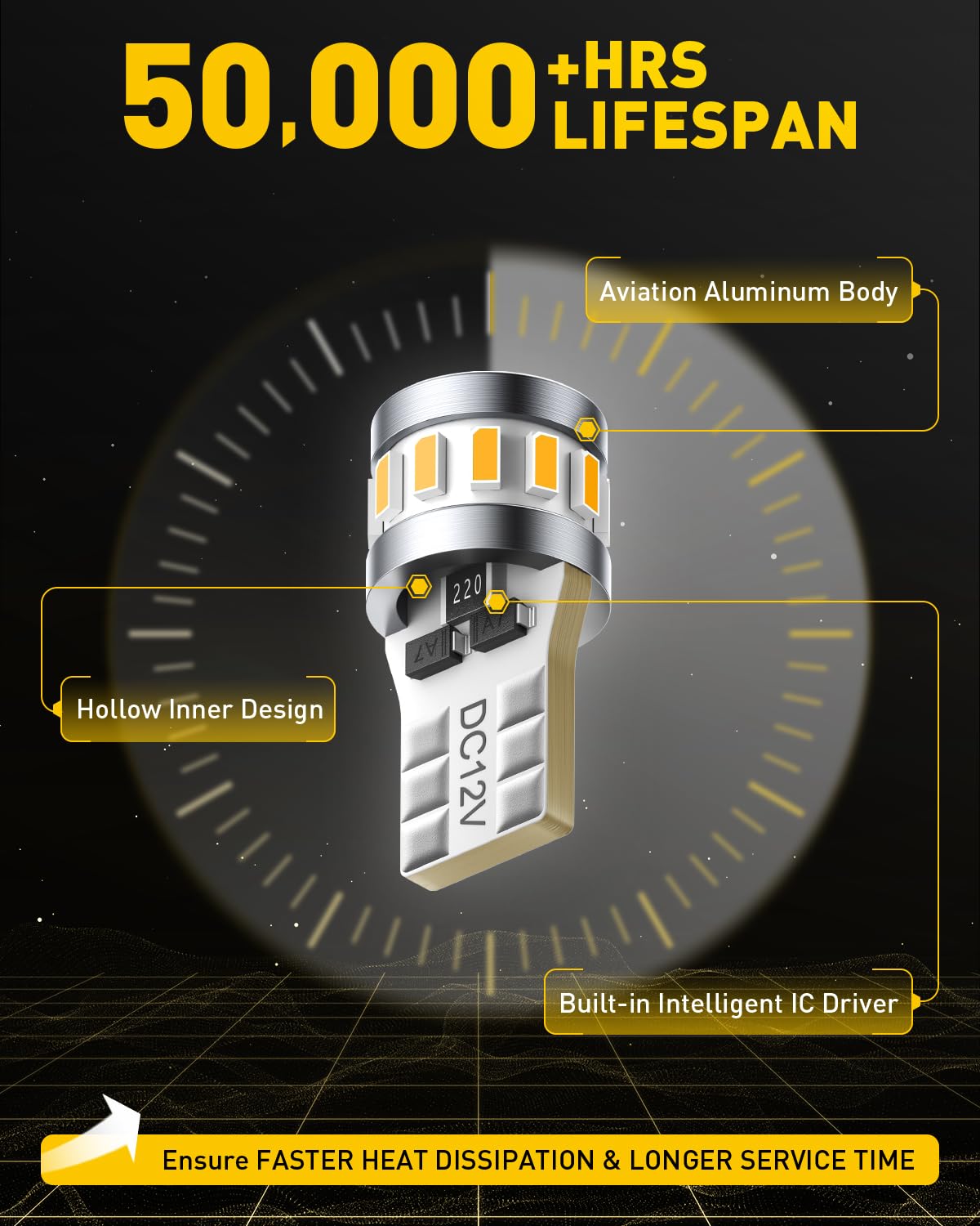 50,000 Hours Lifespan: Whole aviation aluminum body and hollow inner design diverts heat away from the light's critical components, our amber yellow194 led license plate light bulbs offer 50000hr lifetime, reducing the need for frequent replacements.
