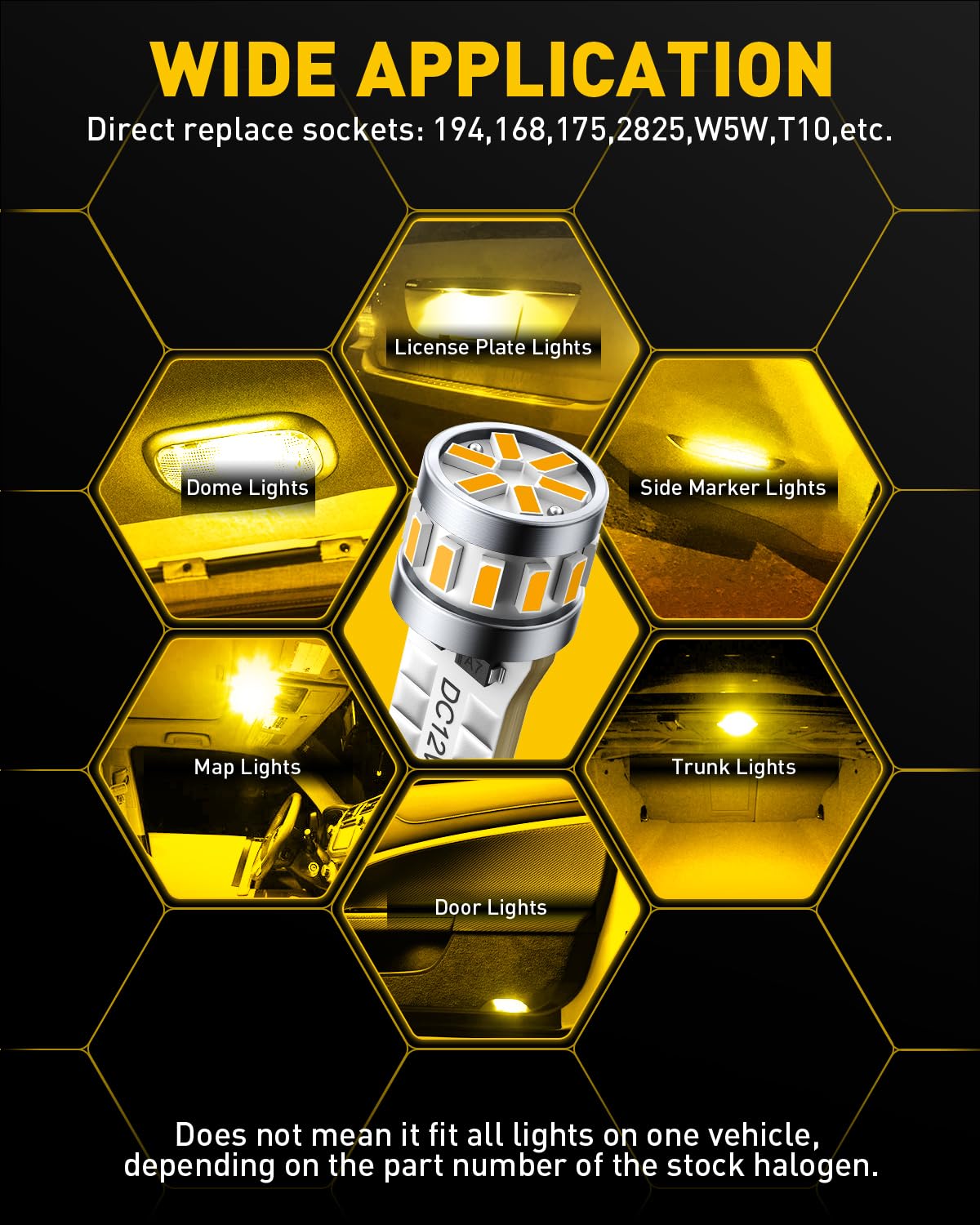 Wide Application: These 168 led amber bulb can be used for: license plate light, interior door light, dome light, parking light, side marker light, trunk cargo light, courtesy light, map light, glove box light, etc. NOTE: It doesn't mean these amber T10/194 LED bulbs fit every single position in a vehicle, please check the user manual or original bulb size before purchasing.