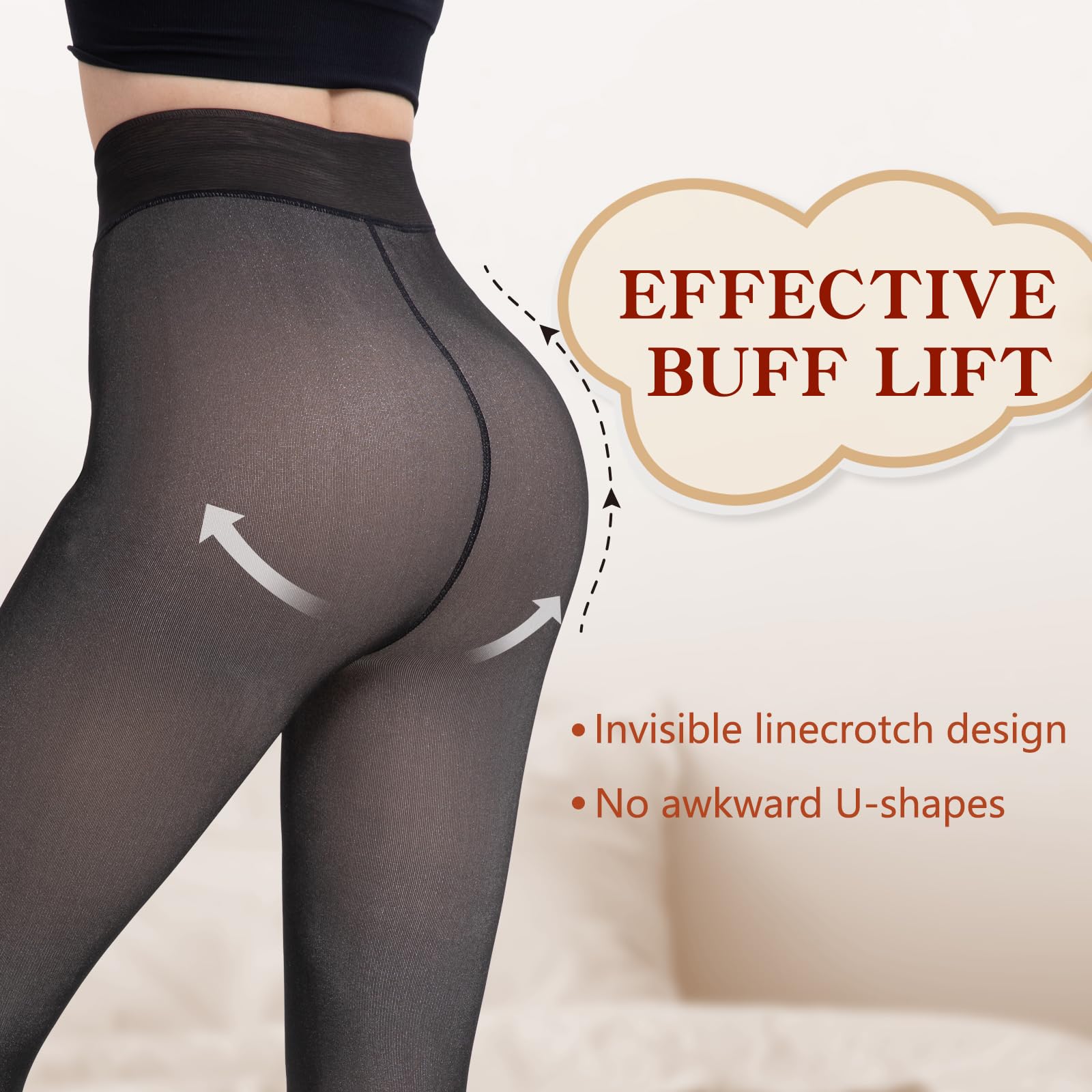 【Invisible Crotch Design】Our fleece lined tights feature an invisible single line crotch design, compared to other double lines crotch designs on the market, our fleece lined leggings highlights the lines of the buttocks and has a visual effect of lifting the hip and slimming the leg. The good elasticity of fleece tights can firmly tie the pants to your legs, preventing the crotch of the tight from slipping and falling off, not affecting your walking