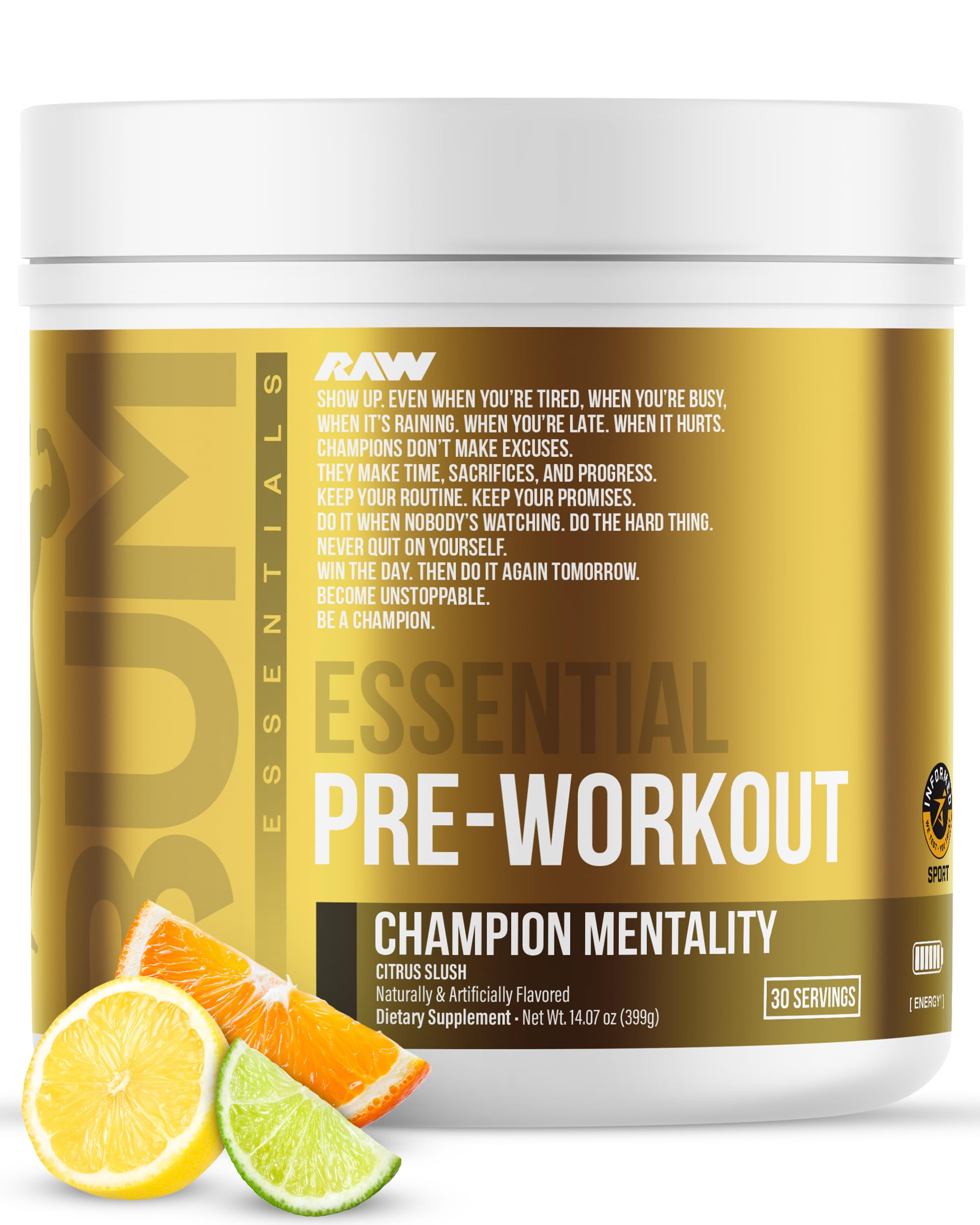 Champion Mentality Essential Pre-Workout: RAW Nutrition’s Essential Pre is a comprehensive pre-workout that’s perfect for all lifters, from beginner to advanced. Whether it’s your first day in the gym or you’re a seasoned veteran, these high-powered ingredients like L-Citrulline and Caffeine work the same. 30 servings, 14.92 oz.