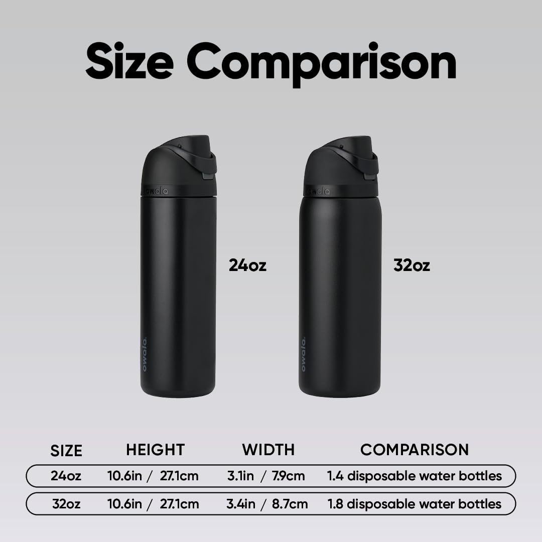 The Owala FreeSip Insulated Stainless-Steel Water Bottle with Locking Push-Button Lid easily tackles every thirst. With a built-in, easy-clean straw and a wide-mouth opening, the FreeSip reusable bottle is designed for drinking two different ways: sipping upright through the straw or tilting back to swig from the wide-mouth spout opening. Add in a push-to-open lid and playful colors, and staying hydrated has never been simpler—or more fun. Additional features include double-wall insulated stainless steel that keeps drinks cold up to 24 hours, a carry loop that doubles as a lock, a cup holder-friendly base, and a wide opening for easy cleaning and adding ice. The Owala FreeSip Insulated Stainless-Steel Water Bottle with Locking Push-Button Lid is available in three sizes: 24-Ounce, 32-Ounce, and 40-Ounce. Lid is dishwasher safe; hand wash cup. Not for use with hot liquids. Manufacturer’s limited lifetime warranty.