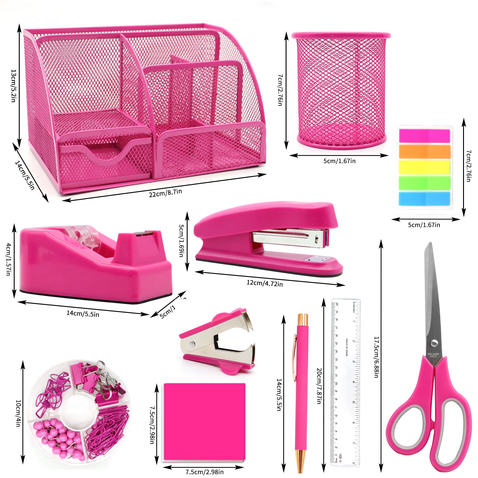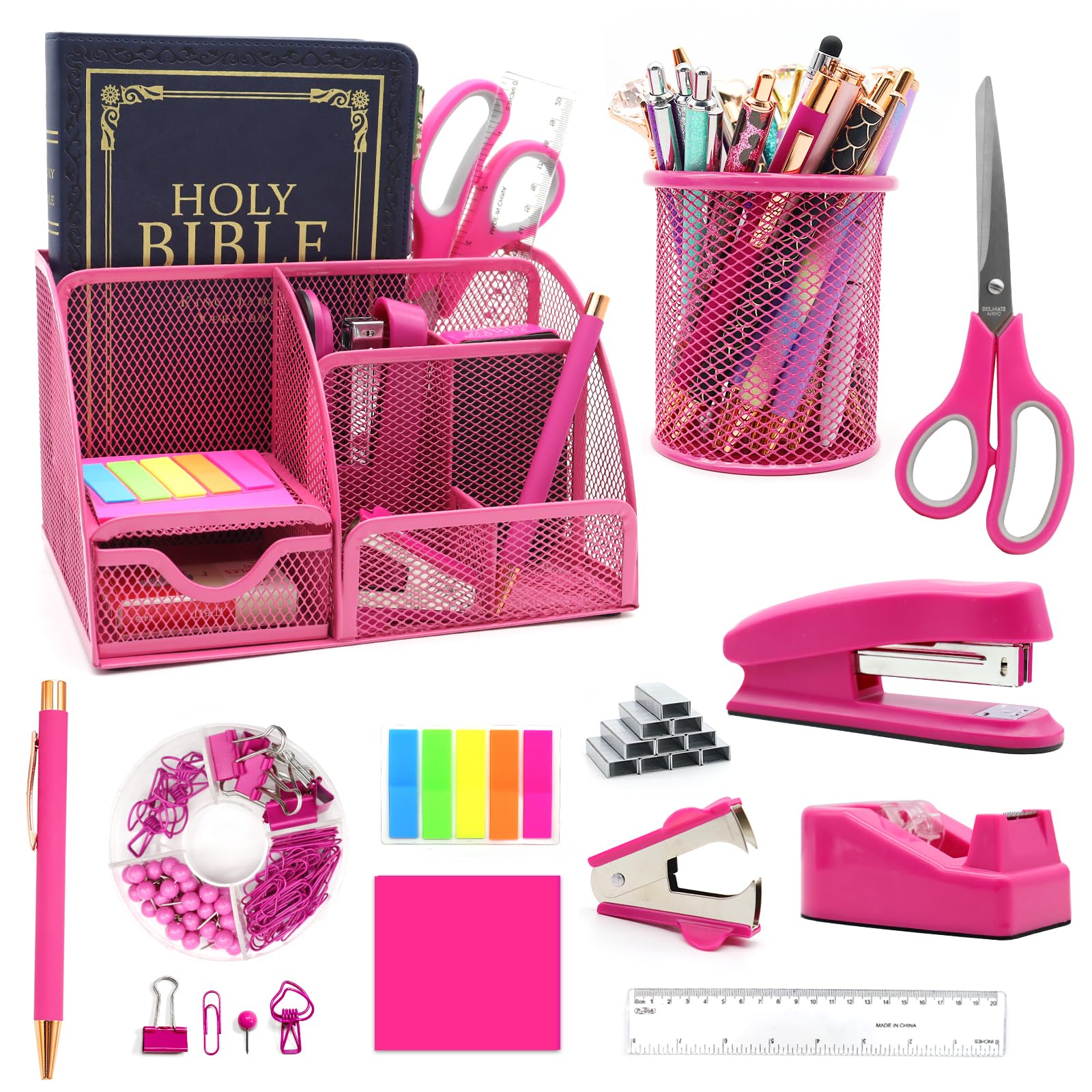 📣12 in 1 Buy with More Affordable📣You can buy Hot Pink desk organizers and accessories what you need for your office at once instead of buying each item individually. Not only does this save you the hassle of purchasing, it can also save you some money. You will receive 1x Hot Pink mesh desk organizer with drawer, 1x pen holder, 1x tape holder, 1x stapler, 1000x staples, 1x staple remover, 1x scissor, 1x ruler, 20 x Push pins 7 x Big Clips 15 x Small Clips 30 x Paper Clips, 1x Hot Pink pen, 1x sticky note, 1x tabs sticker.
