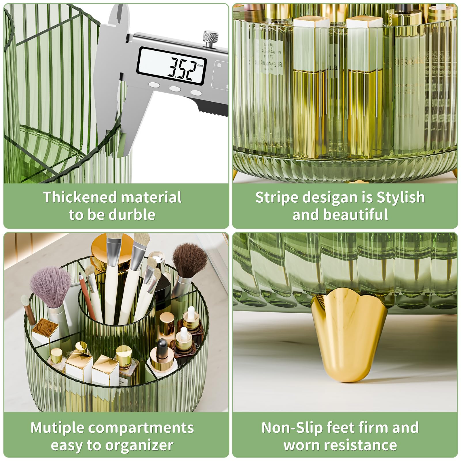 【CLEAR AND BEAUTY】Our makeup organizer own a transparent high-quality design, you can clearly catch what you need only by rotating the holder. The combination of clear apperance and gold feet is beautiful and durable which must be the best charming ornament for any countertop, vanity, or dresser