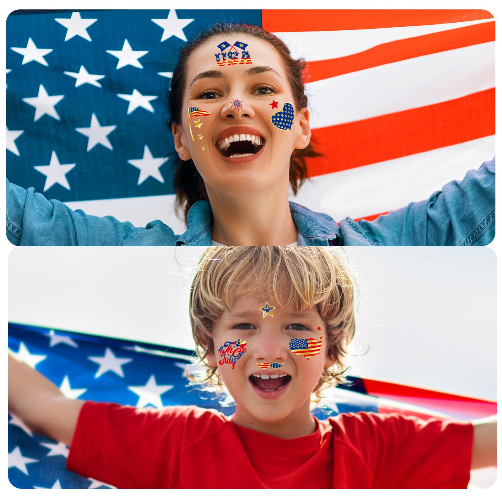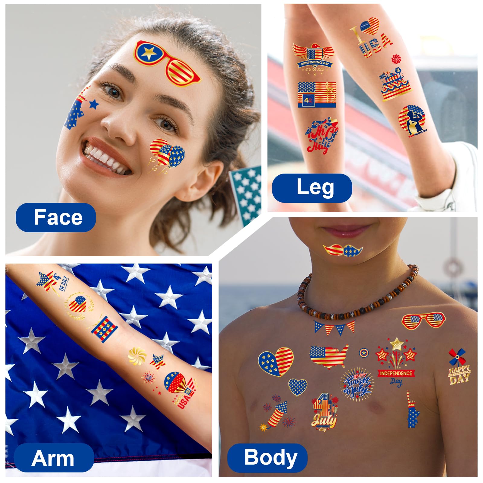 Waterproof Temporary Tattoos: These are great 4th of July party favors, supplies, waterproof, sweat-resistant, and made from skin-safe material; they are safe to apply to face, cheeks, hands, and arms with water.Long-lasting and complete patterns