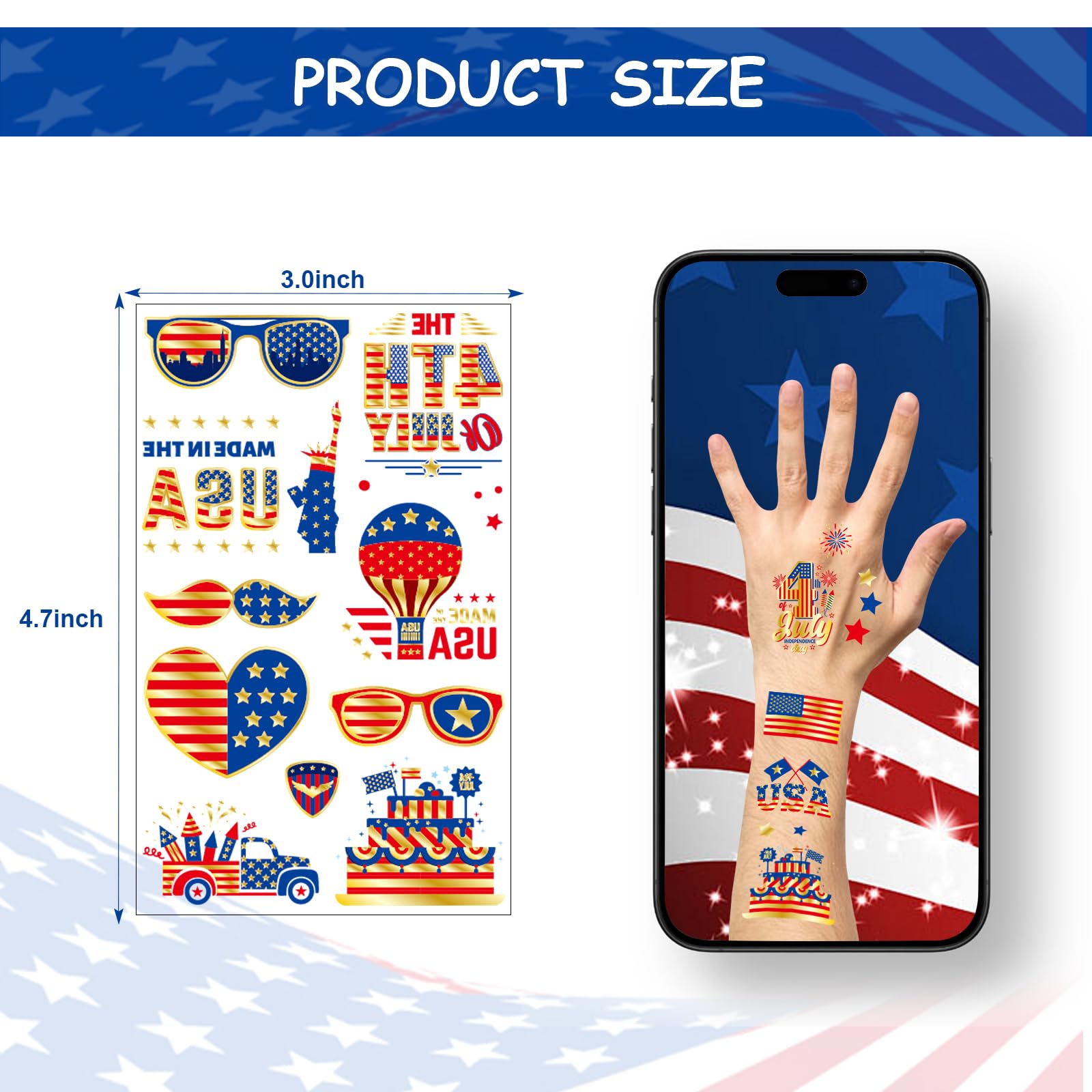 4th of July Accessories: There are 10 sheets of 100 pcs 4th of July tattoos, with vibrant colors and great patriotic designs like fireworks, flag. The gold accents shimmered and looked great, Perfect for celebrating Independence Day in style
