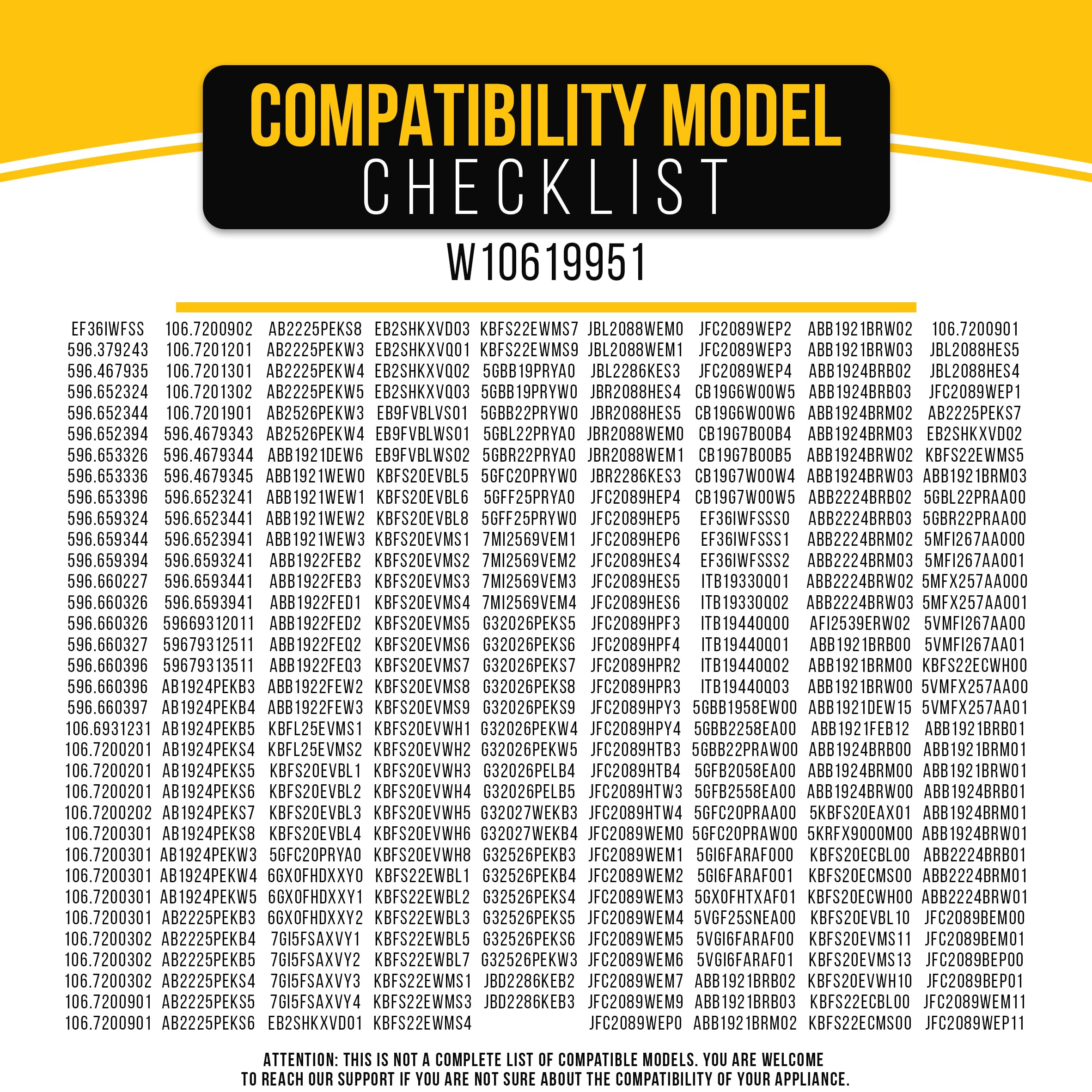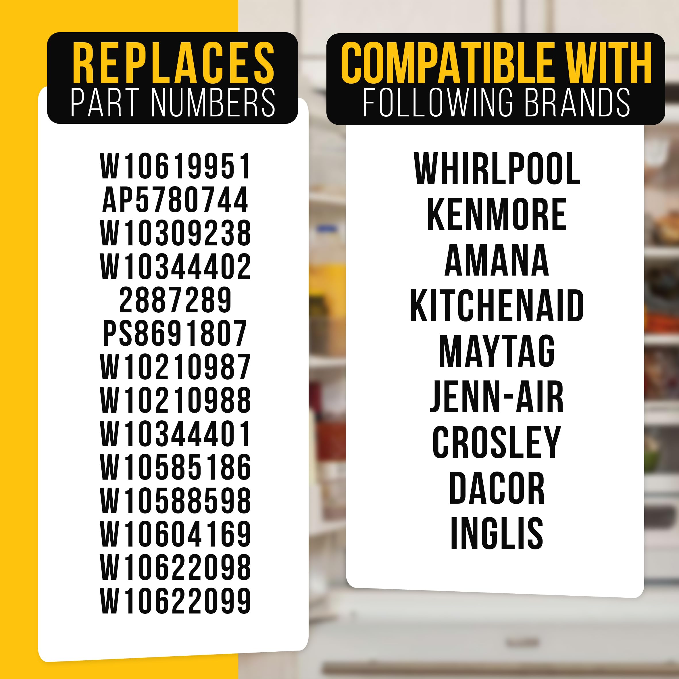This product is compatible with Maytag, Kenmore, KitchenAid and Whirlpool W10619951 Refrigerators, ensuring a seamless fit and efficient operation across multiple refrigerator models.