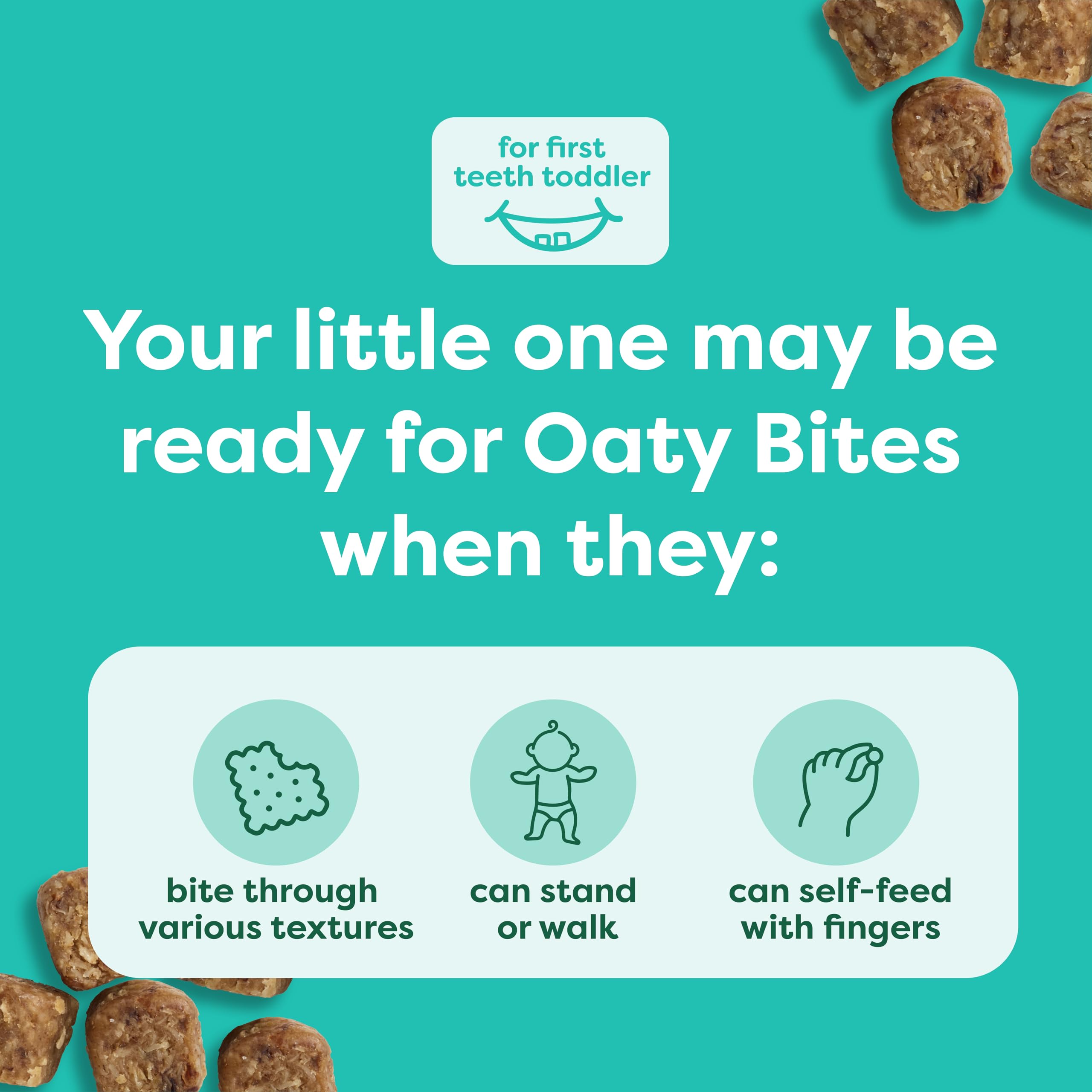 STAGE 4 TODDLER SNACK: This Stage 4 toddler snack is ideal for children 12 months and up. Your little one may be ready for Oaty Bites when they can bite through various textures, can stand or walk, and can self-feed with fingers.