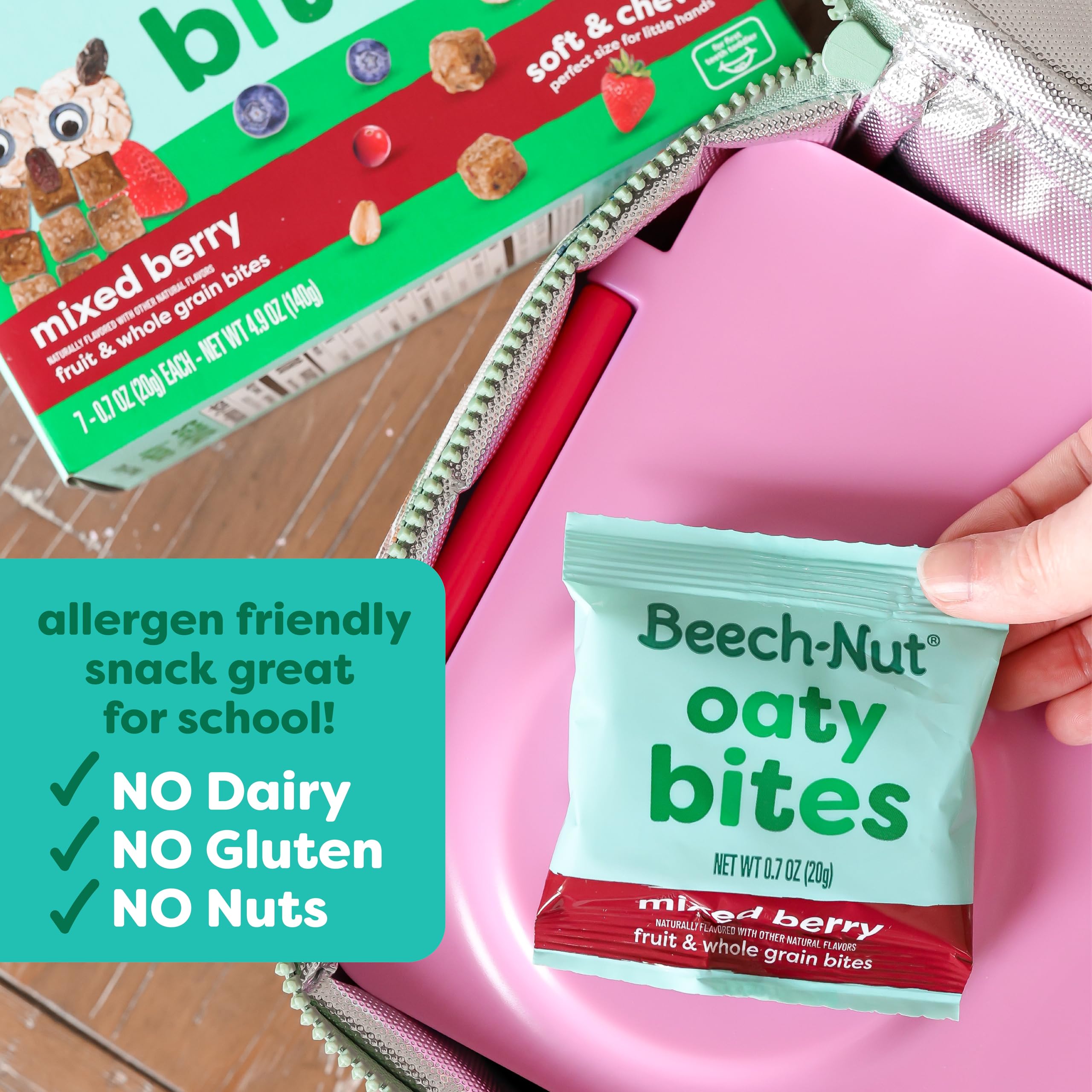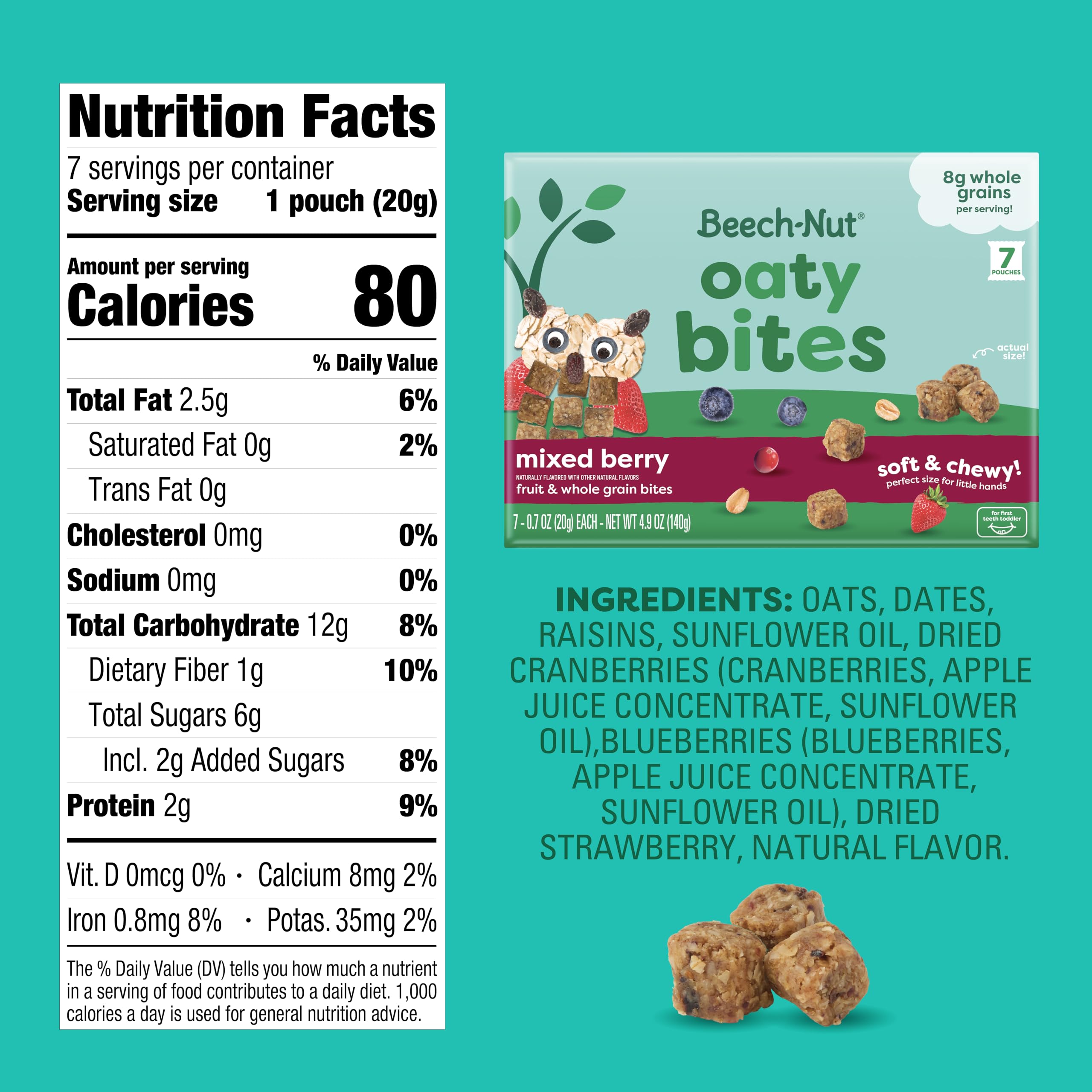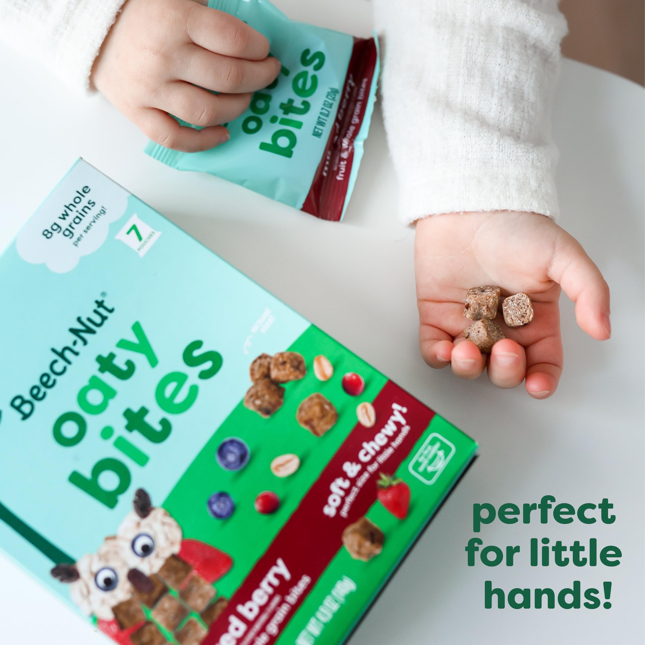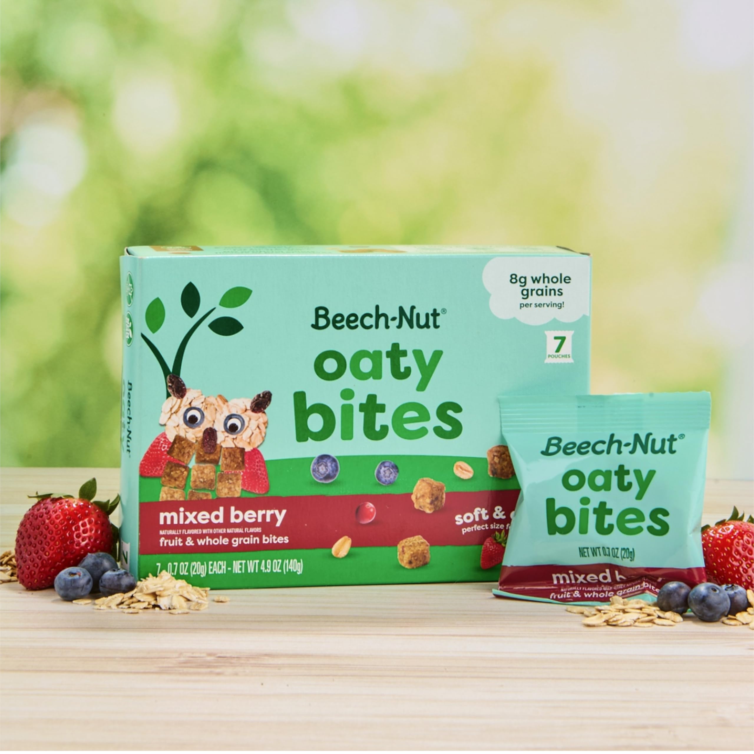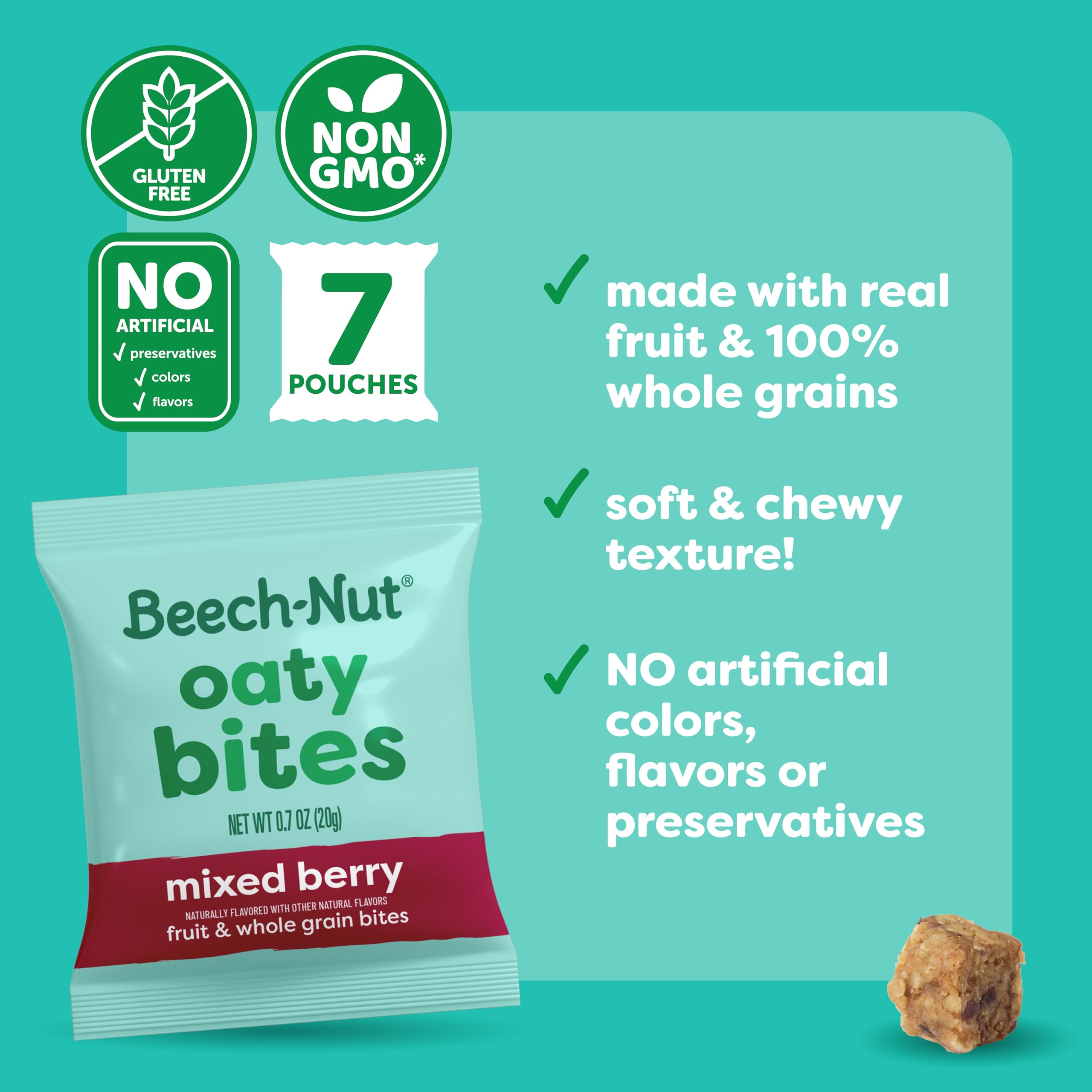 MIXED BERRY OATY BITES: Beech-Nut Oaty Bites are a deliciously chewy, bite-sized snack for toddlers made with fruit and 8 grams of whole grains per serving. Great for self-feeding and snacking on the go, Oaty Bites are softer than traditional granola bites, making them easier for young toddlers to chew.
