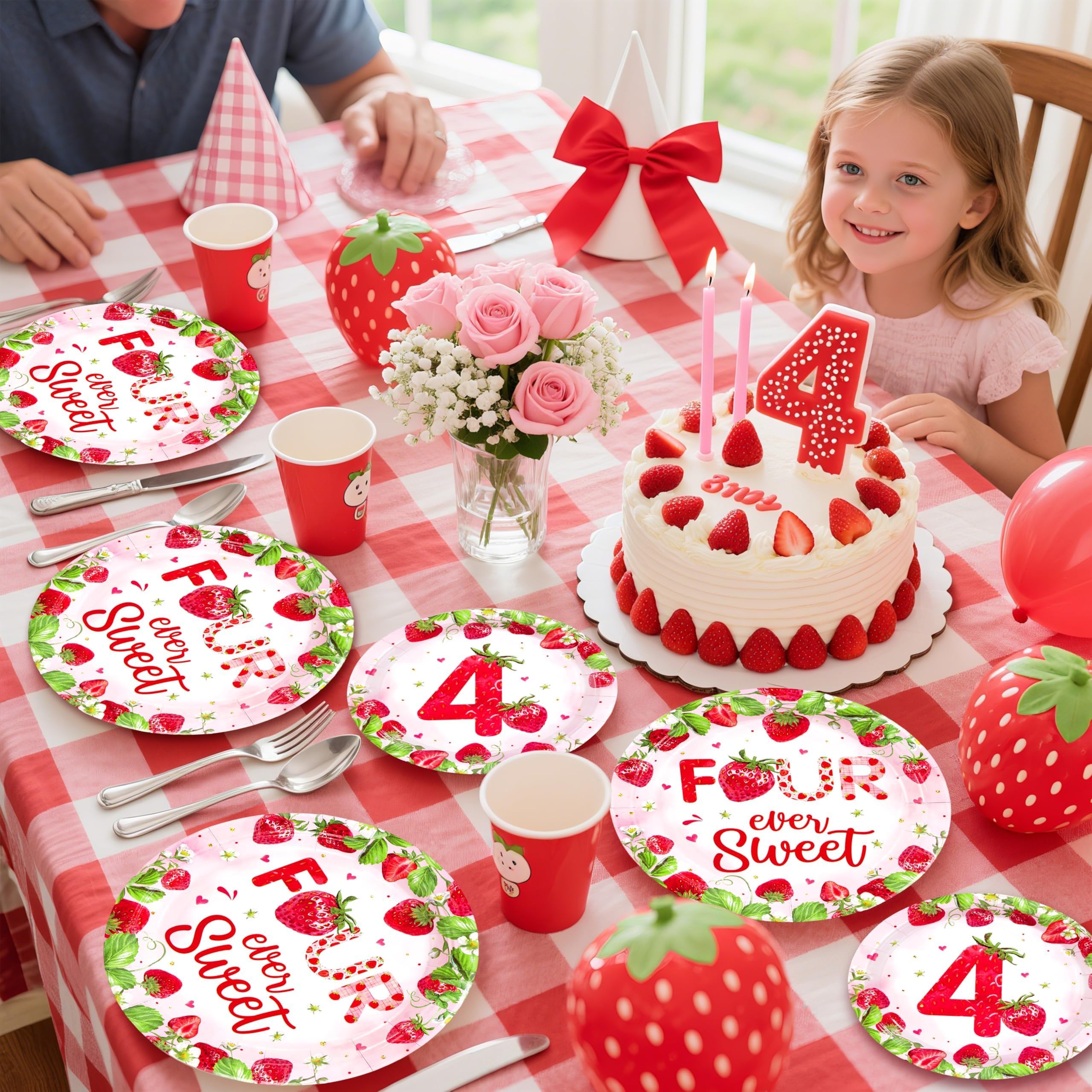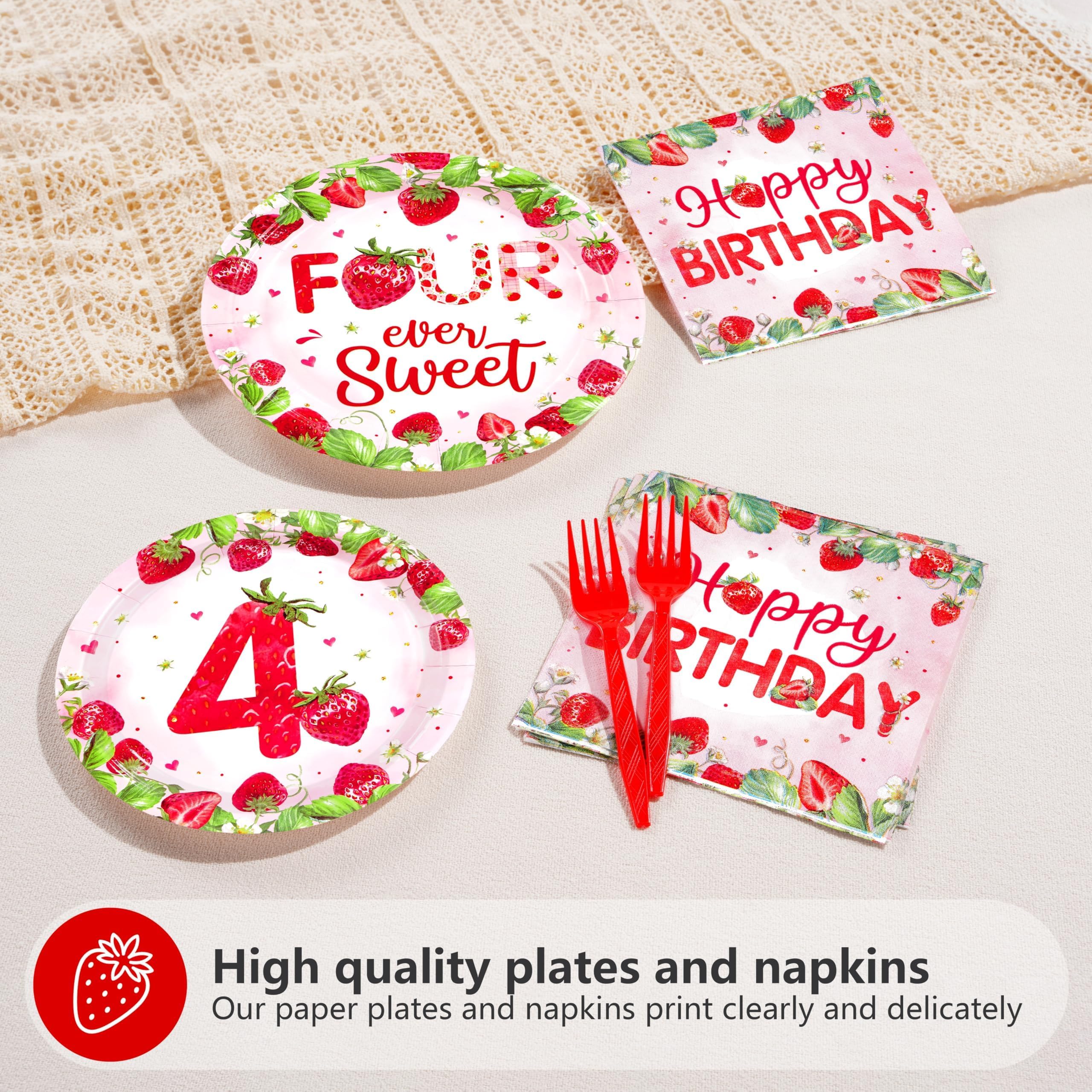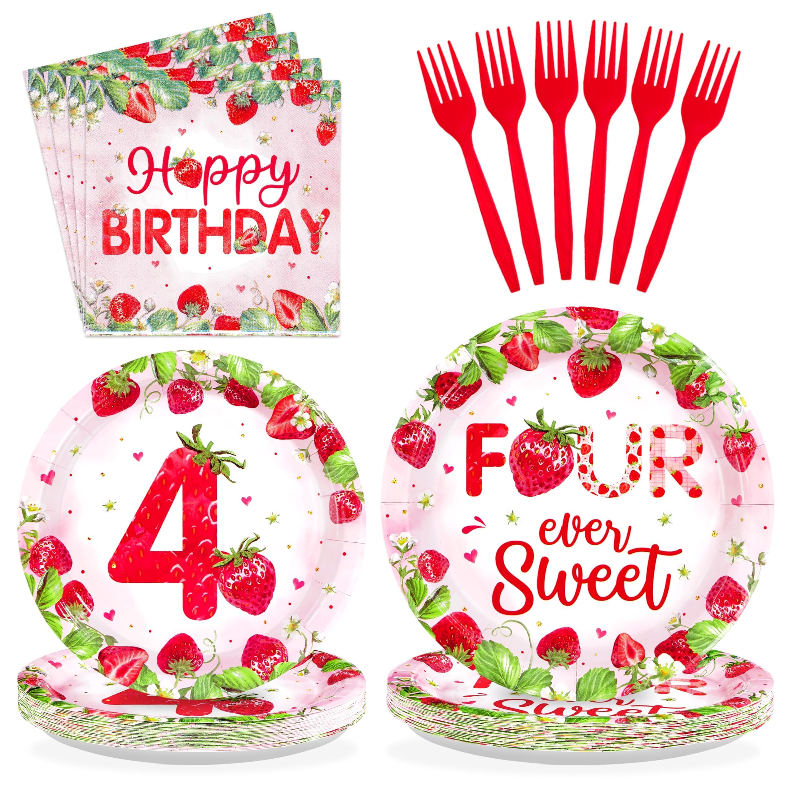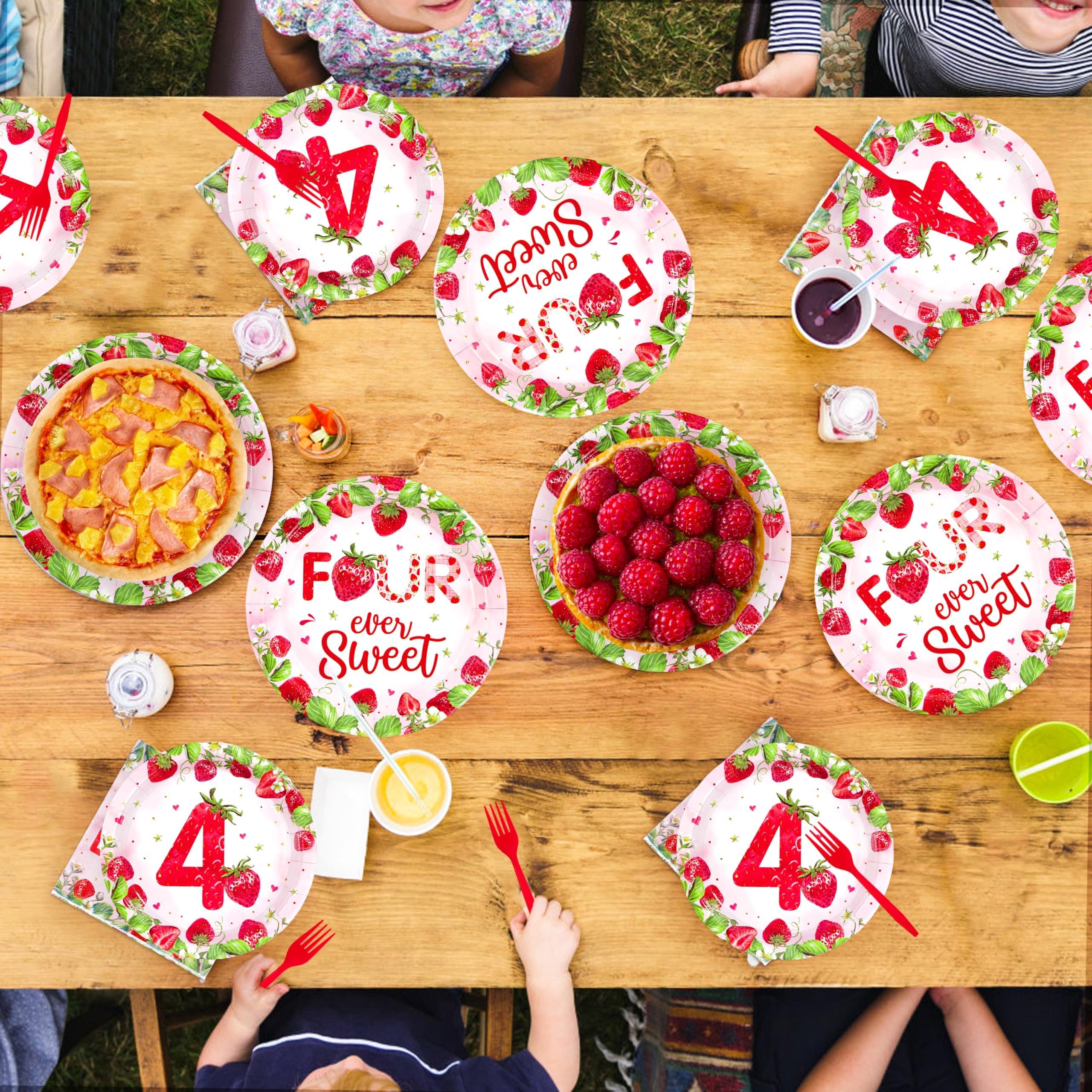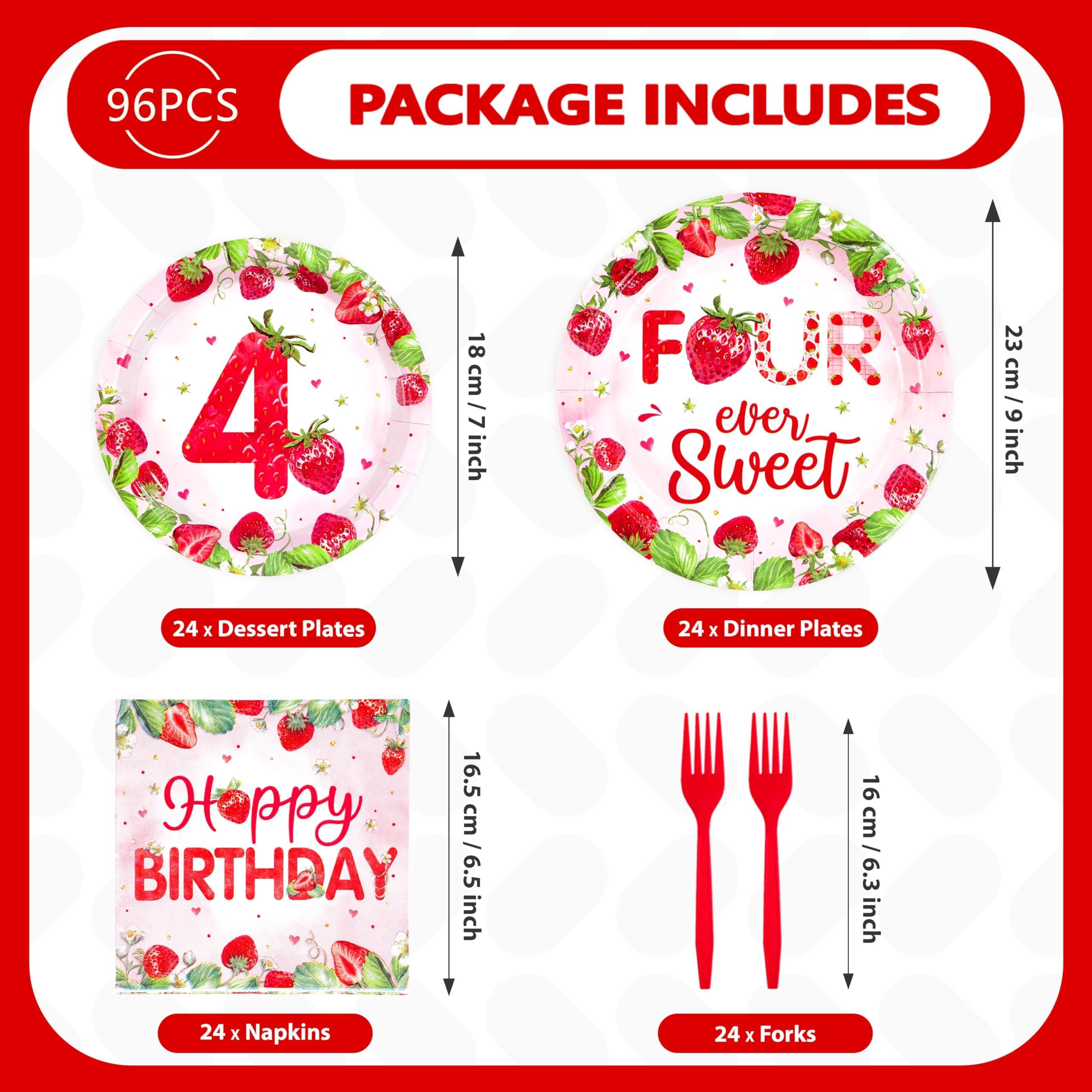Strawberry 4th Birthday Party Supplies: Our 96 pcs strawberry themed tableware set includes 24 9" birthday dinner plates, 24 7" strawberry dessert plates, 24 strawberry printed napkins and 24 forks. Capable of serving 24 guests, this strawberry decorated dinnerware, designed for the βFour-ever Sweetβ birthday celebration, provides the perfect party experience