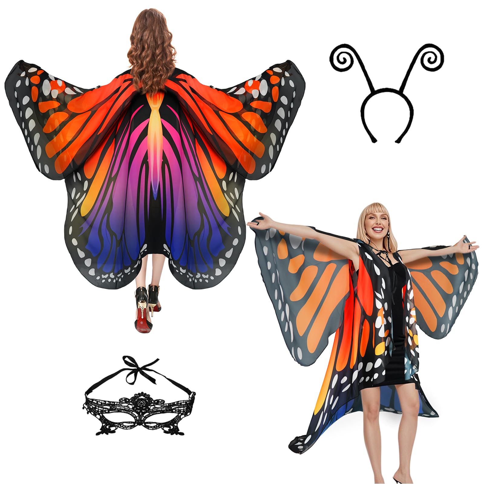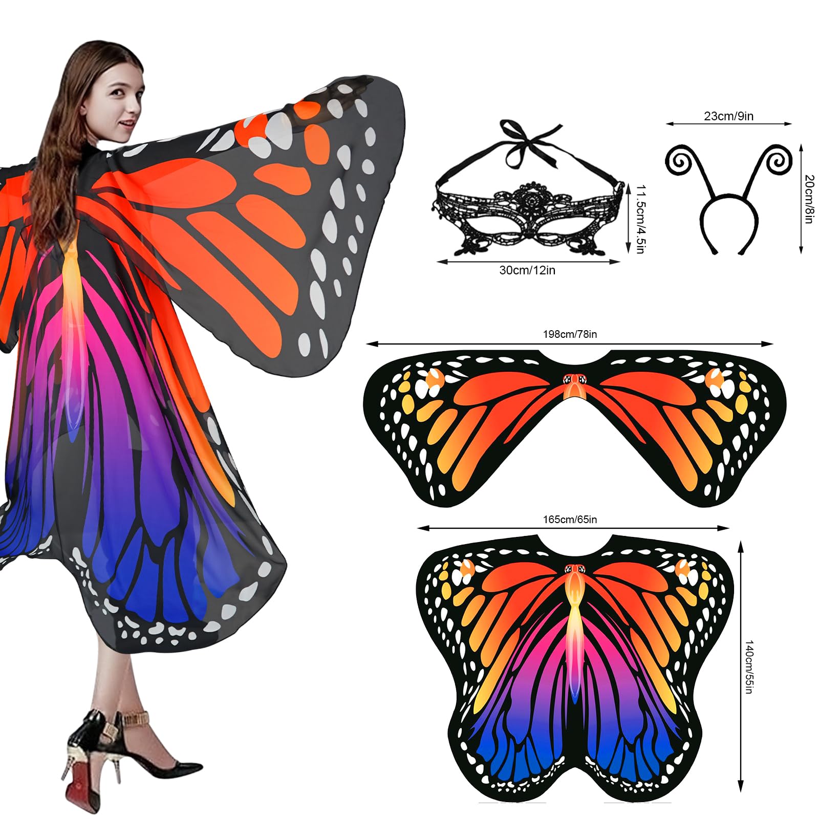 Description Halloween Women’s Set: 1 x Innovatively designed butterfly double-layer wings shawl, 1 x antennae headband and 1 x lace mask make you look even more mysterious and charming at the party! Material: The butterfly costume is made of high-quality light chiffon fabric that will not fade; the tentacle headband is made of velvet and plastic, which is strong and does not break easily; the mask is made of lace and soft to the skin. Suitable sizes: Butterfly wing shawl is about 78*55 inches, butterfly cloak is larger, and may not be suitable for children under 15 years old, tentacle headband height is about 30 cm/11.81 inches, lace mask size is about 12*4.5 inches Widely applicable to all occasions: Butterfly wings costumes are a great decoration for Halloween costumes, parties and beach decorations, and are also thoughtful gifts for mothers, lovers, family and friends. Light up your party: These butterfly costumes are designed in the shape of butterfly,which are cute and fun, and you can wear them on different occasions such as Halloween, Christmas, parties, carnivals, and show your vitality .