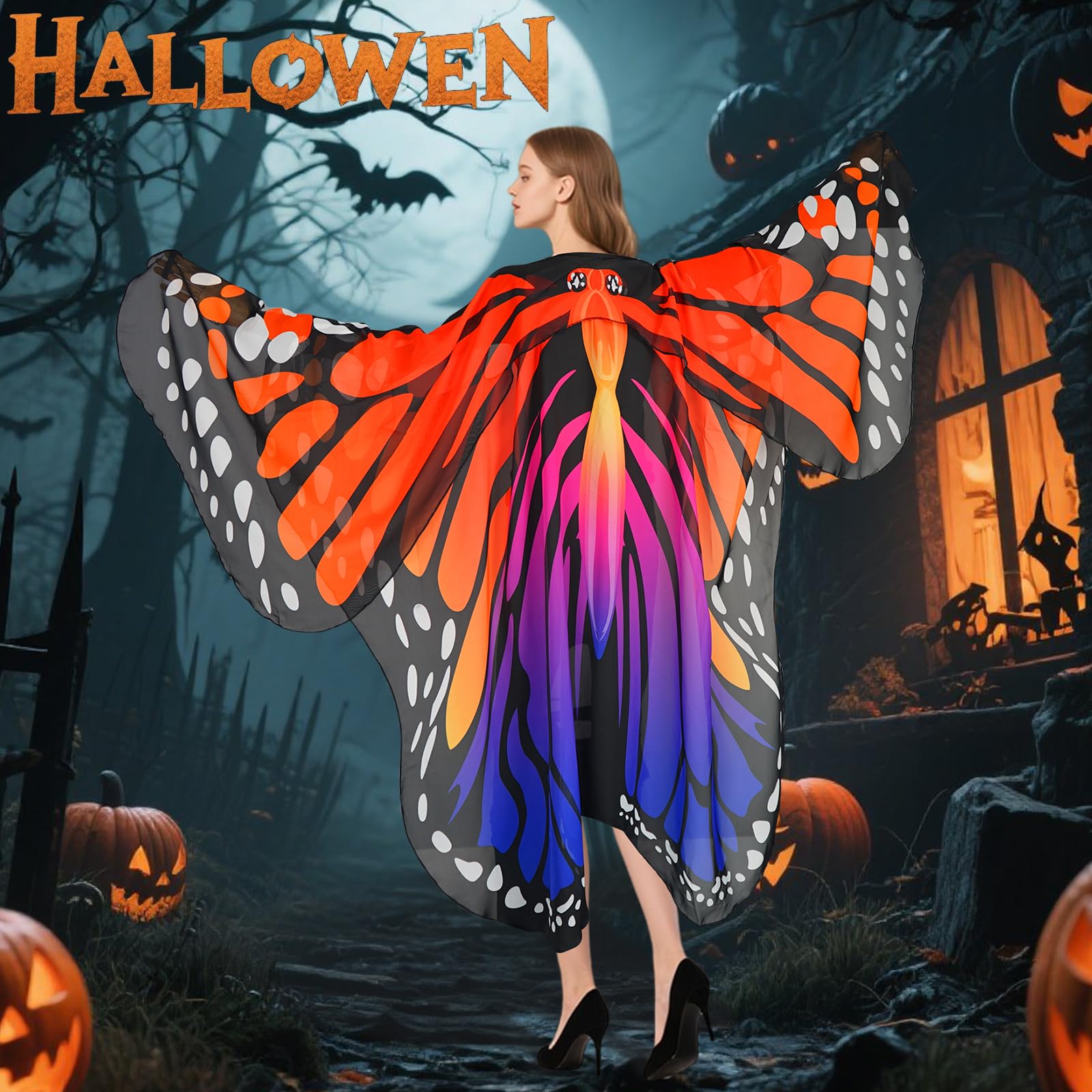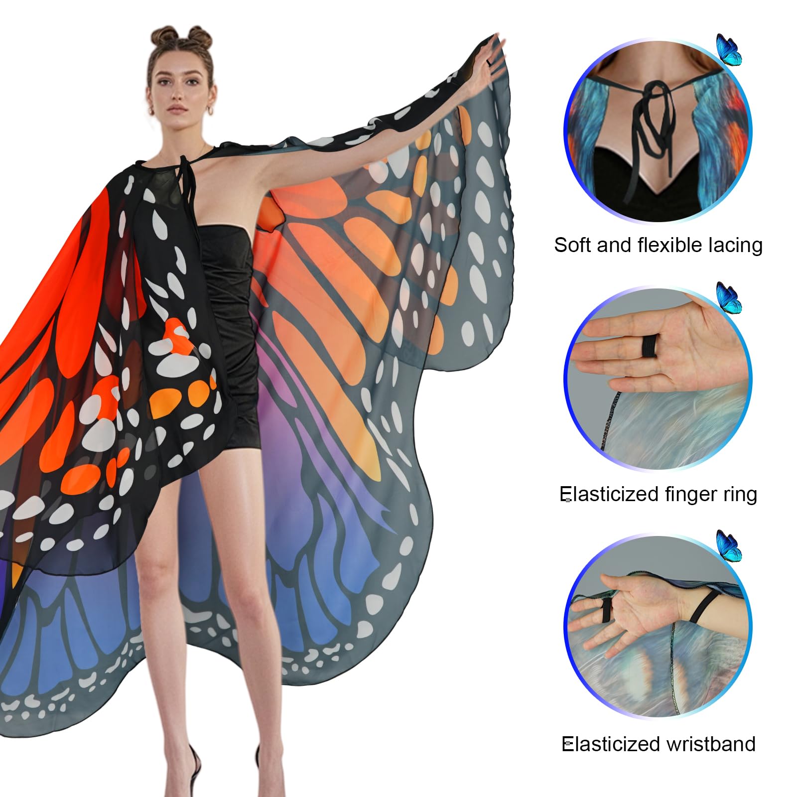 🦋Elegant Butterfly/Mothman Costume-The adult women's butterfly/moth wings cape is designed with a double-layer styling in a soft and airy fabric,which delivers a lifelike fluttering effect.The womens halloween butterfly costumes add adjustable ties at the neck,the bottom wings and body are like a cape/vest with arm holes,which can then be tied in the front or left untied .Both layers of wings have elasticized finger loops at the top to attach fingers,perfect for creative crossdressing.