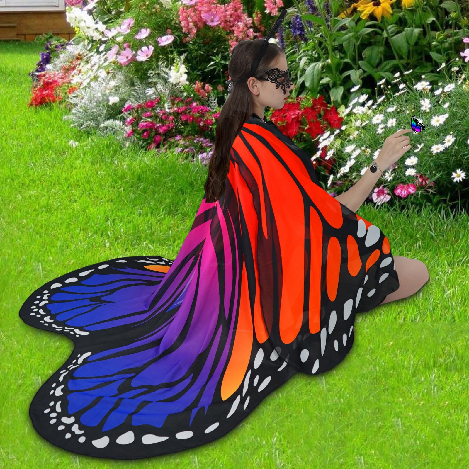 🦋 Complete Butterfly Costume Set for Adults – This stunning butterfly costume for women includes a two-layer chiffon wings cape (198x140 cm/78x55 inches), a delicate lace mask, and a antenna hairband. The adjustable neck drawstring and finger loops ensure a secure, comfortable fit, making it ideal for adult Halloween costumes for women and cosplay events.