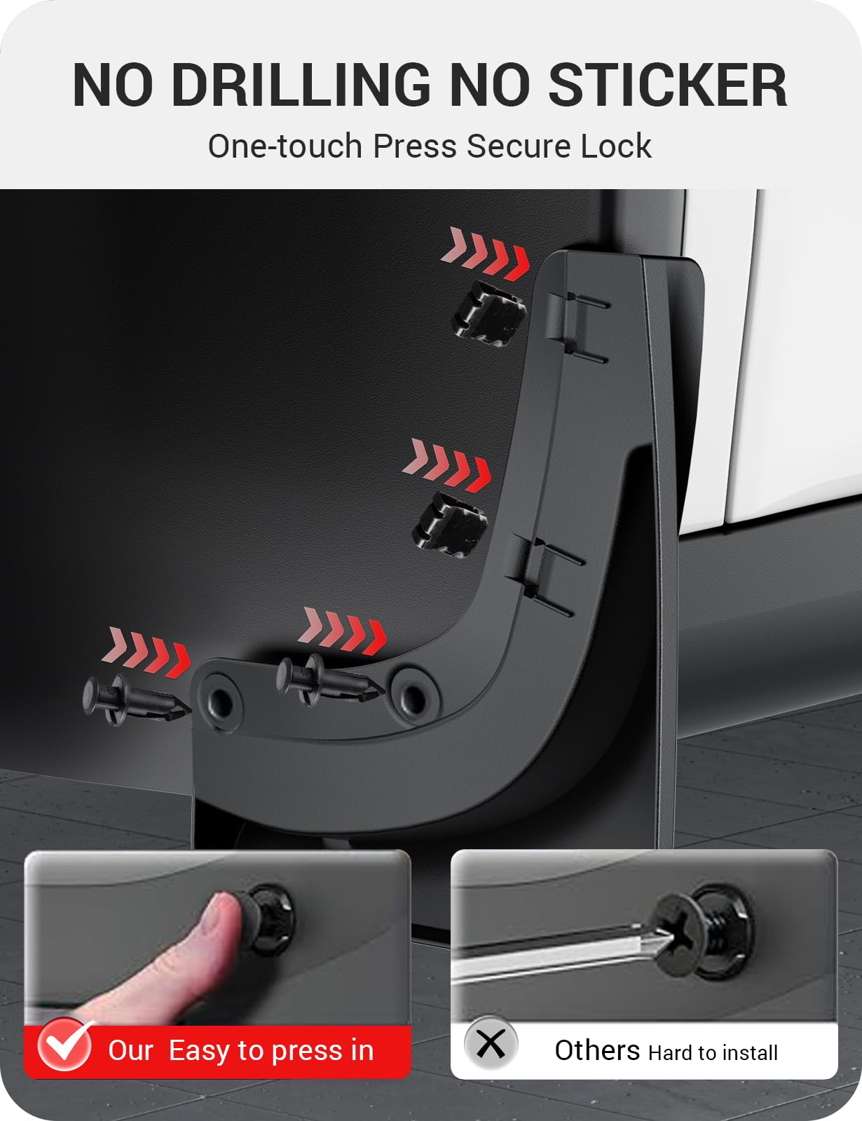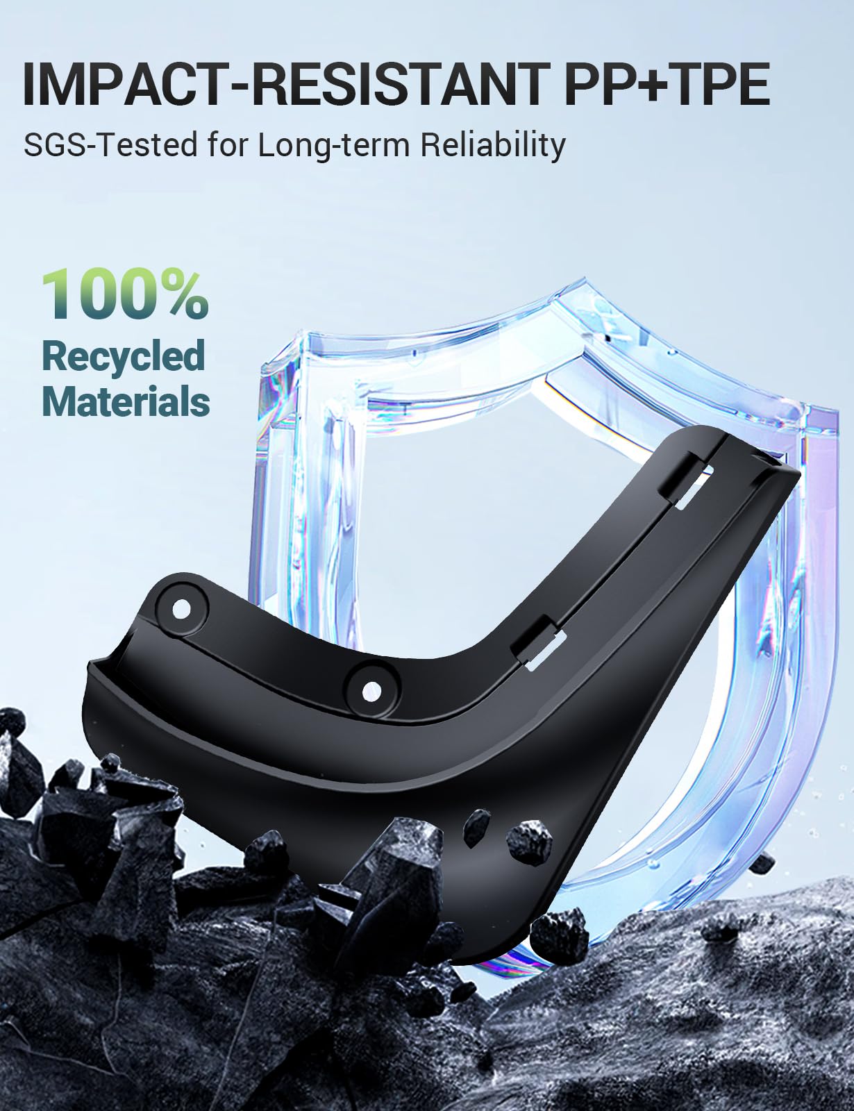 Eco-Material for Lasting Durability: Made from the same PP+TPE composite used in Tesla’s factory parts, the 2026 Model Y All-Weather Mud Guard delivers exceptional toughness and durability—up to 500% more robust. It is designed to withstand extreme weather and road conditions. Even if it is accidentally hit, it will not be damaged. It offers long-term protection without compromising Tesla’s sleek aesthetic