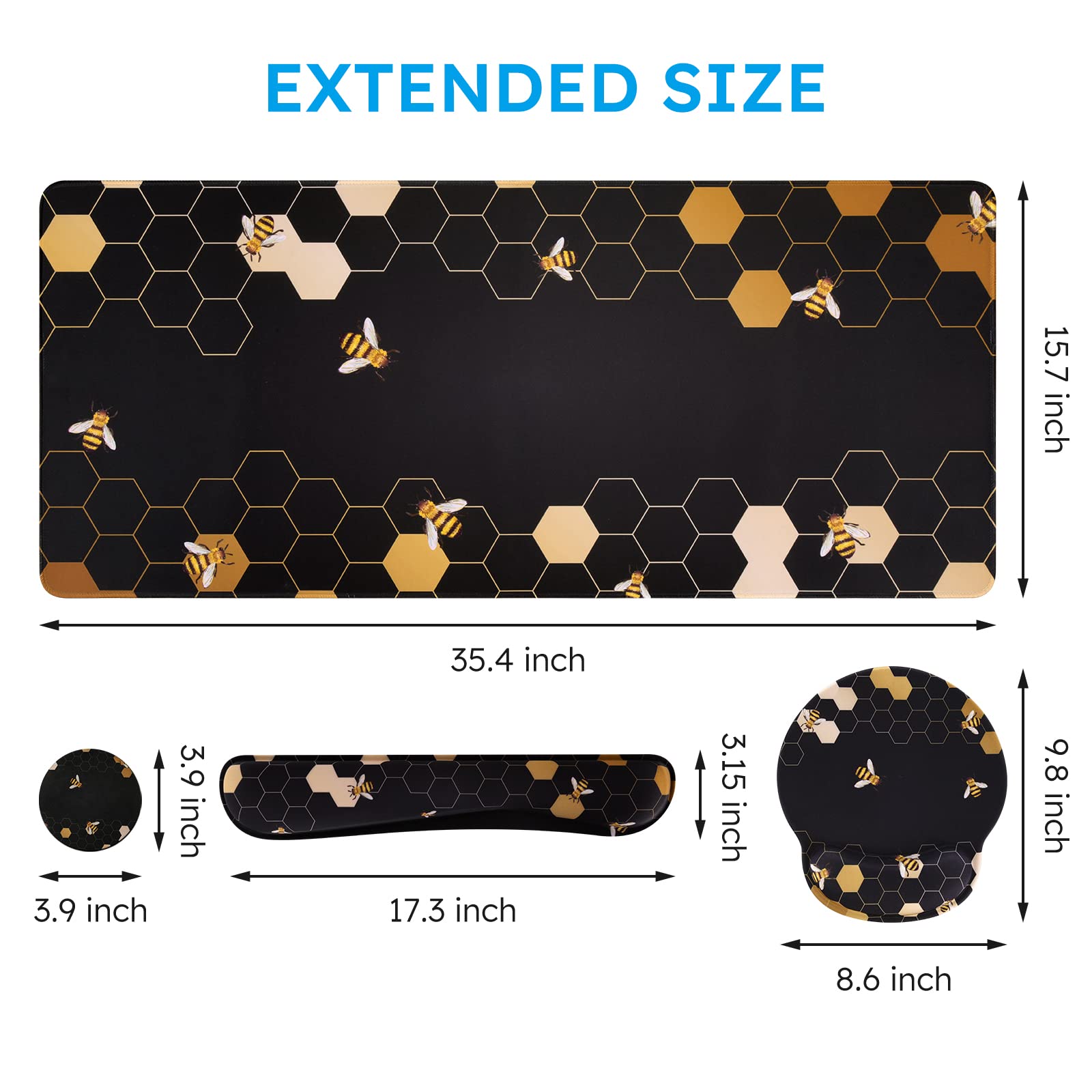 Large Mouse Pad Size: Extended mouse pad:35.4" x 15.7",wrist rest for computer keyboard:17.32" x 3.15" x 0.98",wrist rest for mouse:8.66" x 9.84" x 0.86",Coaster:3.93" x 3.93"