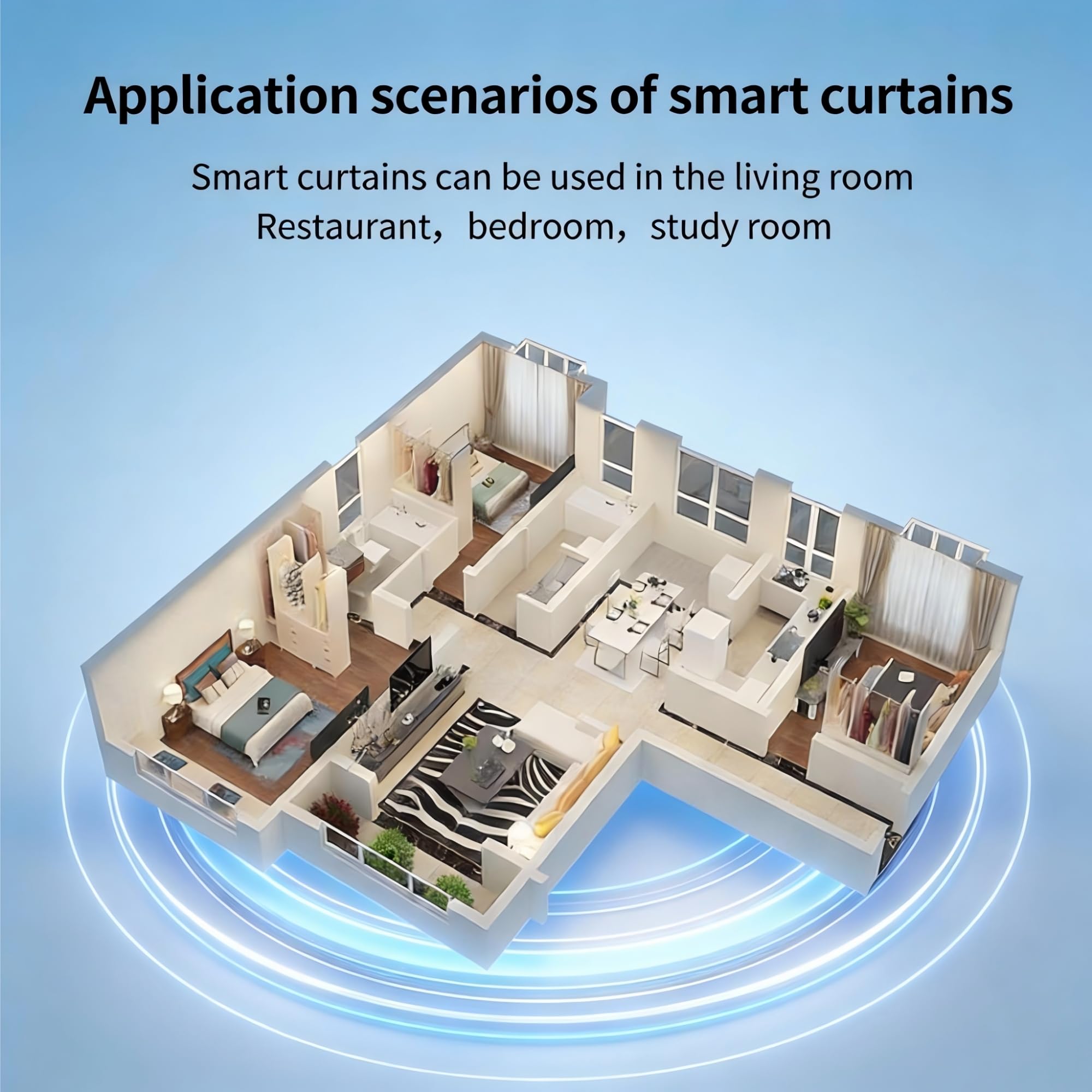 [Voice Control & Intelligent whole house solution] Speech scenarios with a single word. For example, you can say: 'siri, open the curtains to 50%'. Whole house smart curtains can be controlled all by one remote control, saving your effort, for example, you can say: 'siri, close the living room curtains' to close the living room curtains; at the same time you can say: 'siri,close the master bedroom curtains' to close the Master bedroom curtains.