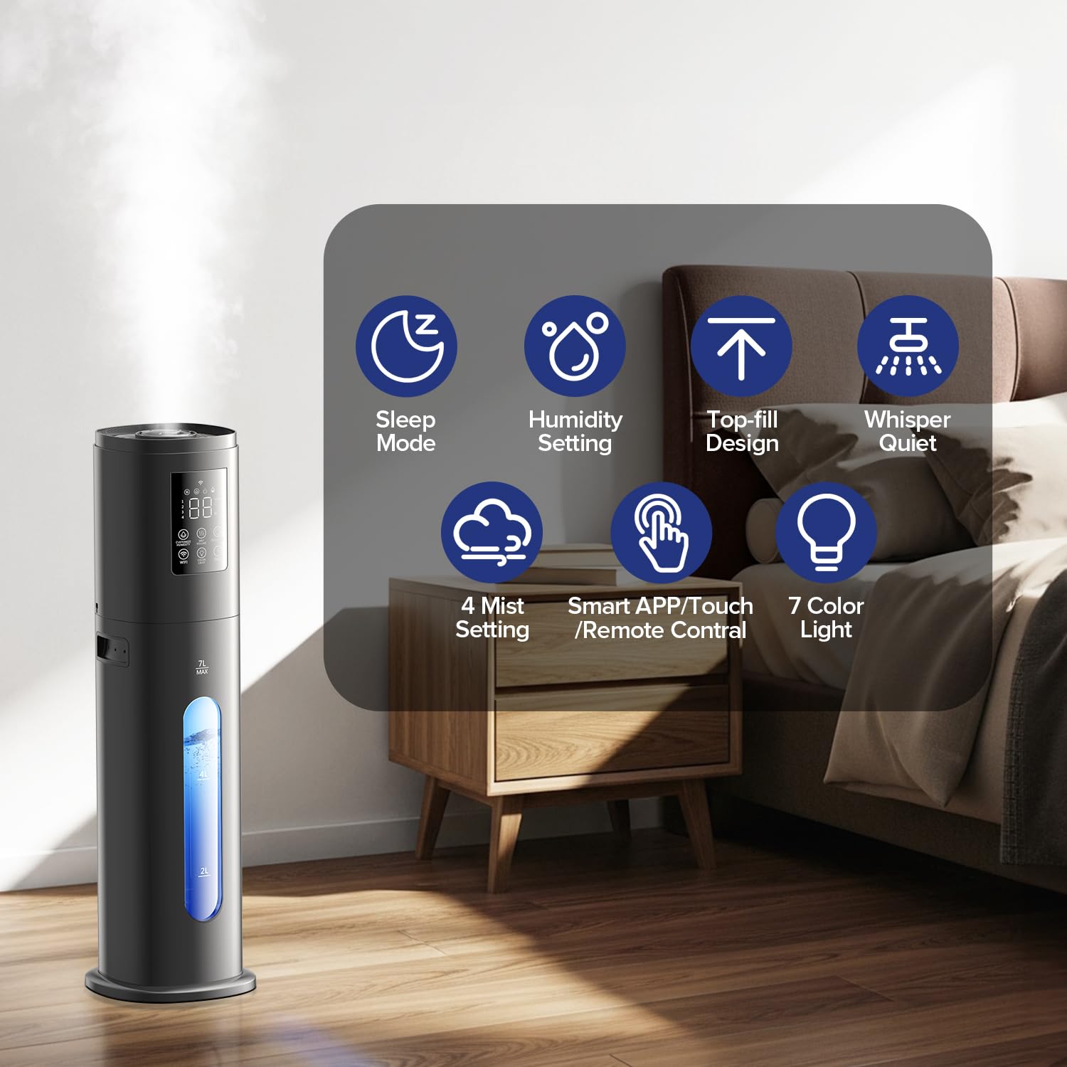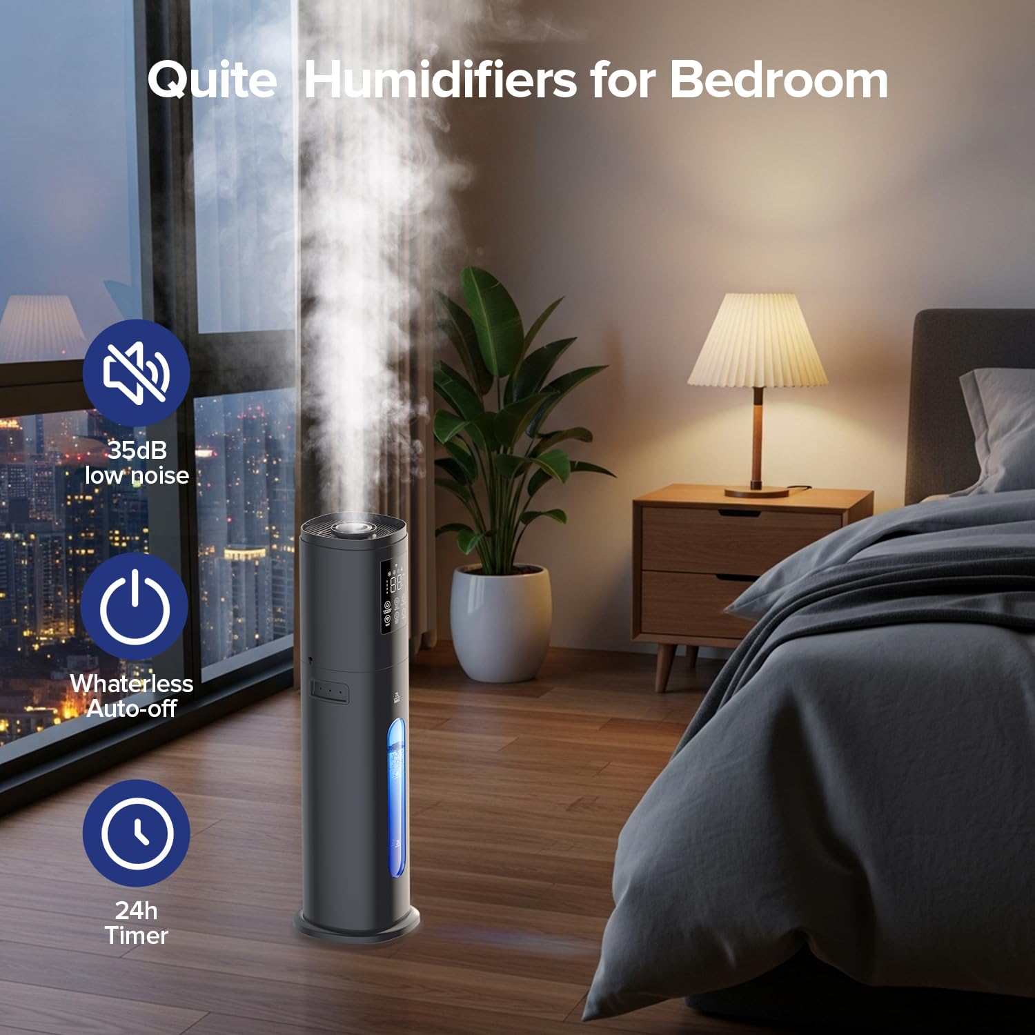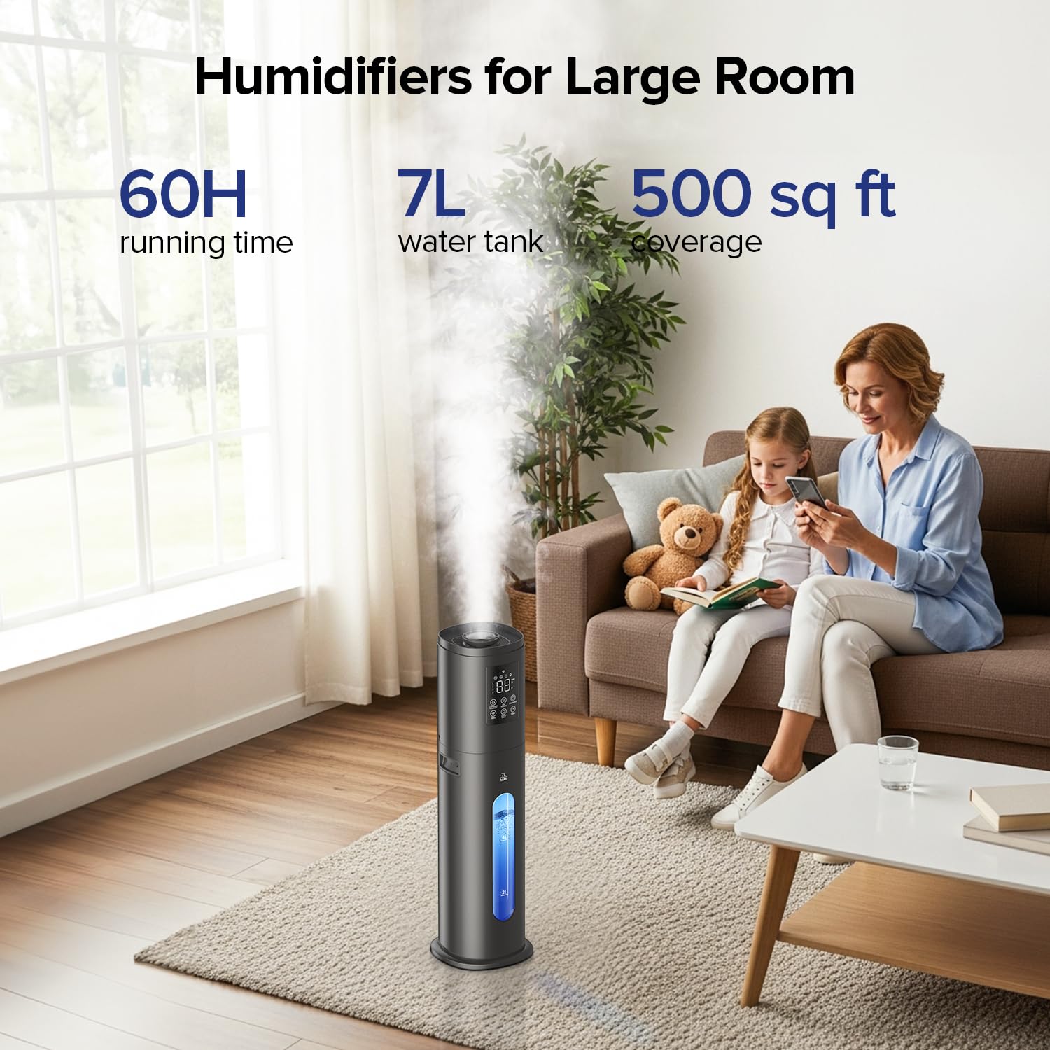 【Humidifier Large Room & Top Filling Design】: The cool mist humidifiers for bedroom with 7L removable large capacity , top-filling anti-leakage design improves the leakage problem and easy to refill,continuously up to 60 hours on a single refill needn't filling water frequently.350mL/h high moisture output is designed to humidify the air for cover up to 500 sq.ft ,better relieve air and skin dryness. Best whole house humidifiers for home, dorm and living room.